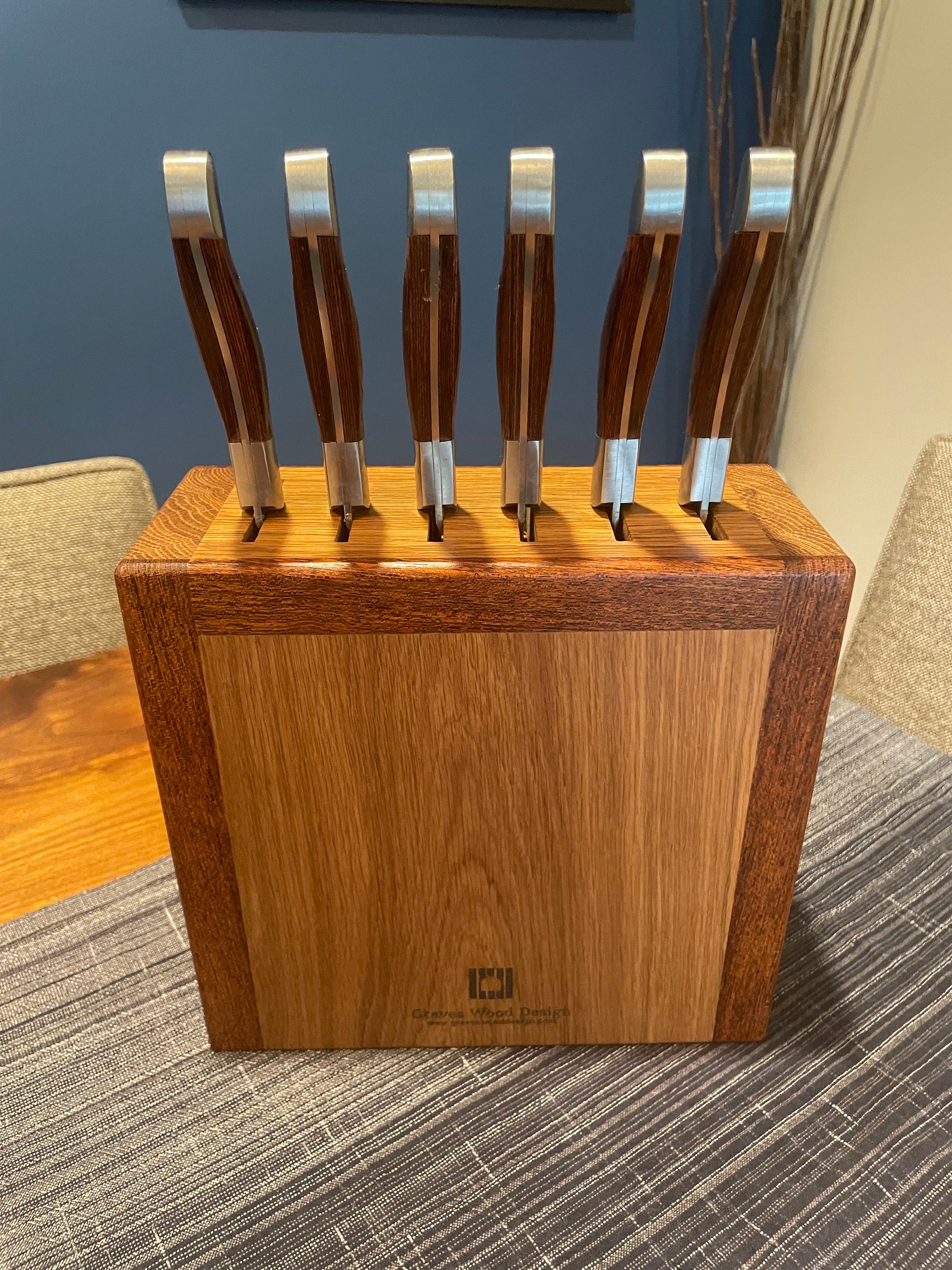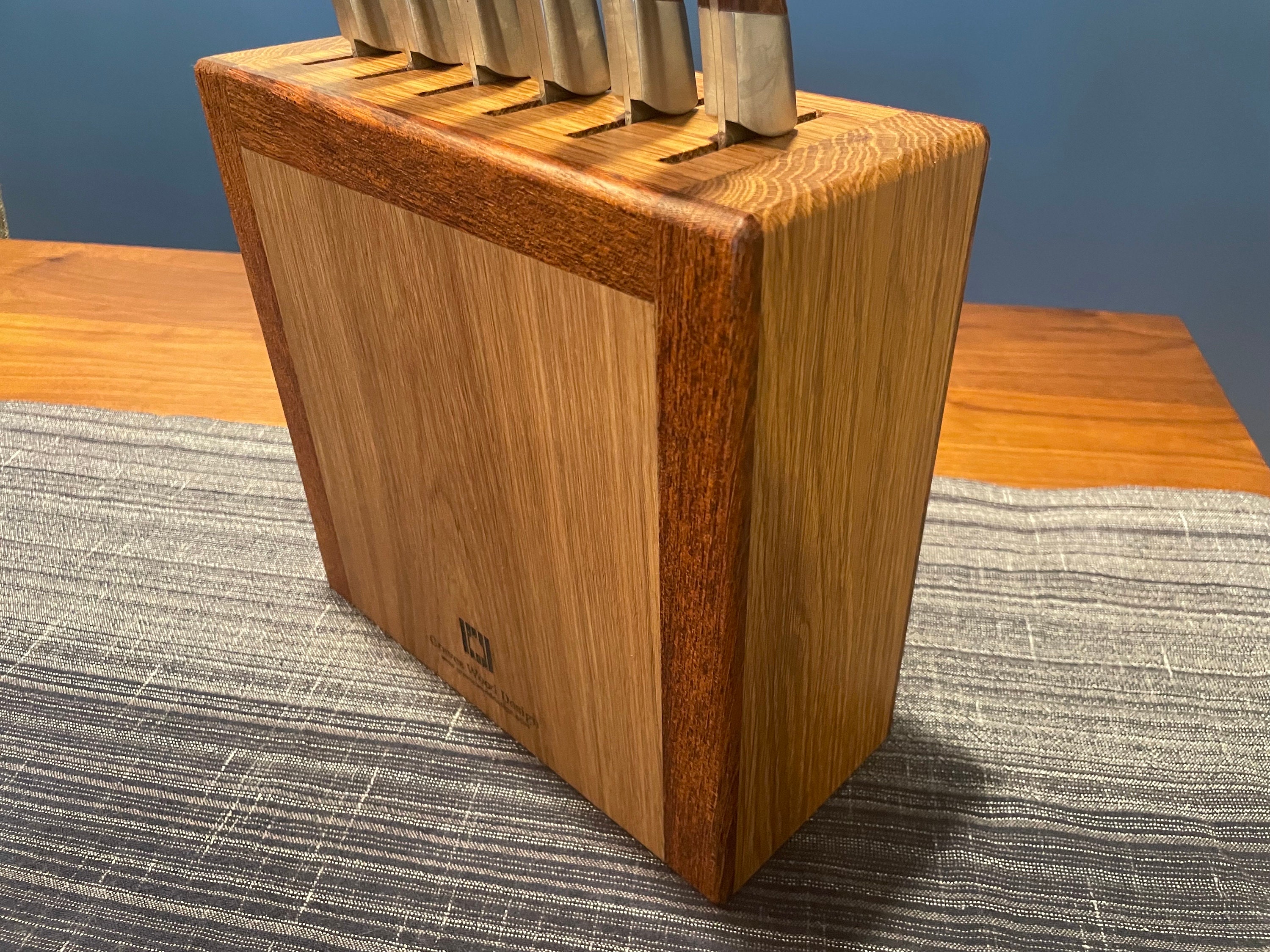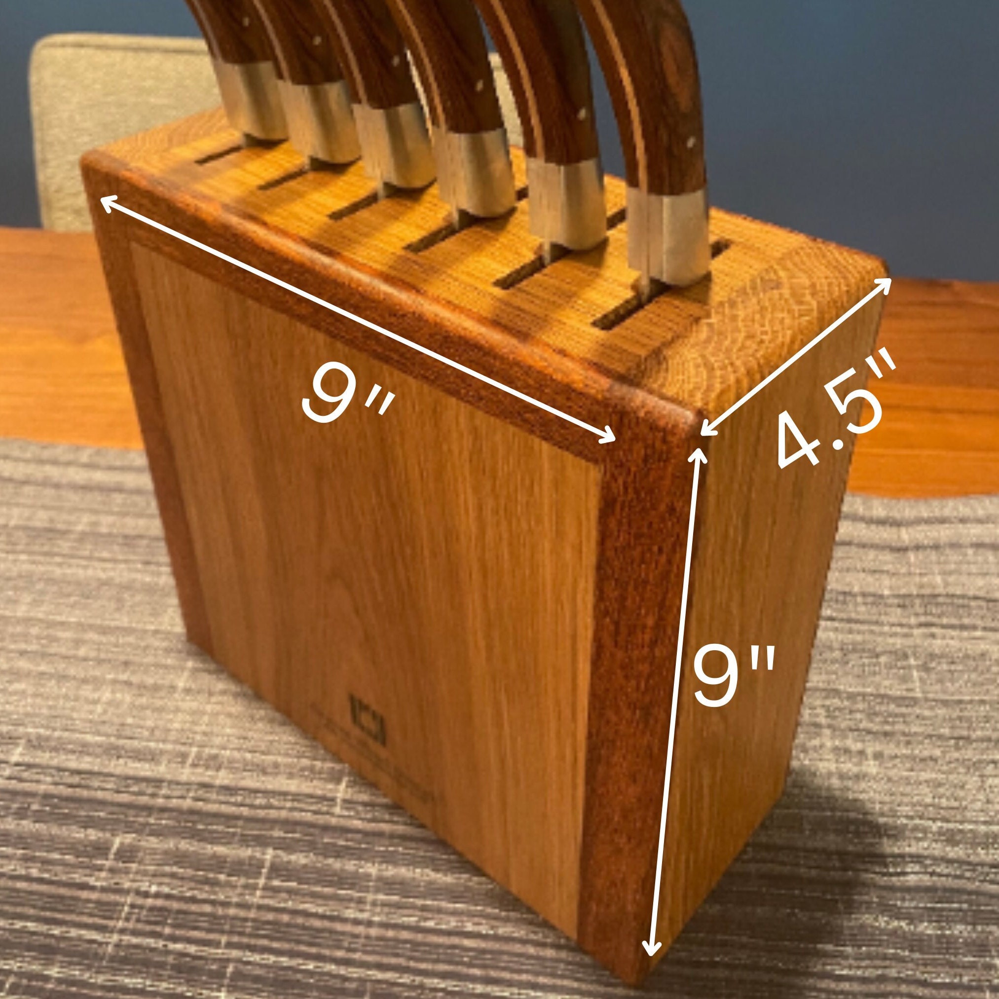 Give your knives a proper home with this handcrafted knife block. Made from White Oak and Brazilian Cherry hardwoods. Holds up to 6 knives. Personalized engraving is available at no additional charge if you would like to make your piece truly unique. (see design option pictures). If knives had feelings, they would appreciate you giving them a functional and stylish place to be on display. The block measures 9 inches tall, 9 inches wide, and 4.5 inches deep. Knife slots are 2.25" long by 1/4" wide, capable of accommodating even very large knives.
