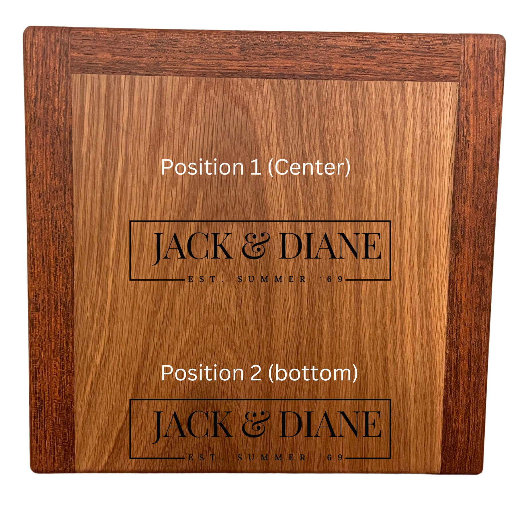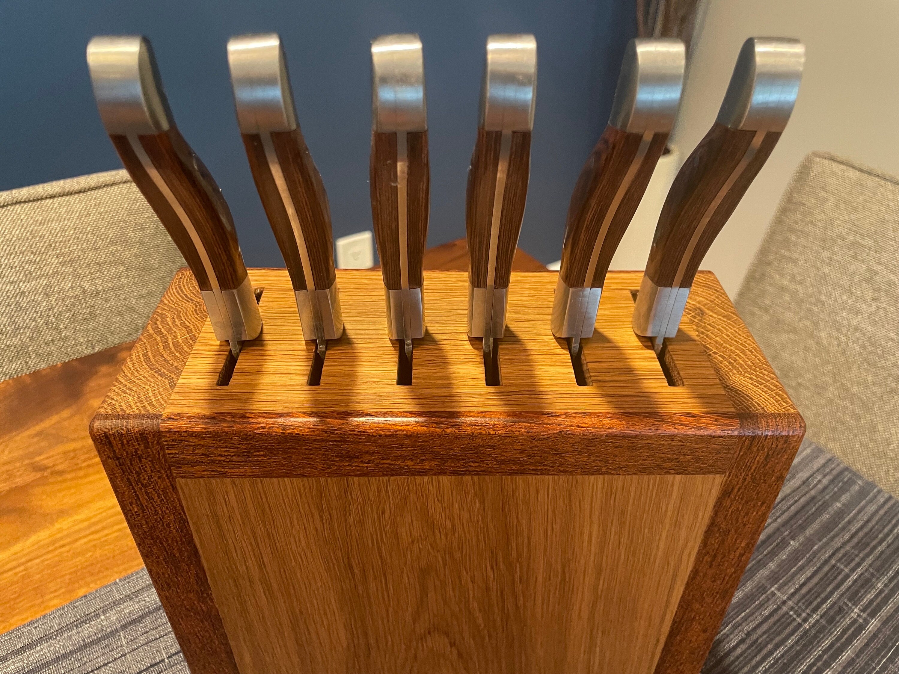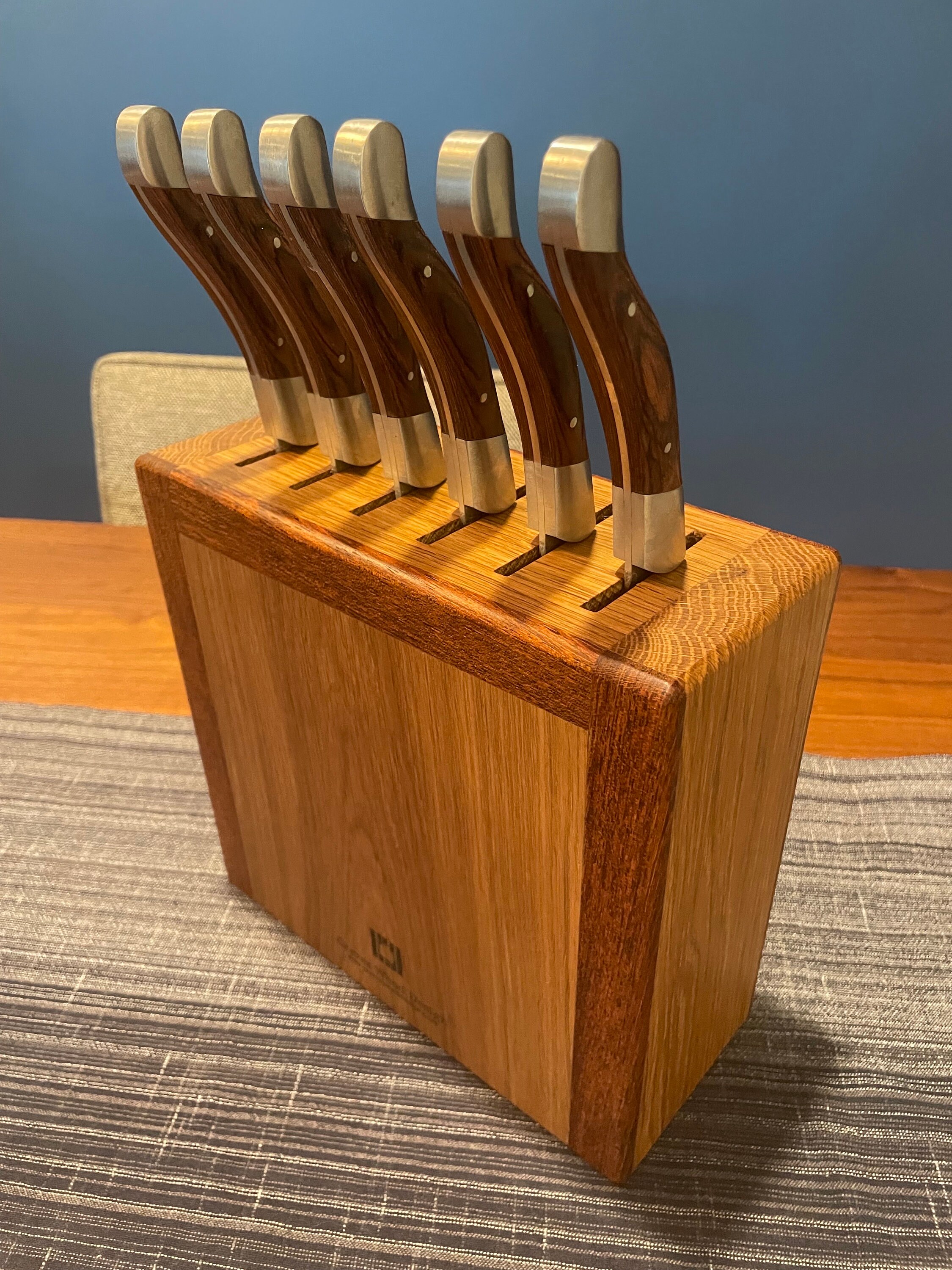 Give your knives a proper home with this handcrafted knife block. Made from White Oak and Brazilian Cherry hardwoods. Holds up to 6 knives. Personalized engraving is available at no additional charge if you would like to make your piece truly unique. (see design option pictures). If knives had feelings, they would appreciate you giving them a functional and stylish place to be on display. The block measures 9 inches tall, 9 inches wide, and 4.5 inches deep. Knife slots are 2.25" long by 1/4" wide, capable of accommodating even very large knives.