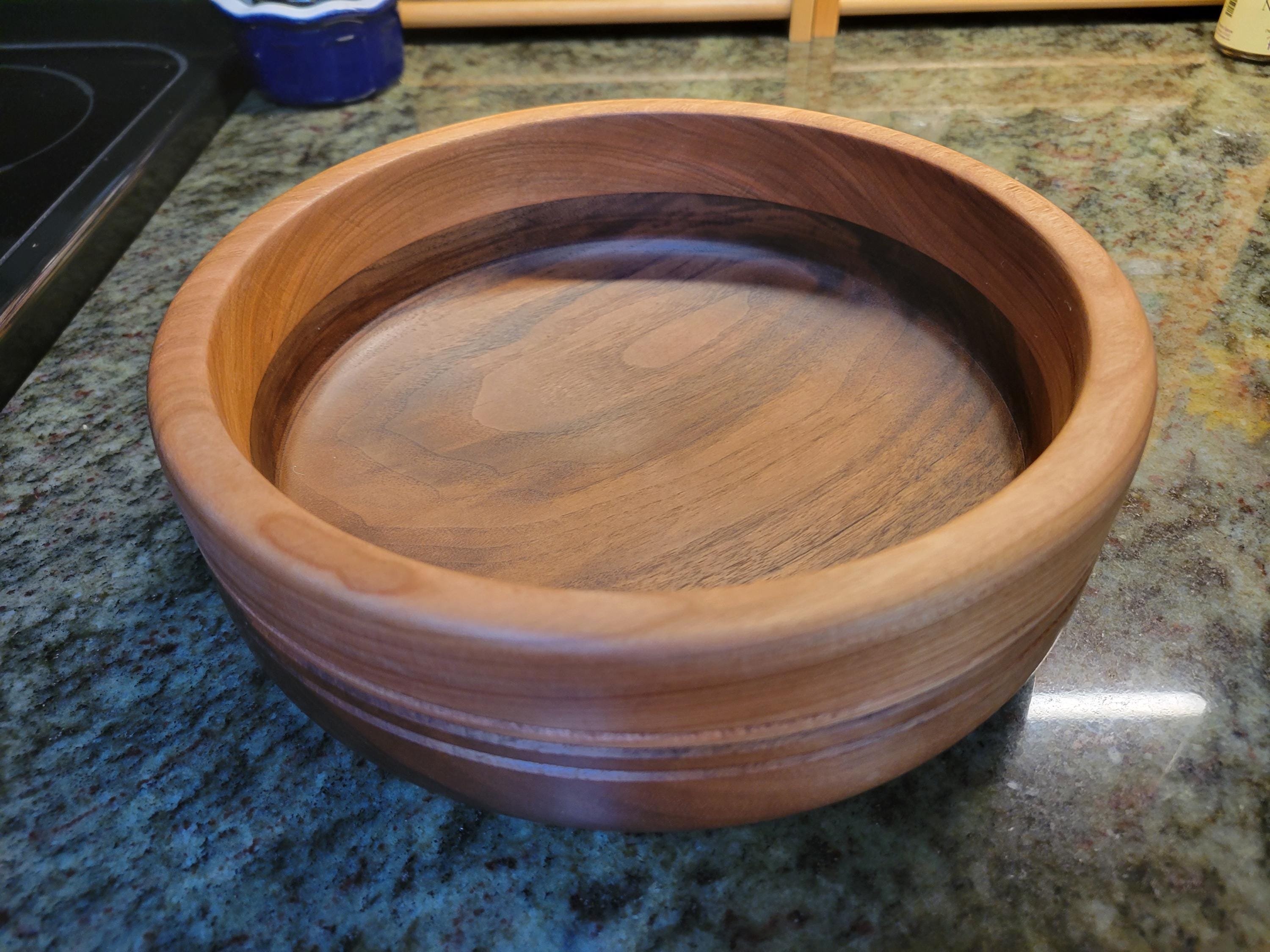 Enhance the look and feel of your living space with this exquisite handcrafted wooden bowl, meticulously hand turned from premium walnut and cherry hardwoods. Ideal for adding elegance to your dining area, showcasing on shelves, or adorning your kitchen counter, this stunning bowl is expertly finished with a food safe mineral oil and beeswax coating for a gorgeous, protective sheen. Elevate your home decor with this unique and versatile wooden bowl that exudes natural beauty and craftsmanship.