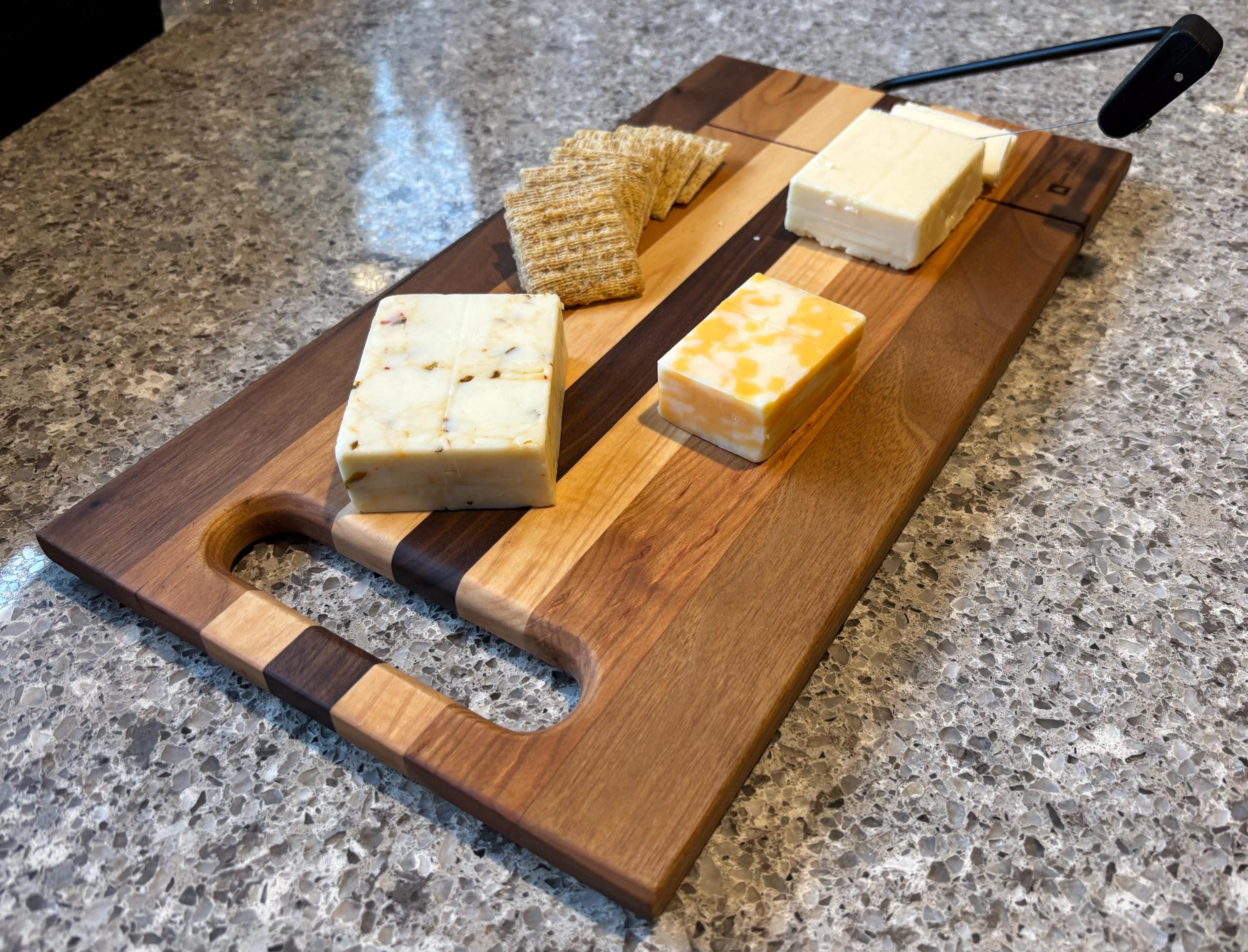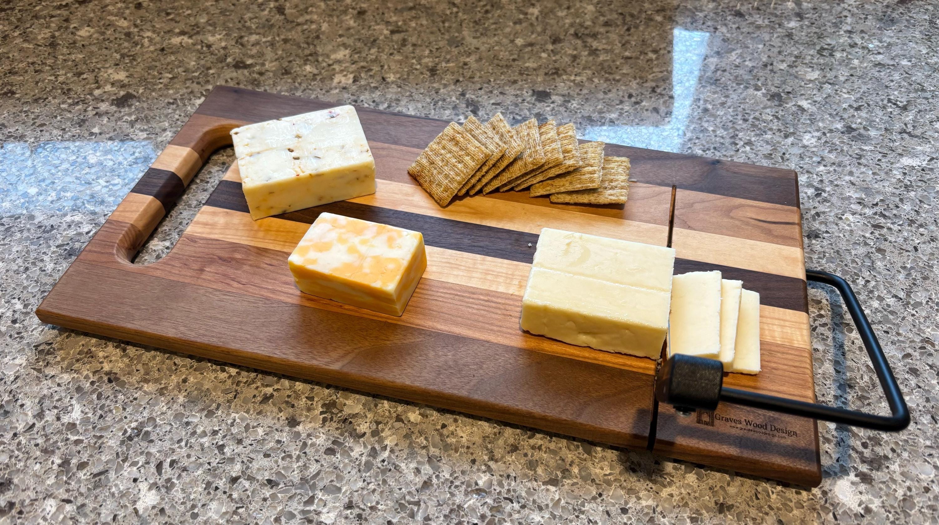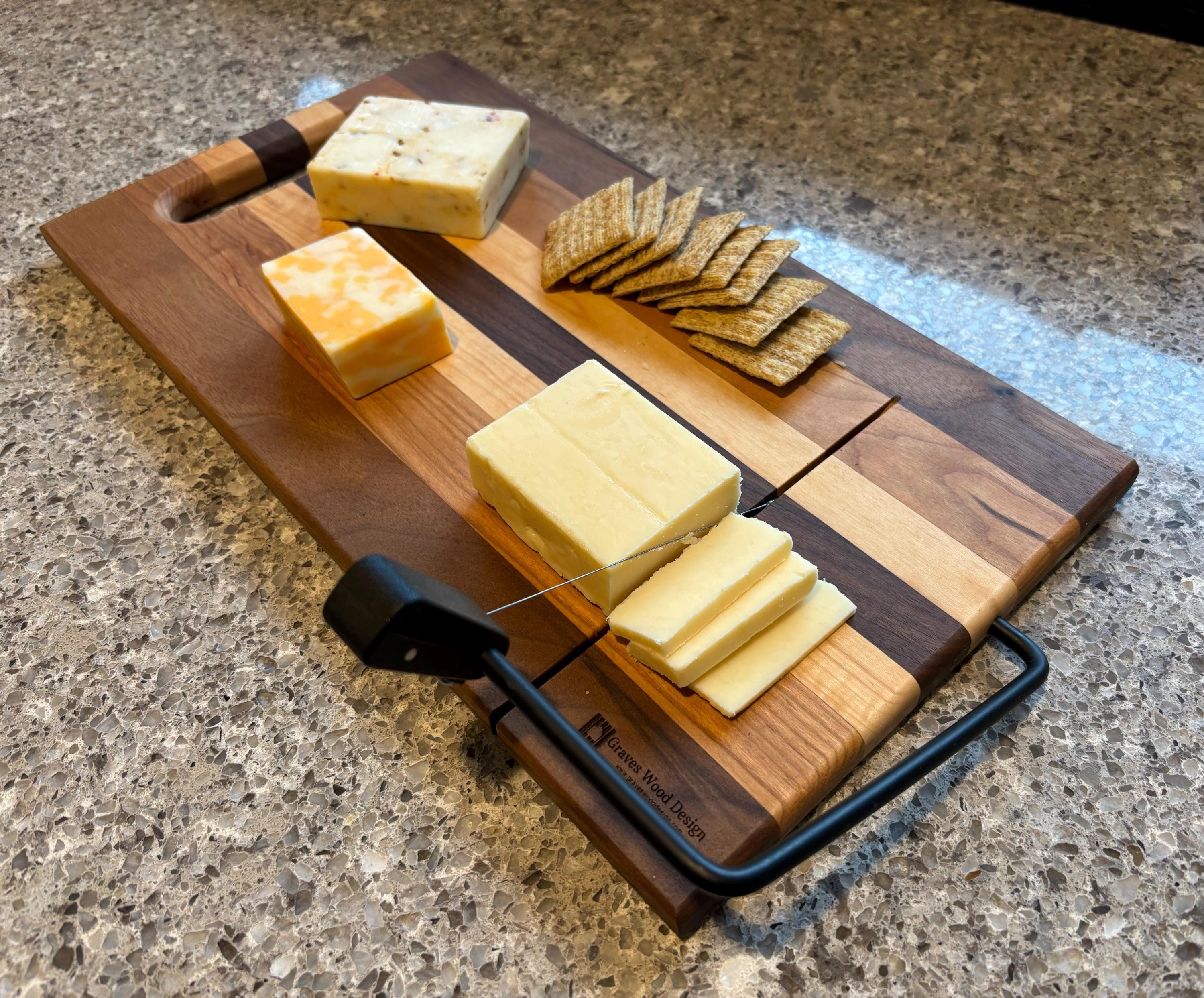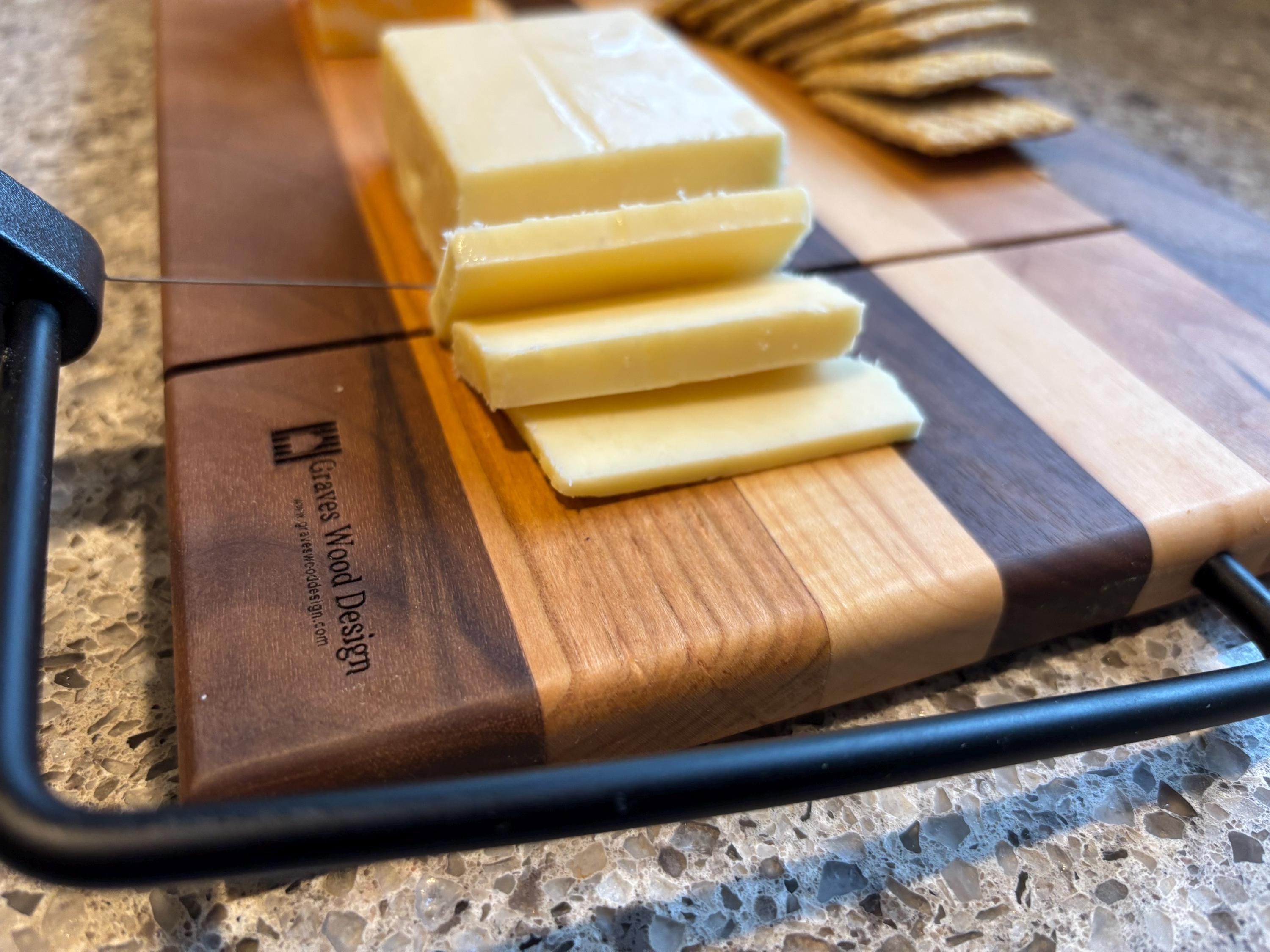 Beautifully crafted, our handmade wood cheese slicer and large serving board is a stunning addition to your culinary collection. Made from beautifully rich walnut, cherry, and maple hardwoods and featuring a handle cutout for easy serving, this cheese slicer board is not only functional but also a work of art. You'll love how large this board is, allowing you to not only slice cheese, but also serve with all the accompaniments. Featuring a stainless steel cutting wire, this slicer effortlessly cuts through your favorite cheeses, making it ideal for both everyday use and special occasions. Each board includes a tin of conditioning wax to protect and refresh, ensuring years of use and enjoyment.