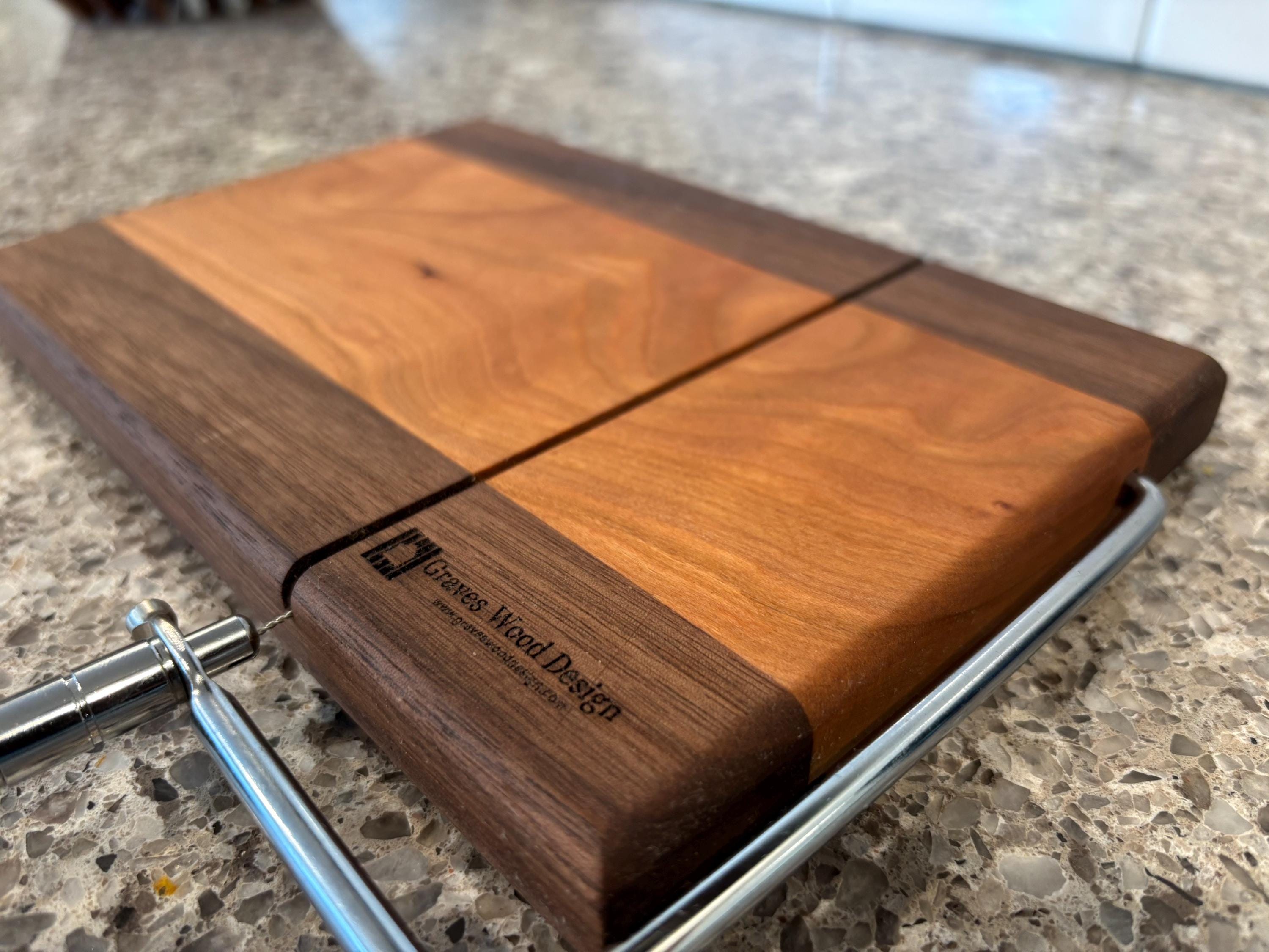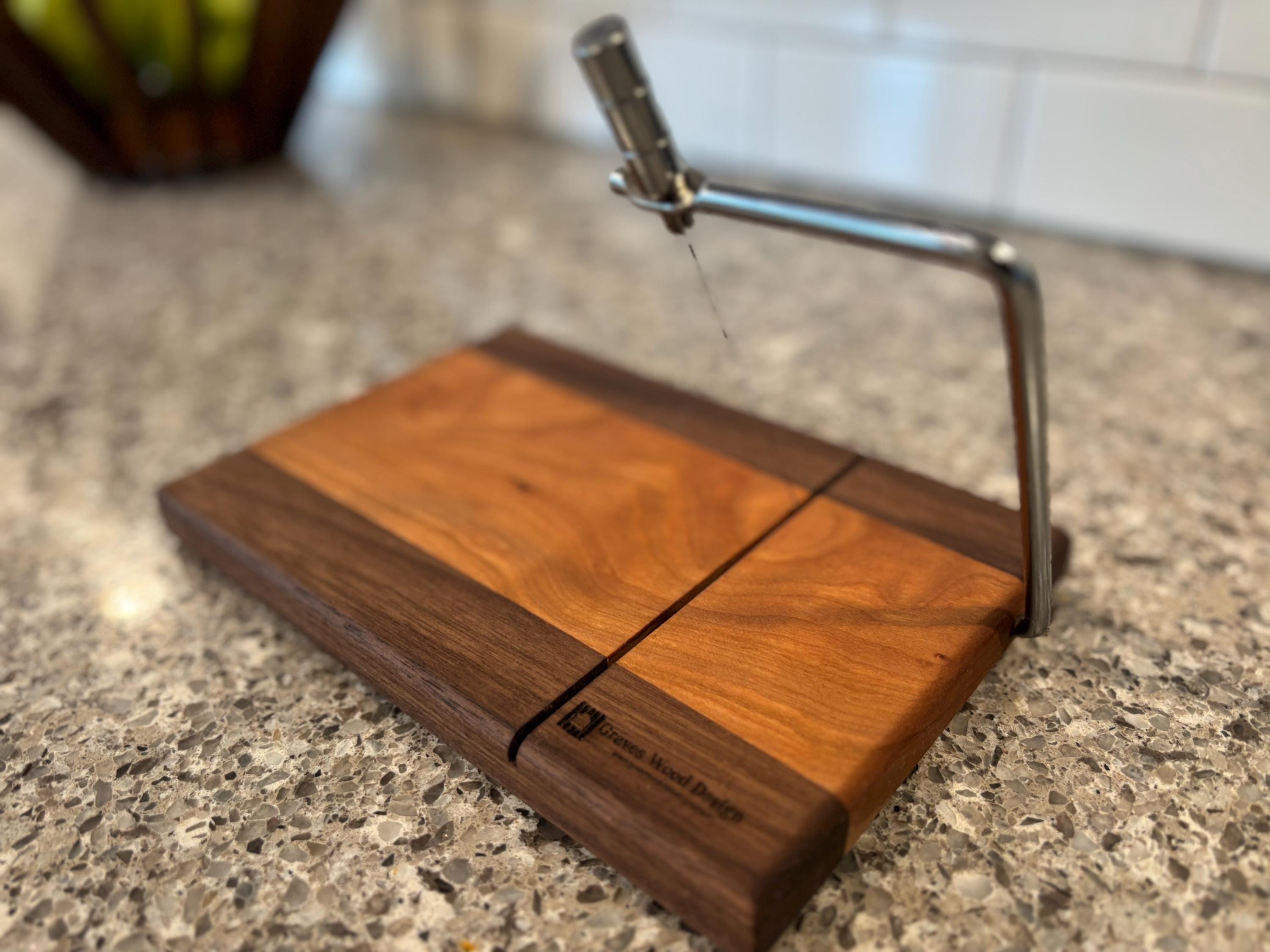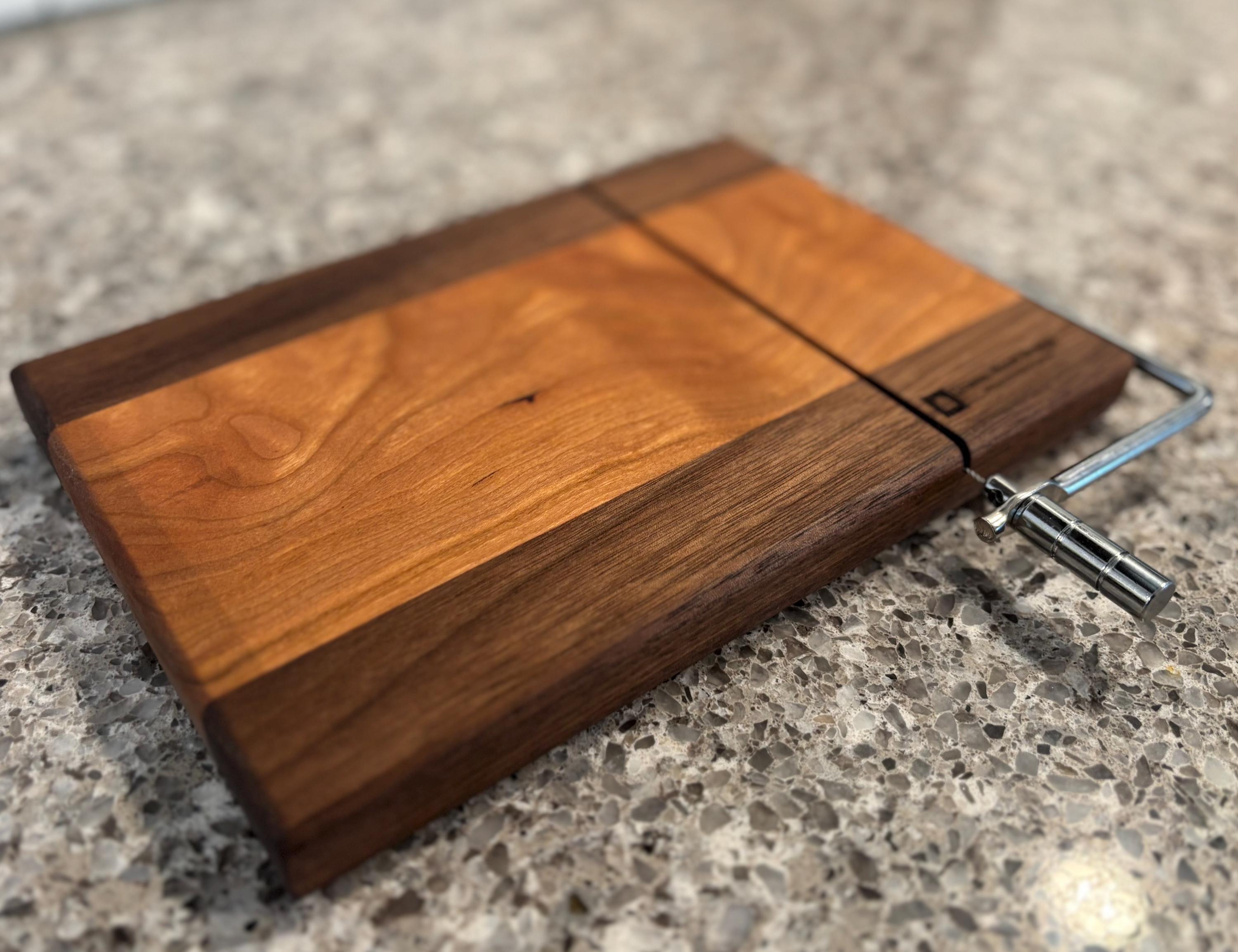 Our handcrafted wood cheese slicer is a beautiful addition to your kitchen. Made from beautiful walnut and rich cherry hardwoods, this cheese slicer board is not only functional but also pleasing to the eye. Featuring a stainless steel cutting wire, this slicer effortlessly cuts through your favorite cheeses, making it ideal for both everyday use and special occasions. Elevate your cheese platter presentation with this exceptional cheese slicer that seamlessly combines beauty and functionality. Each board includes a tin of conditioning wax to protect and refresh, ensuring years of use and enjoyment.
