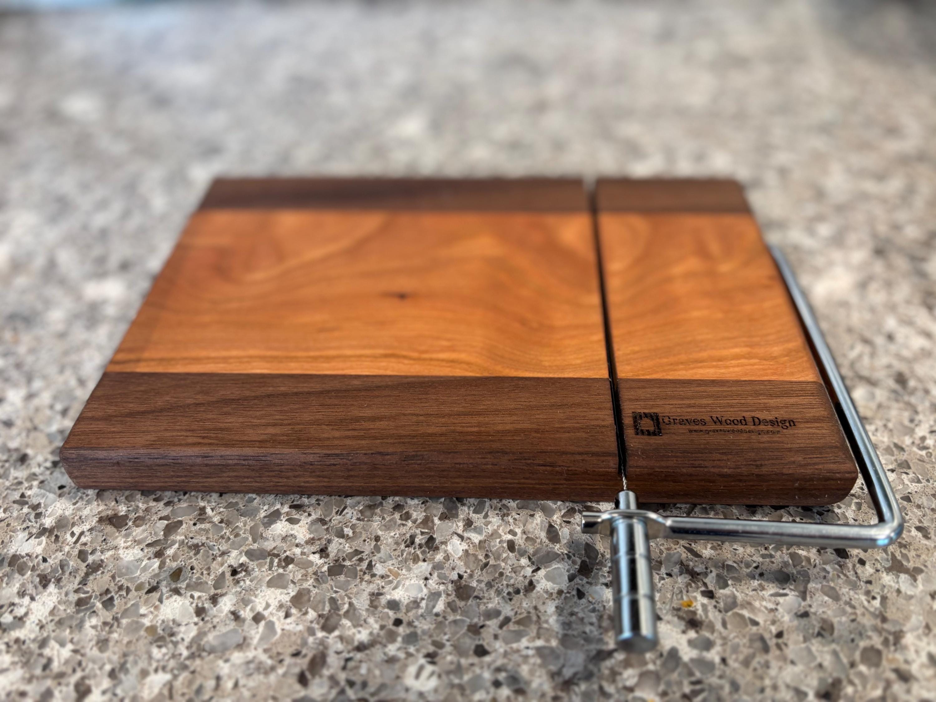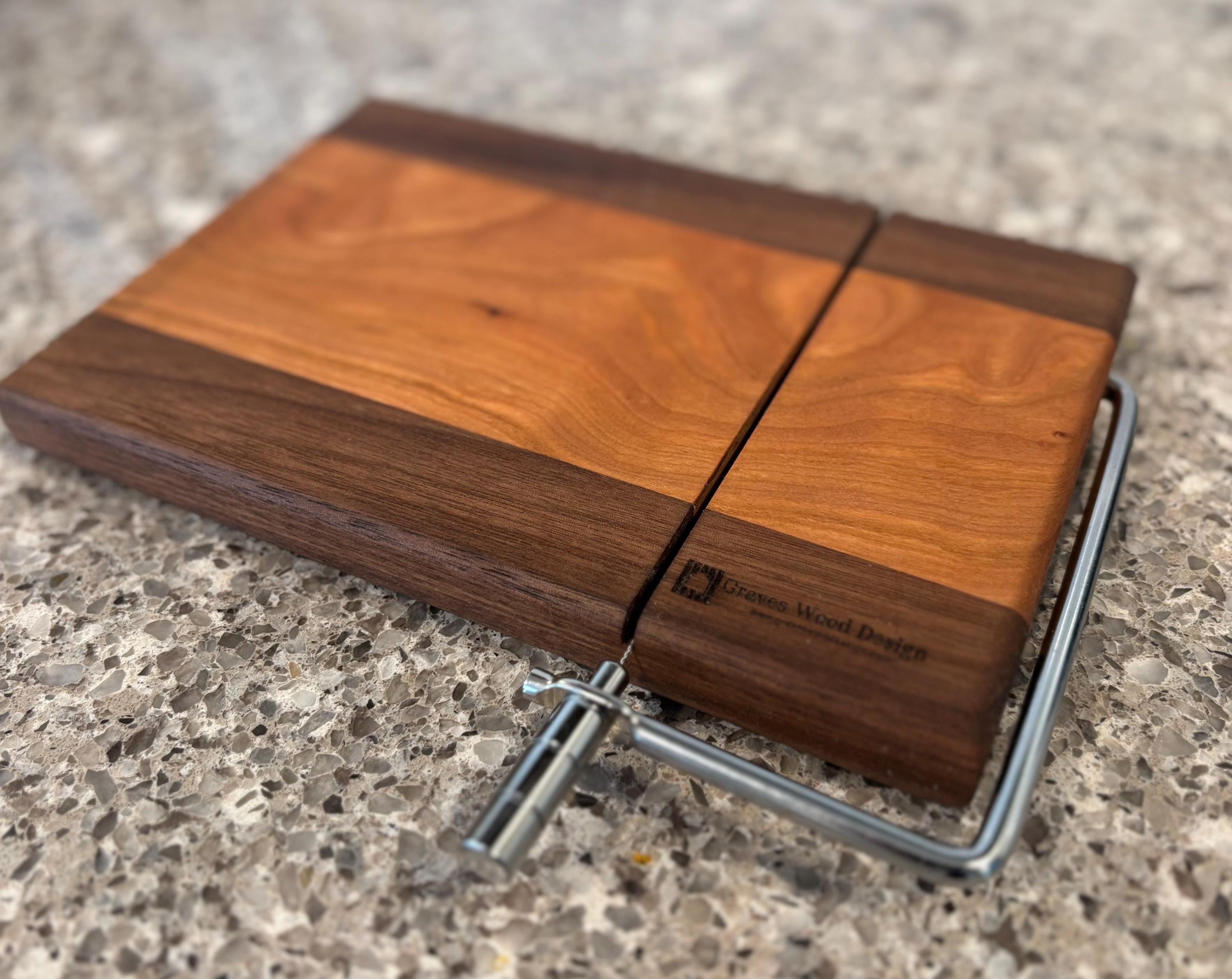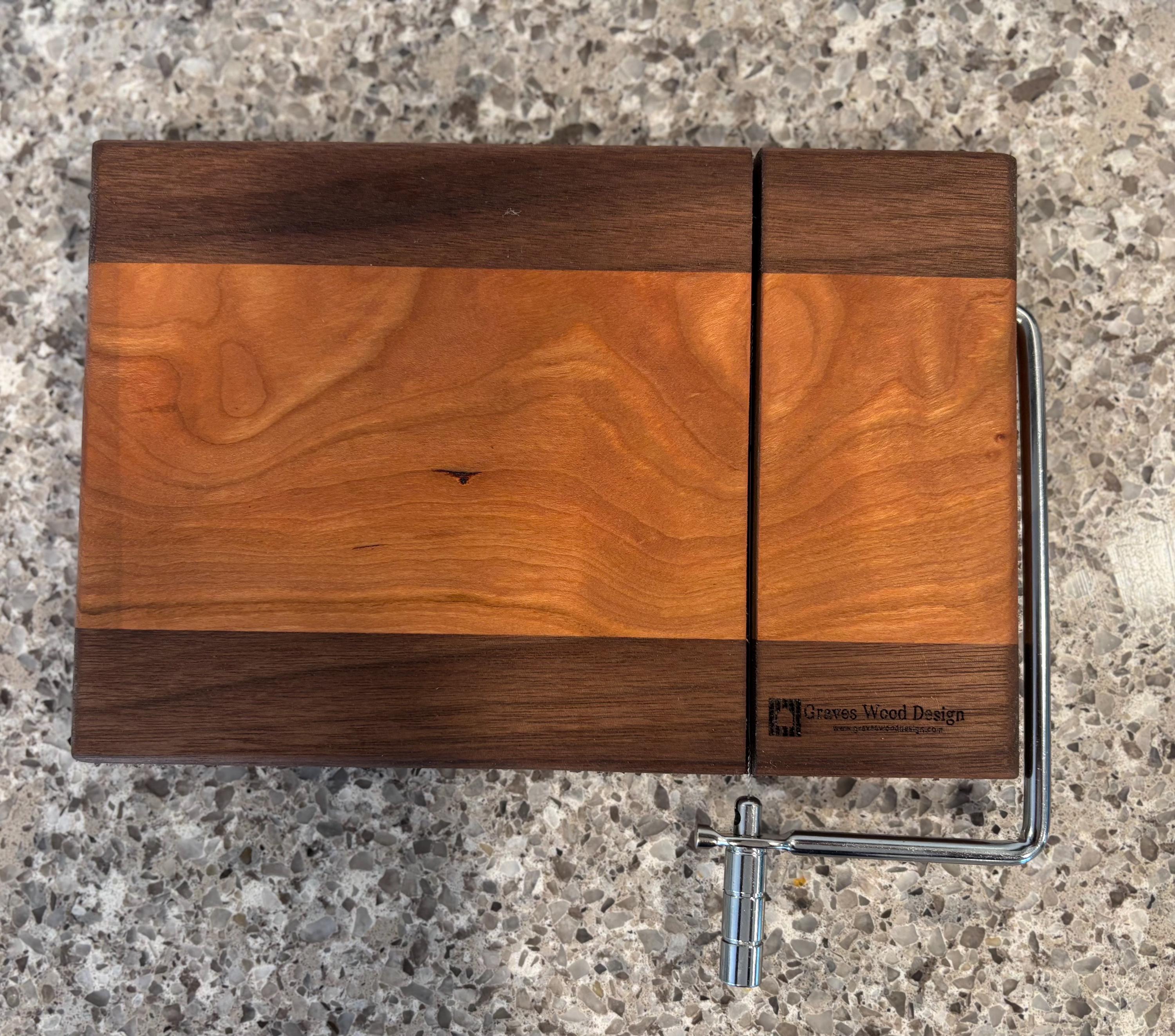 Our handcrafted wood cheese slicer is a beautiful addition to your kitchen. Made from beautiful walnut and rich cherry hardwoods, this cheese slicer board is not only functional but also pleasing to the eye. Featuring a stainless steel cutting wire, this slicer effortlessly cuts through your favorite cheeses, making it ideal for both everyday use and special occasions. Elevate your cheese platter presentation with this exceptional cheese slicer that seamlessly combines beauty and functionality. Each board includes a tin of conditioning wax to protect and refresh, ensuring years of use and enjoyment.