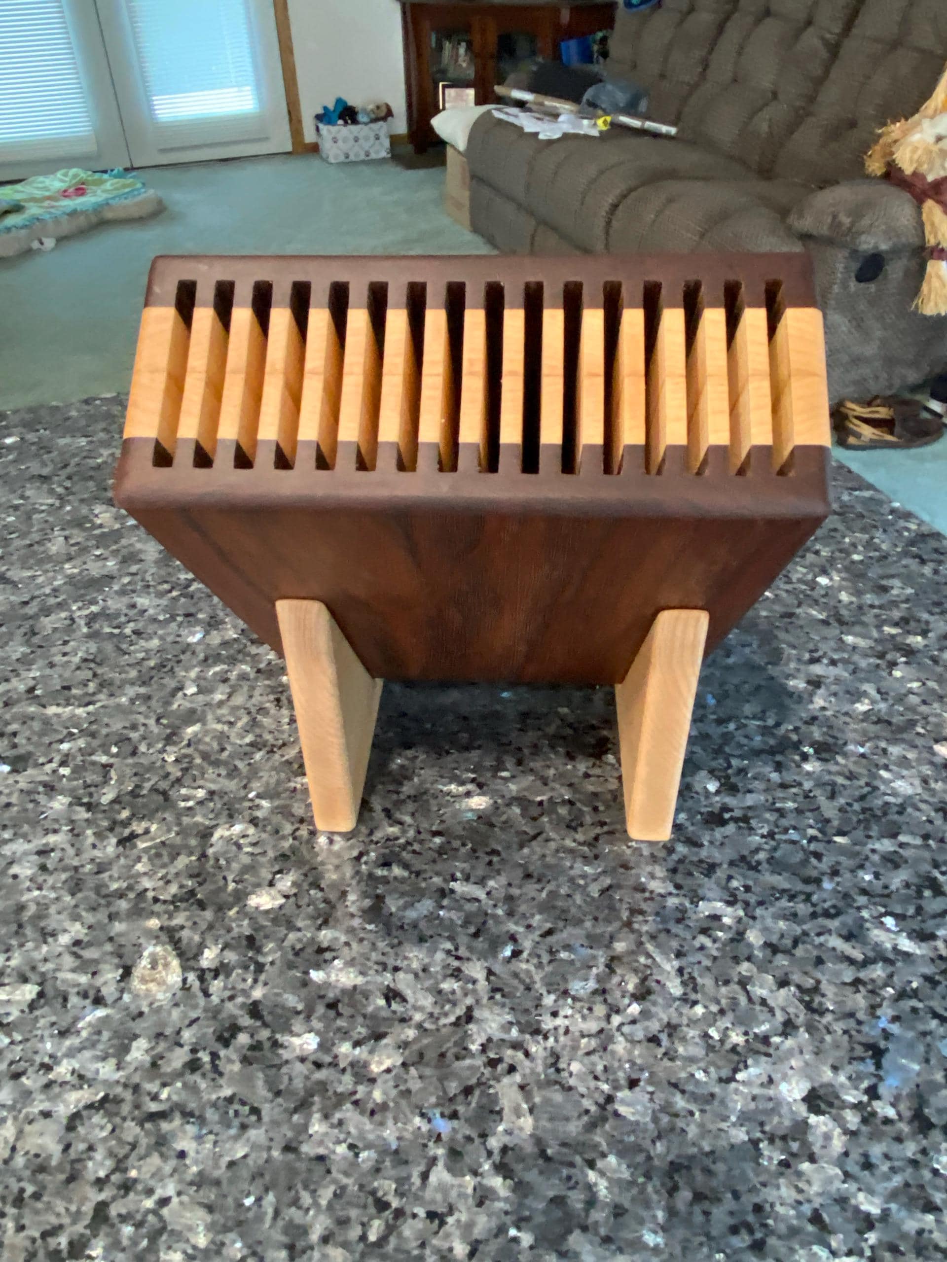 Beautiful knife block. Very well crafted. Love the varieties of different woods. Looks amazing in my new kitchen. Came quickly. Well packaged. Would order from them again.