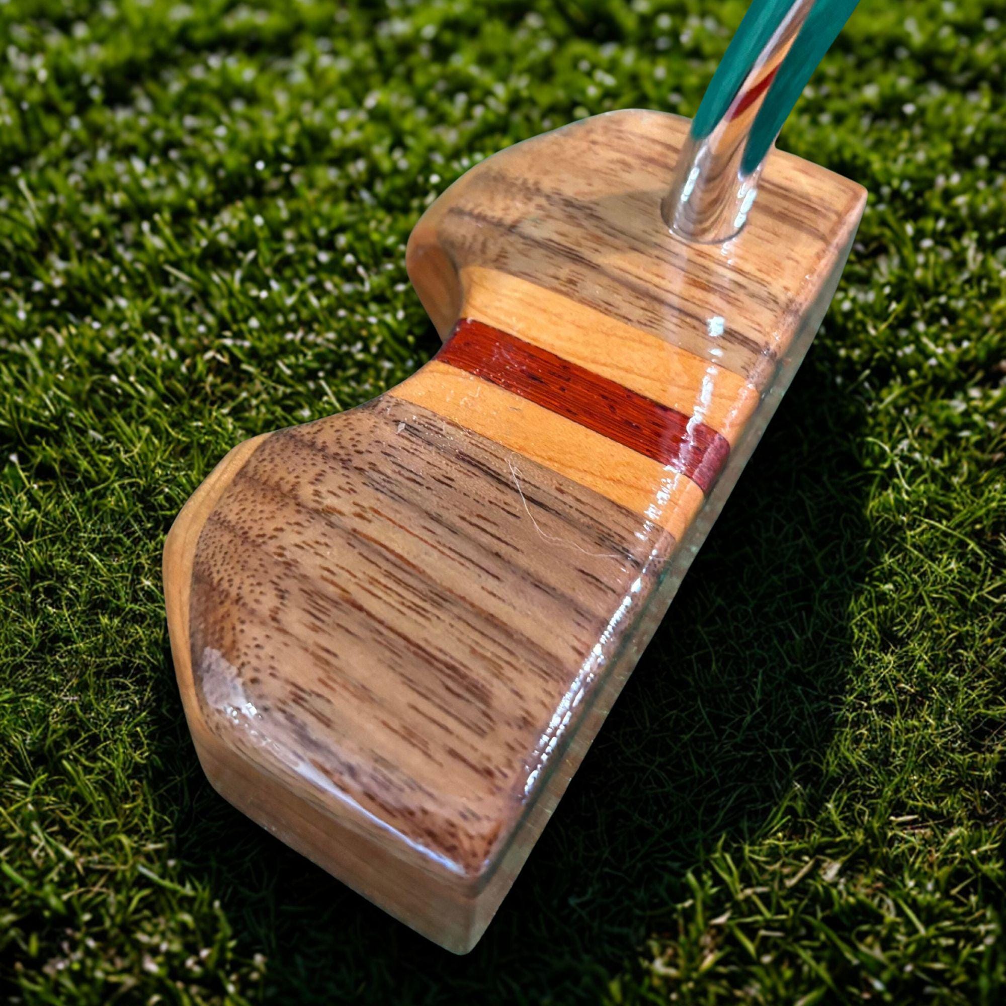 1. Unmatched Craftsmanship: Each putter head is expertly fashioned from a beautiful pairing of Walnut and Cherry wood, celebrated for their warm, rich natural colors. Each piece is accented with cherry stripes and a Red Padauk wood center guide line, making each putter a beautiful representation of nature's artistry. Finished with high gloss spar urethane, it’s designed for durability and longevity, ensuring it remains a stunning addition to your collection for years to come. Includes a soft headcover for extra protection.