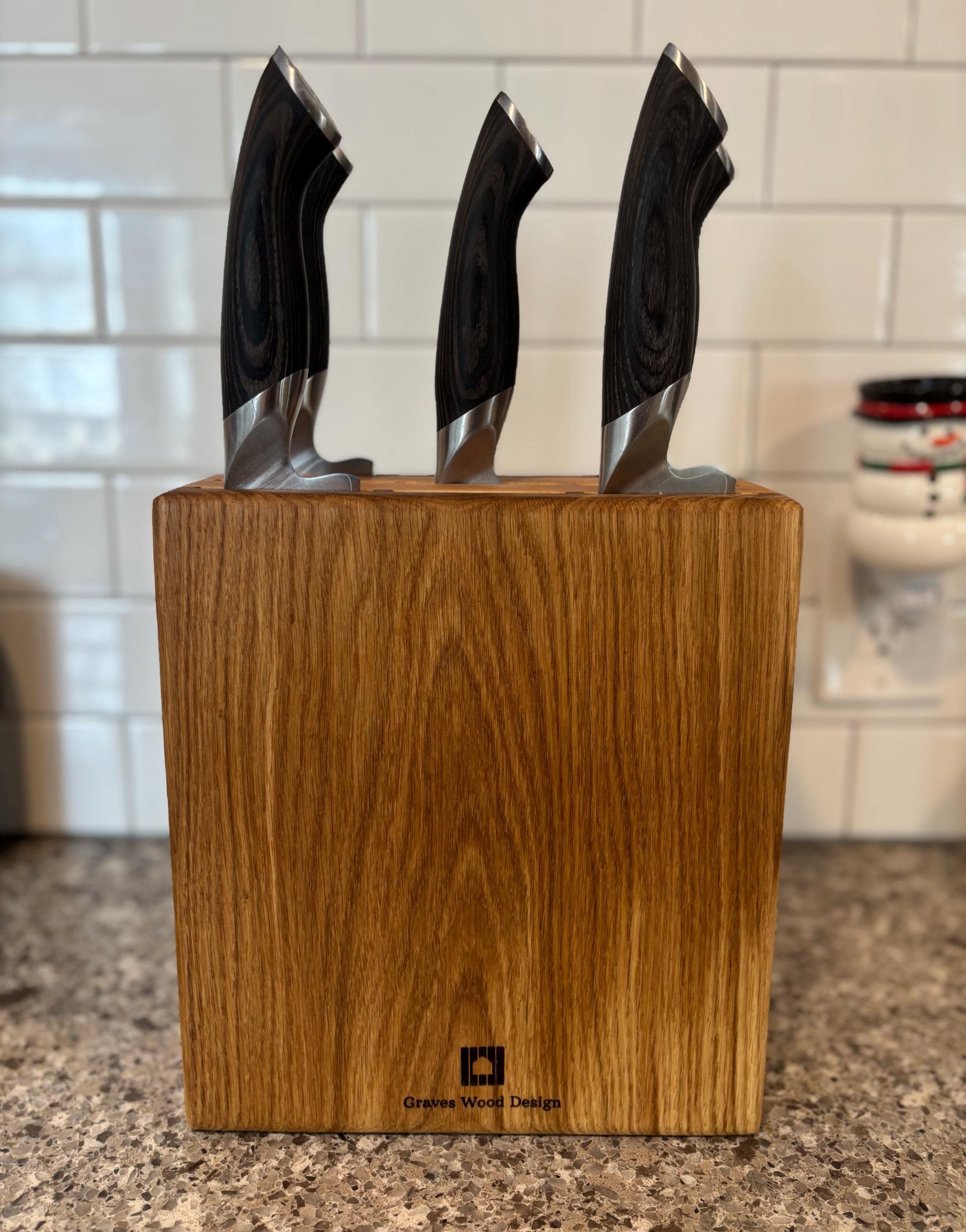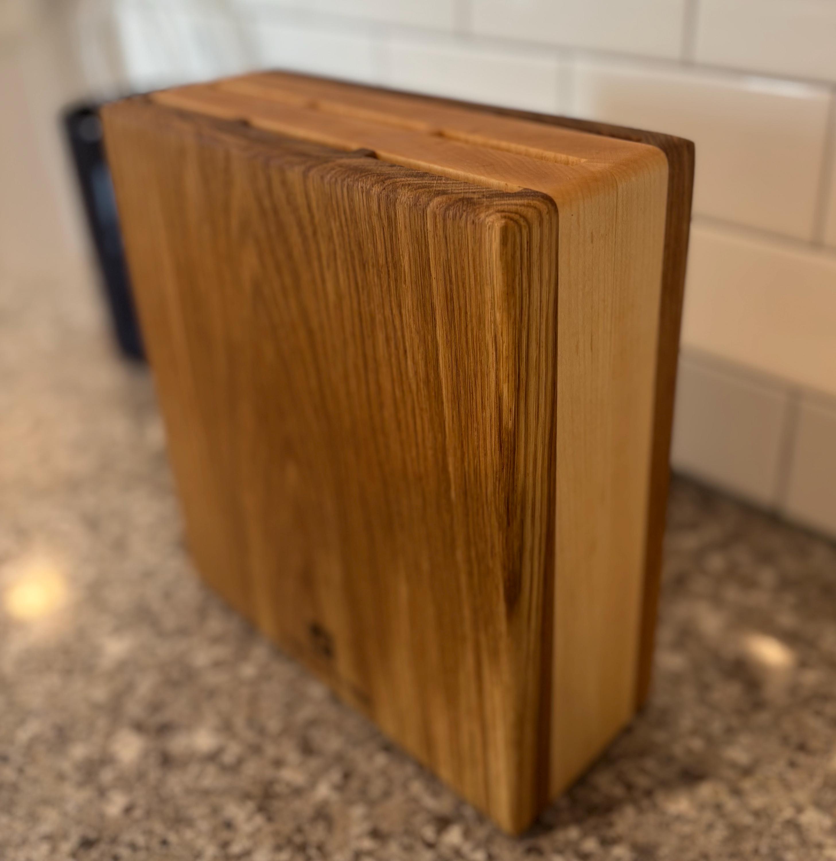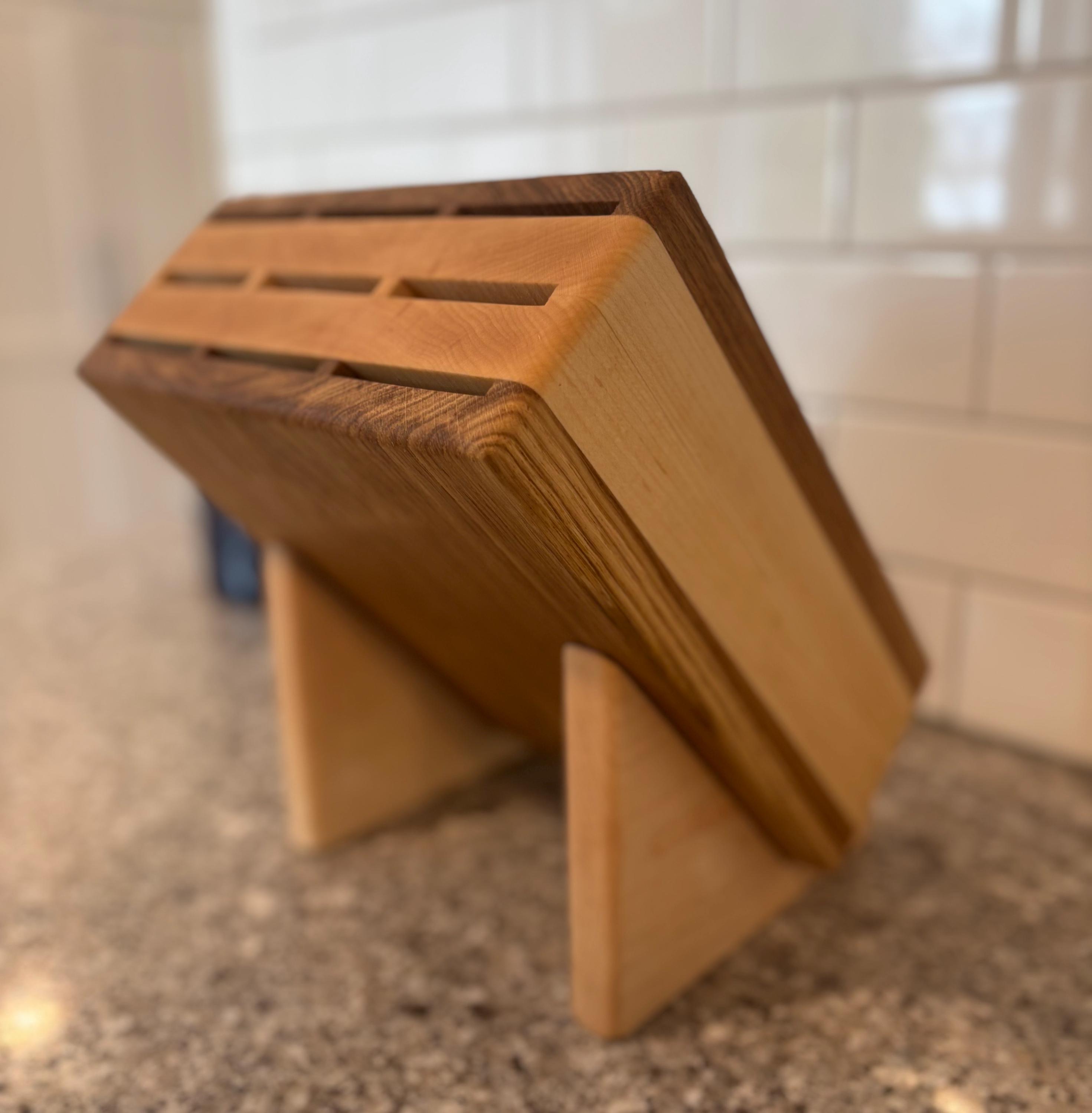 Give your kitchen knives a stylish and functional home with our sleek and beautiful 9 slot knife block. Handcrafted from a choice of high-quality hardwoods, these blocks features 9 slots and can accommodate 9 knives of various sizes, ensuring they stay organized and easily accessible. Imagine the joy your knives would feel having a dedicated spot to rest in between kitchen tasks. Measuring 9.75 inches tall, 9 inches wide, and ~4 inches deep, the knife block can hold even your largest knives securely and includes a removable stand that allows the block to be angled if placed under your upper cabinets. Treat your knives to the luxury they deserve with this stunning knife block. Personalized engraving is available at no additional charge if you would like to make your piece truly unique. (see design option pictures).