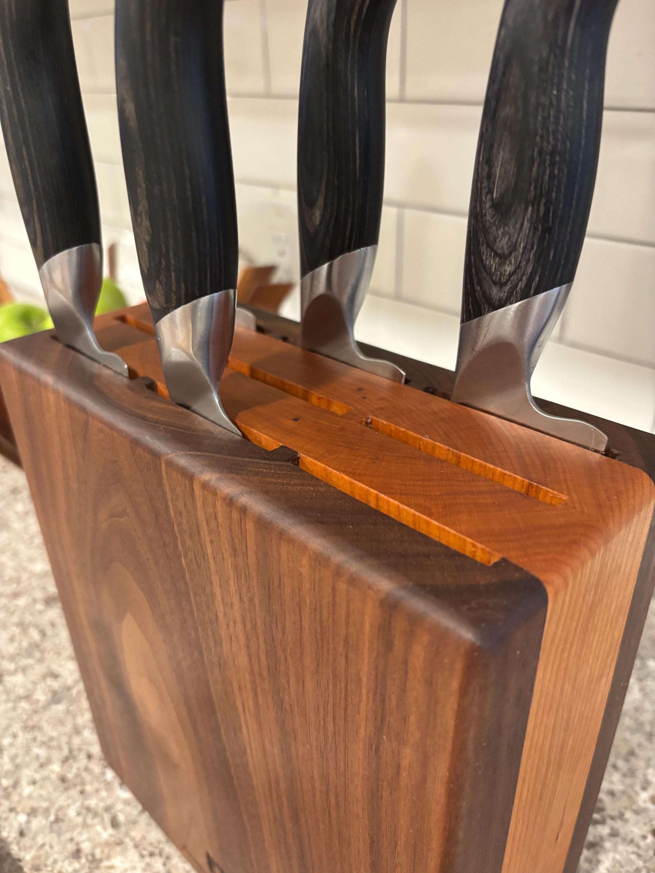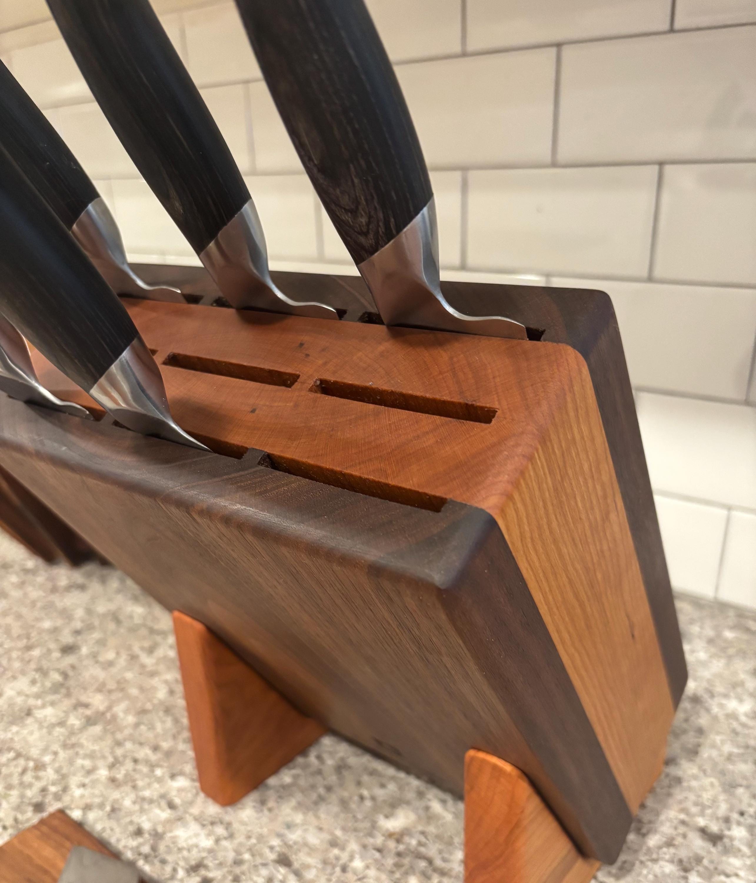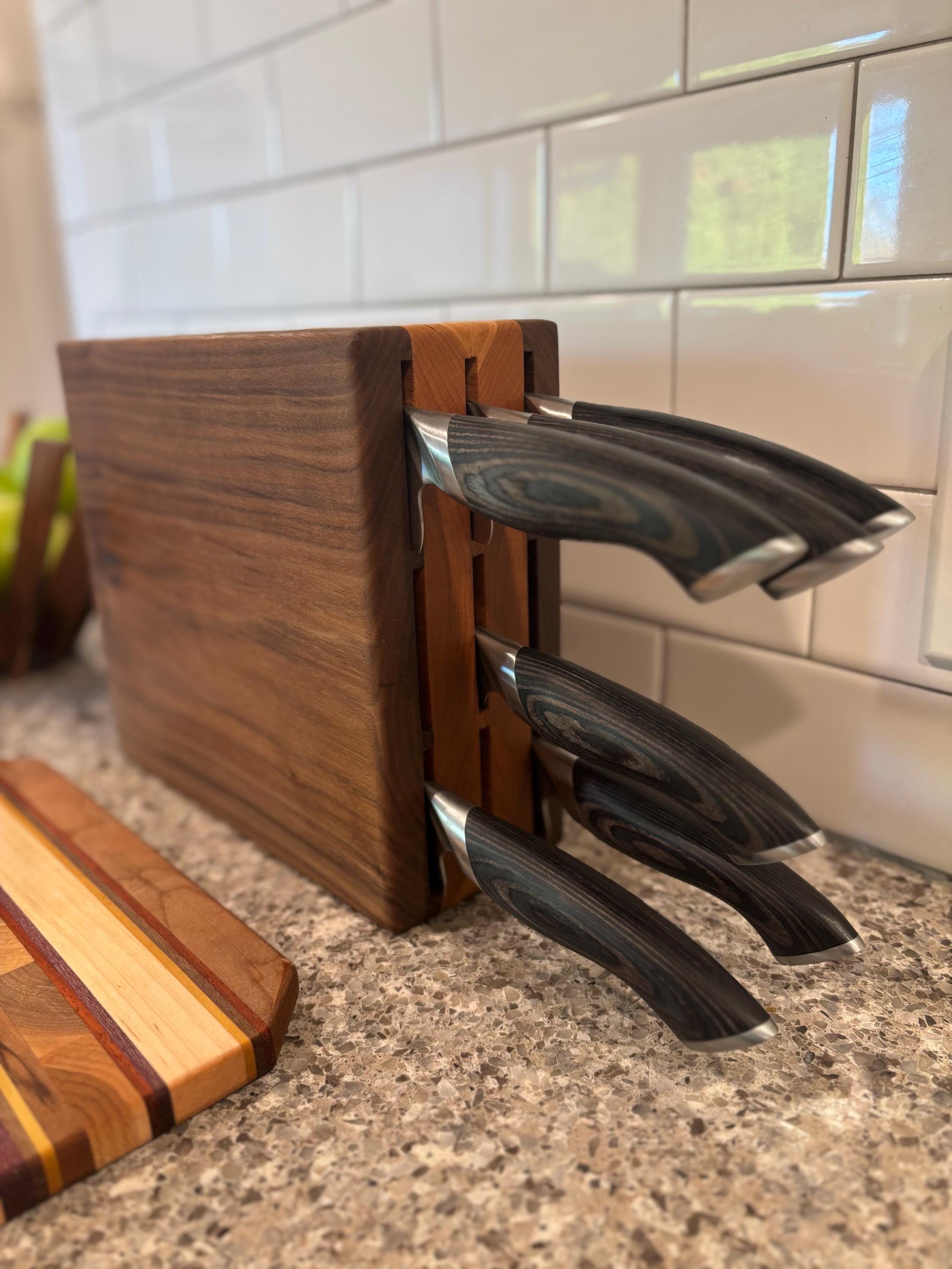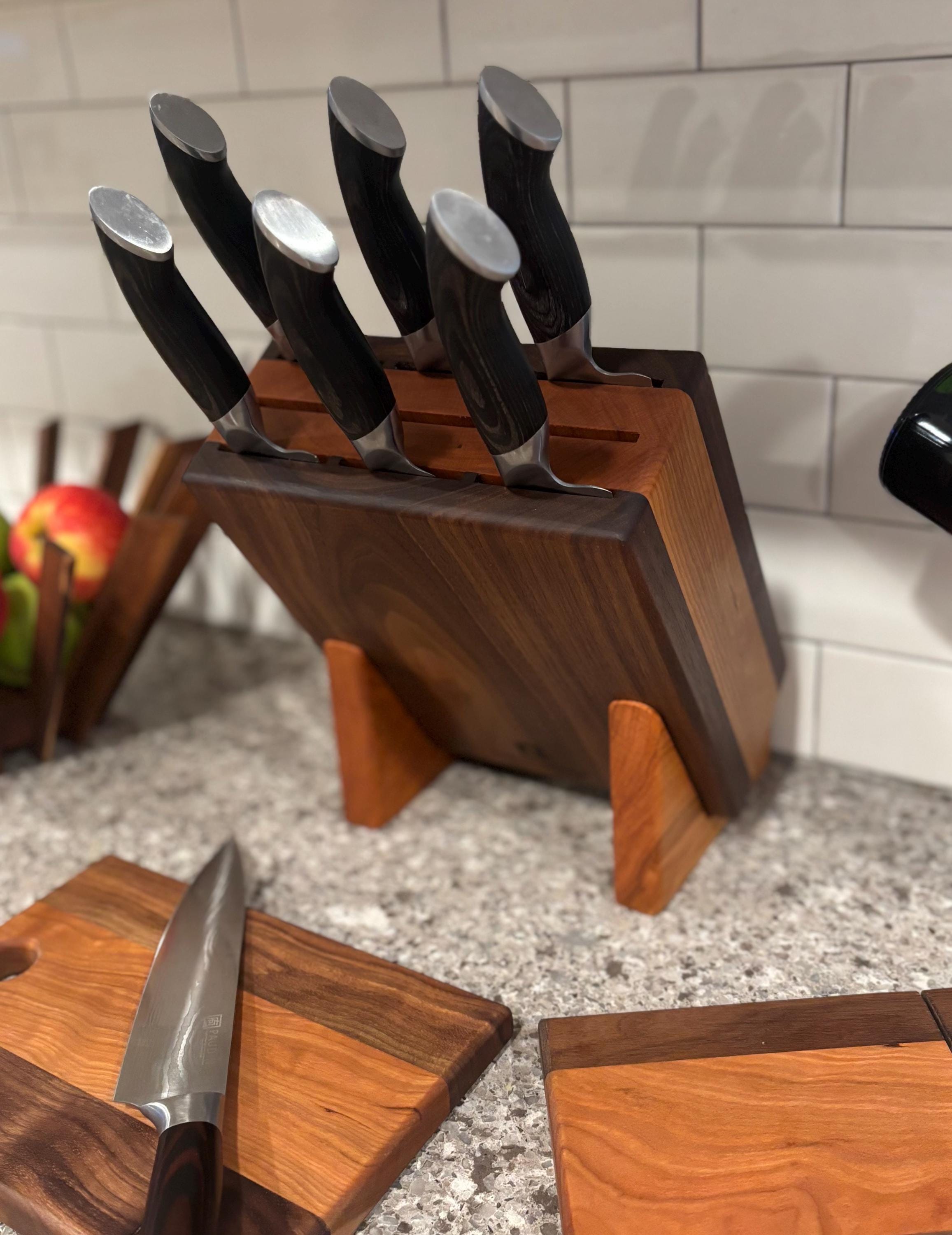 Give your kitchen knives a stylish and functional home with our sleek and beautiful walnut and cherry knife block. Handcrafted from high-quality hardwoods, this block features 9 slots and can accommodate 9 knives of various sizes, ensuring they stay organized and easily accessible. Imagine the joy your knives would feel having a dedicated spot to rest in between kitchen tasks. Measuring 9.75 inches tall, 9 inches wide, and 4 inches deep, the knife block can hold even your largest knives securely. Additionally, you can order matching accessories, including removable stands that allow block to be angled if placed under your upper cabinets. Treat your knives to the luxury they deserve with this stunning knife block. Personalized engraving is available at no additional charge if you would like to make your piece truly unique. (see design option pictures).
