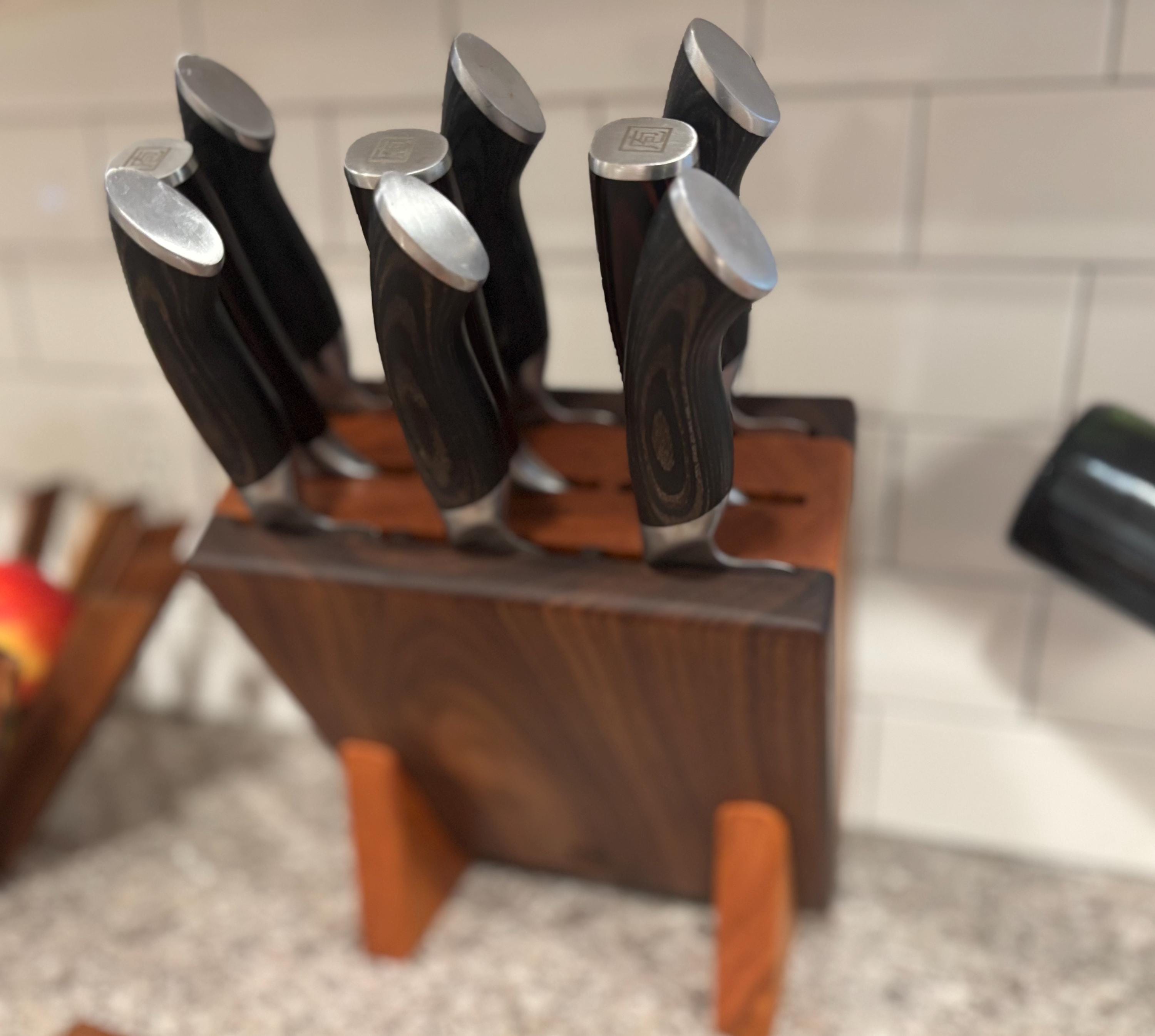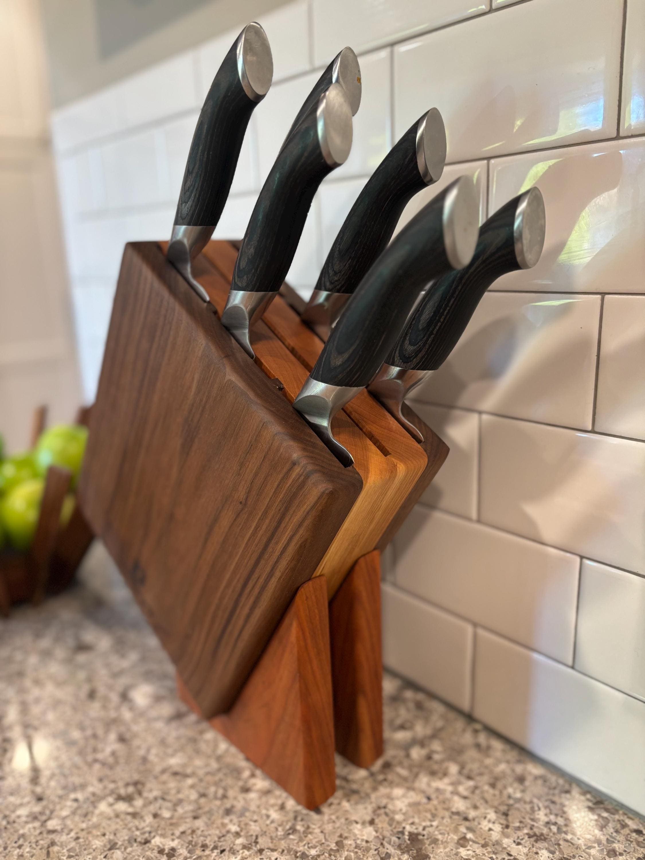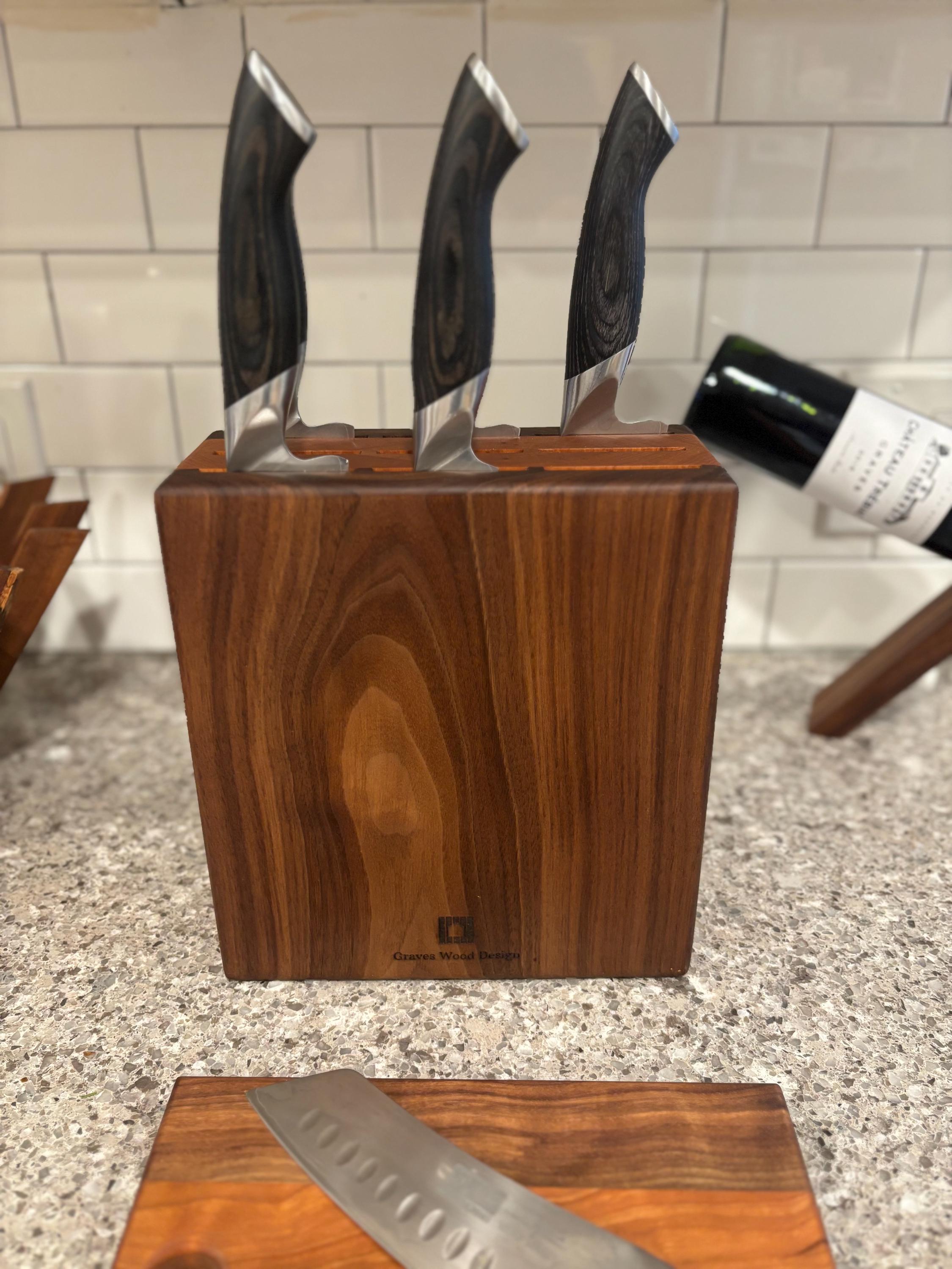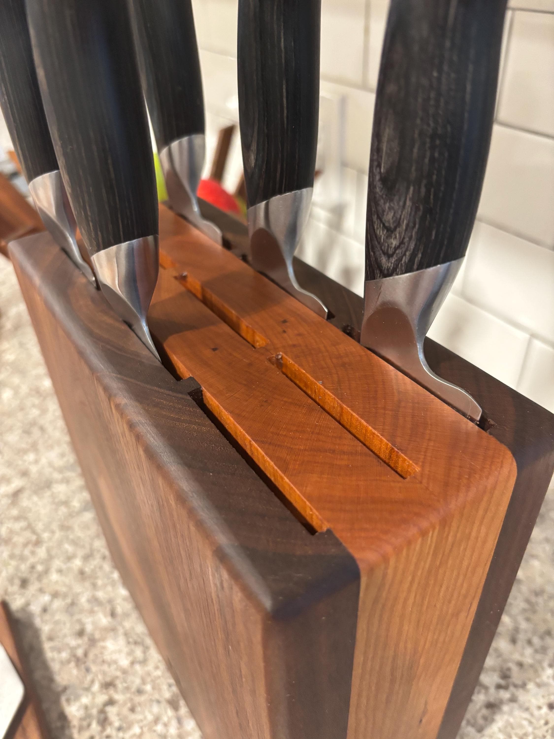 Give your kitchen knives a stylish and functional home with our sleek and beautiful walnut and cherry knife block. Handcrafted from high-quality hardwoods, this block features 9 slots and can accommodate 9 knives of various sizes, ensuring they stay organized and easily accessible. Imagine the joy your knives would feel having a dedicated spot to rest in between kitchen tasks. Measuring 9.75 inches tall, 9 inches wide, and 4 inches deep, the knife block can hold even your largest knives securely. Additionally, you can order matching accessories, including removable stands that allow block to be angled if placed under your upper cabinets. Treat your knives to the luxury they deserve with this stunning knife block. Personalized engraving is available at no additional charge if you would like to make your piece truly unique. (see design option pictures).