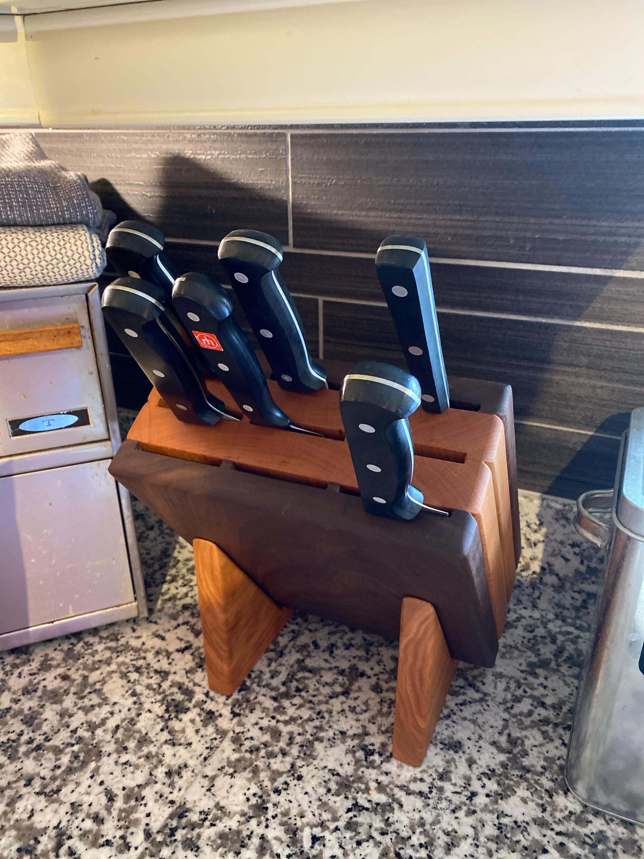 Give your kitchen knives a stylish and functional home with our sleek and beautiful walnut and cherry knife block. Handcrafted from high-quality hardwoods and accented with ribbed sides, this block features 9 slots and can accommodate 9 knives of various sizes, ensuring they stay organized and easily accessible. Imagine the joy your knives would feel having a dedicated spot to rest in between kitchen tasks. Measuring 9.75 inches tall, 9 inches wide, and 4 inches deep, the knife block can hold even your largest knives securely. Additionally, you can order matching accessories, including removable stands that allow block to be angled if placed under your upper cabinets. Treat your knives to the luxury they deserve with this stunning knife block. Personalized engraving is available at no additional charge if you would like to make your piece truly unique. (see design option pictures).