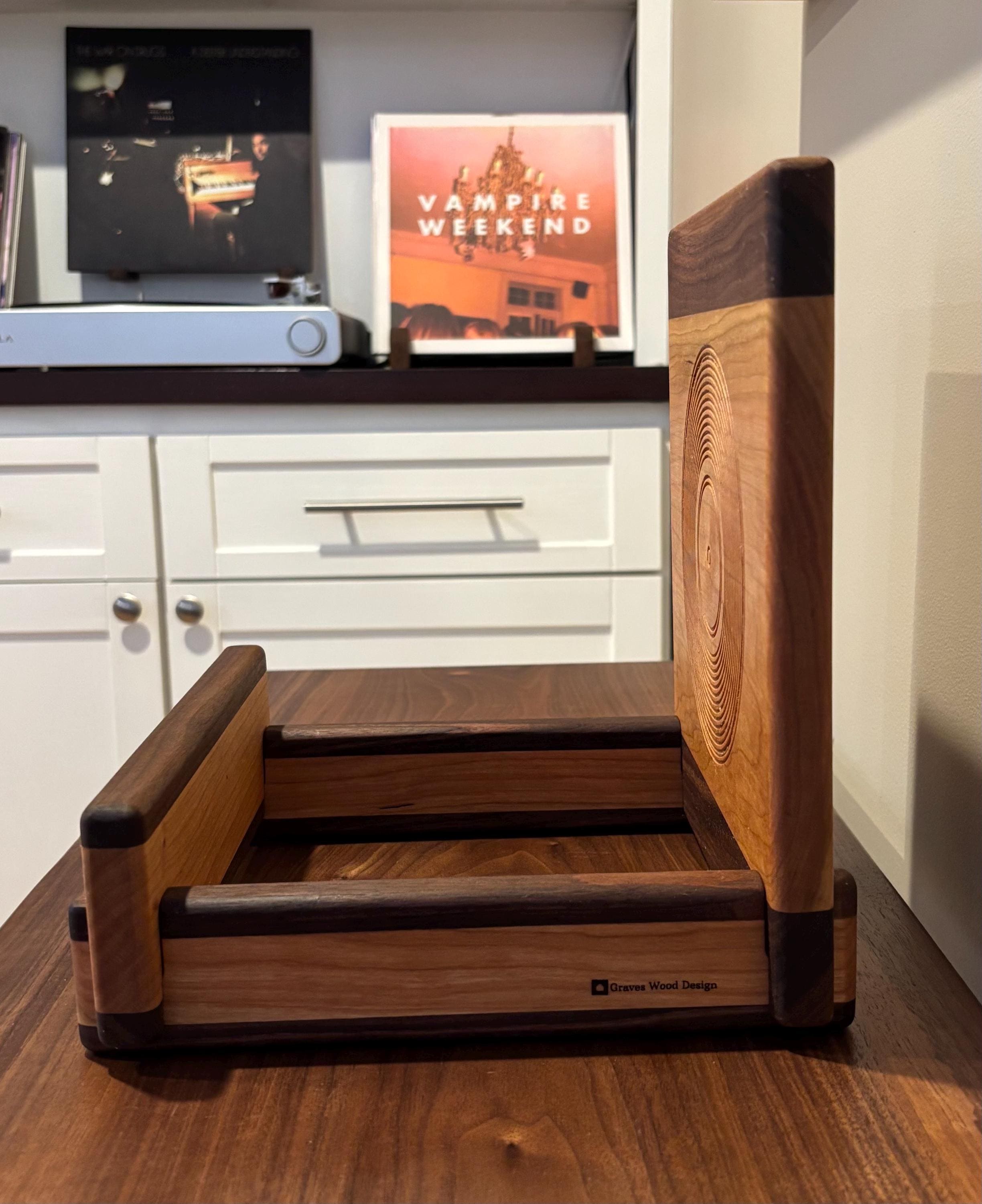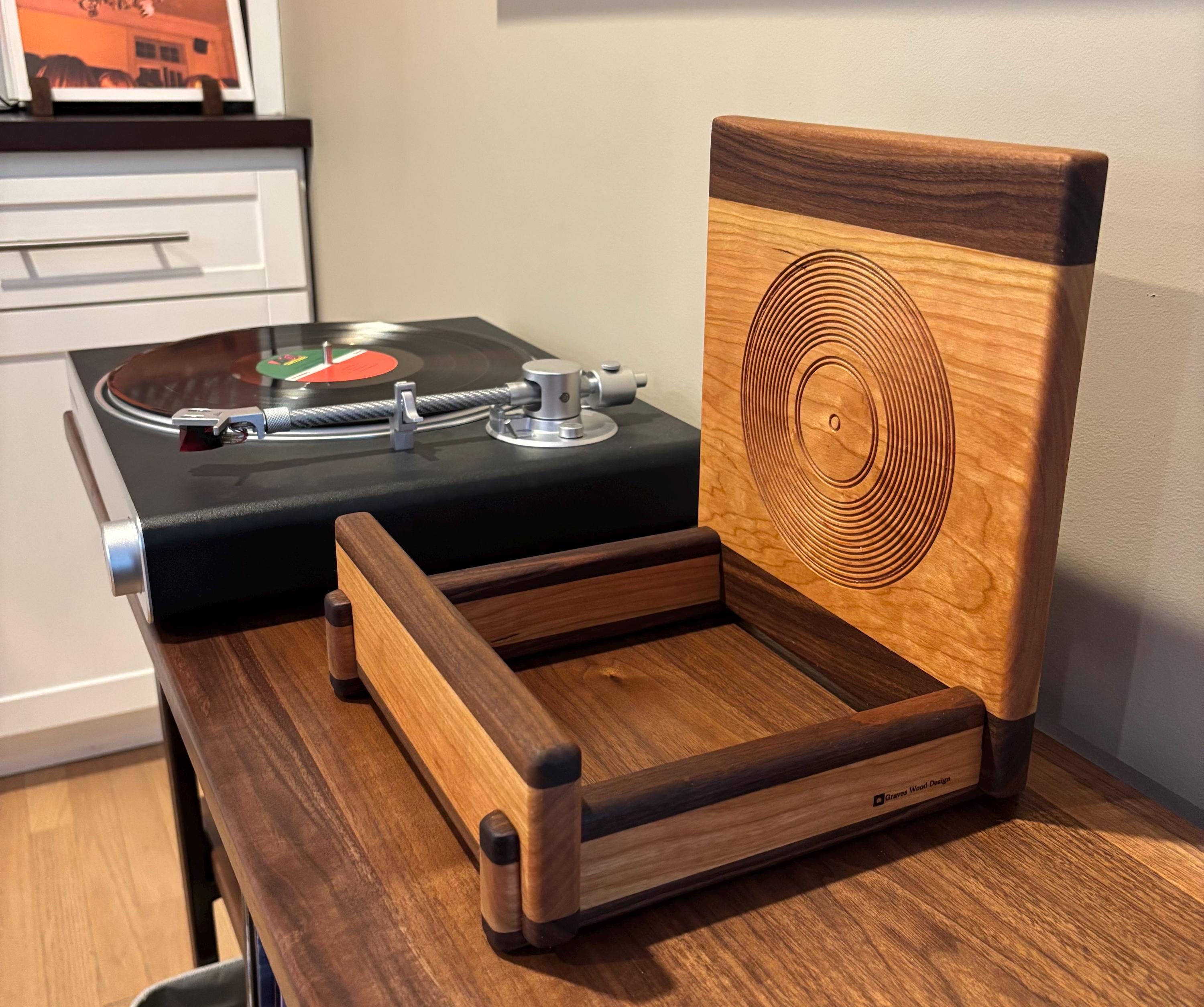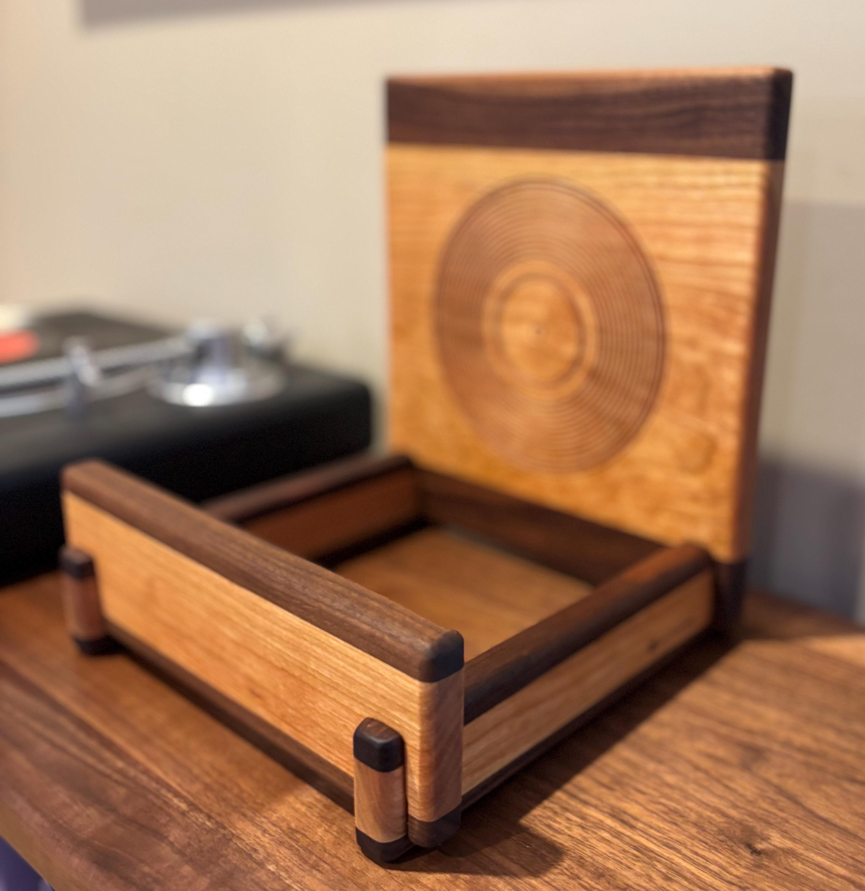 Introducing our Personalizable Vinyl Record Display Flip Rack, a stunning way to showcase your cherished vinyl collection while keeping it organized and easily accessible. Handcrafted from premium Walnut and Cherry, this beautiful piece not only transforms your album covers into eye-catching art, but offers personalization to make it unique to you or someone you love.