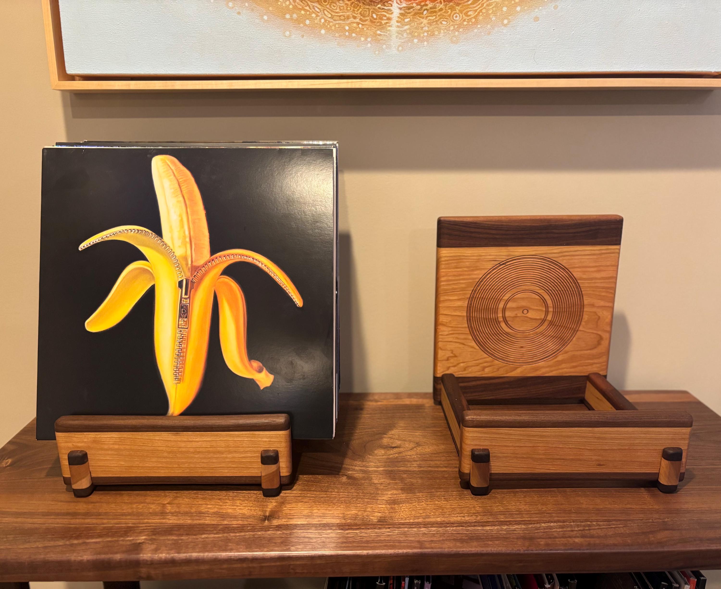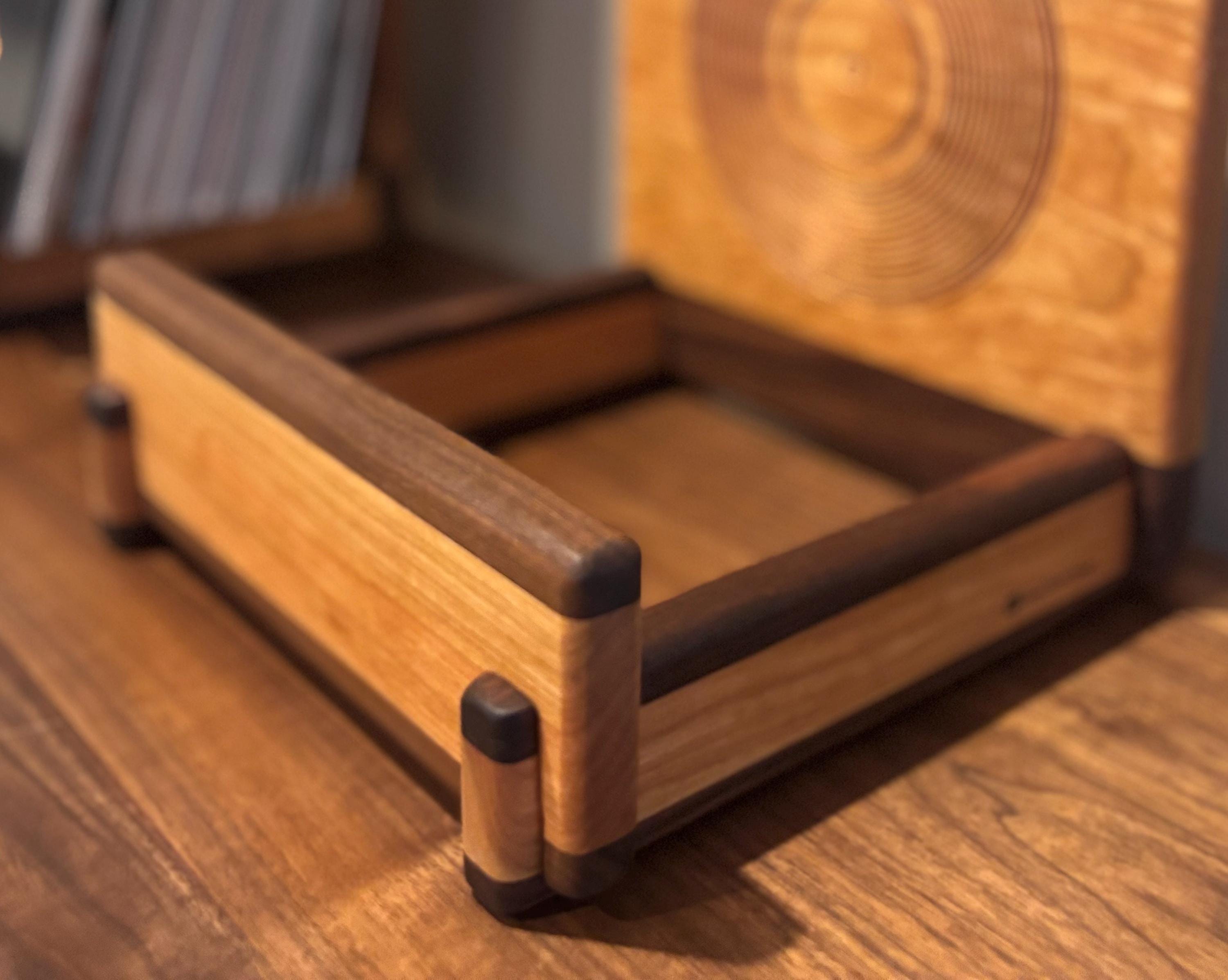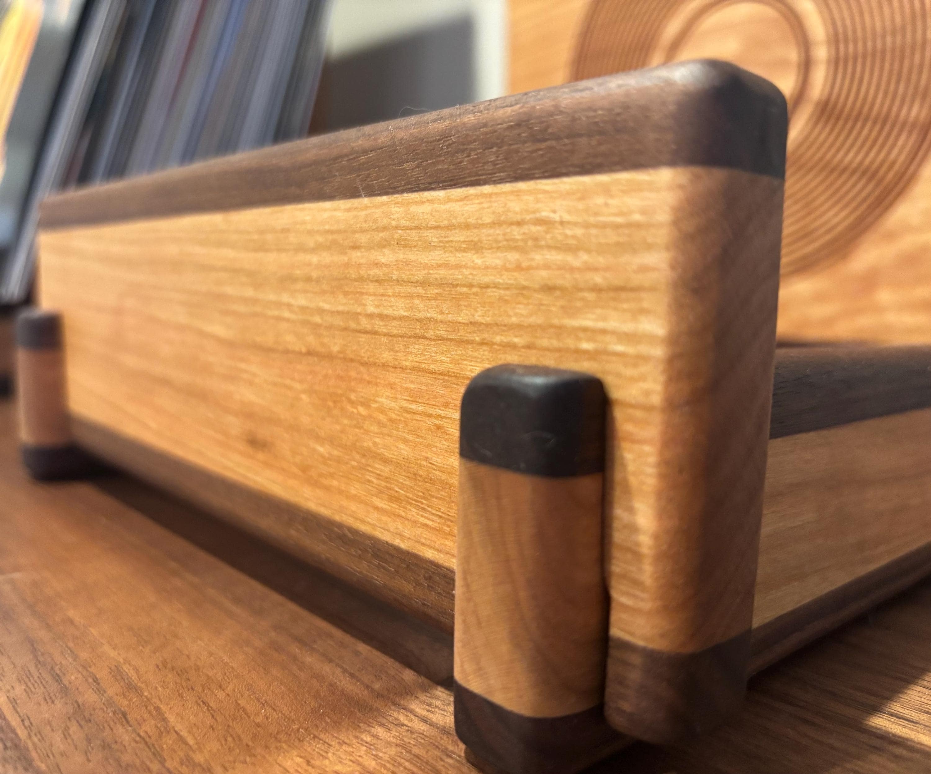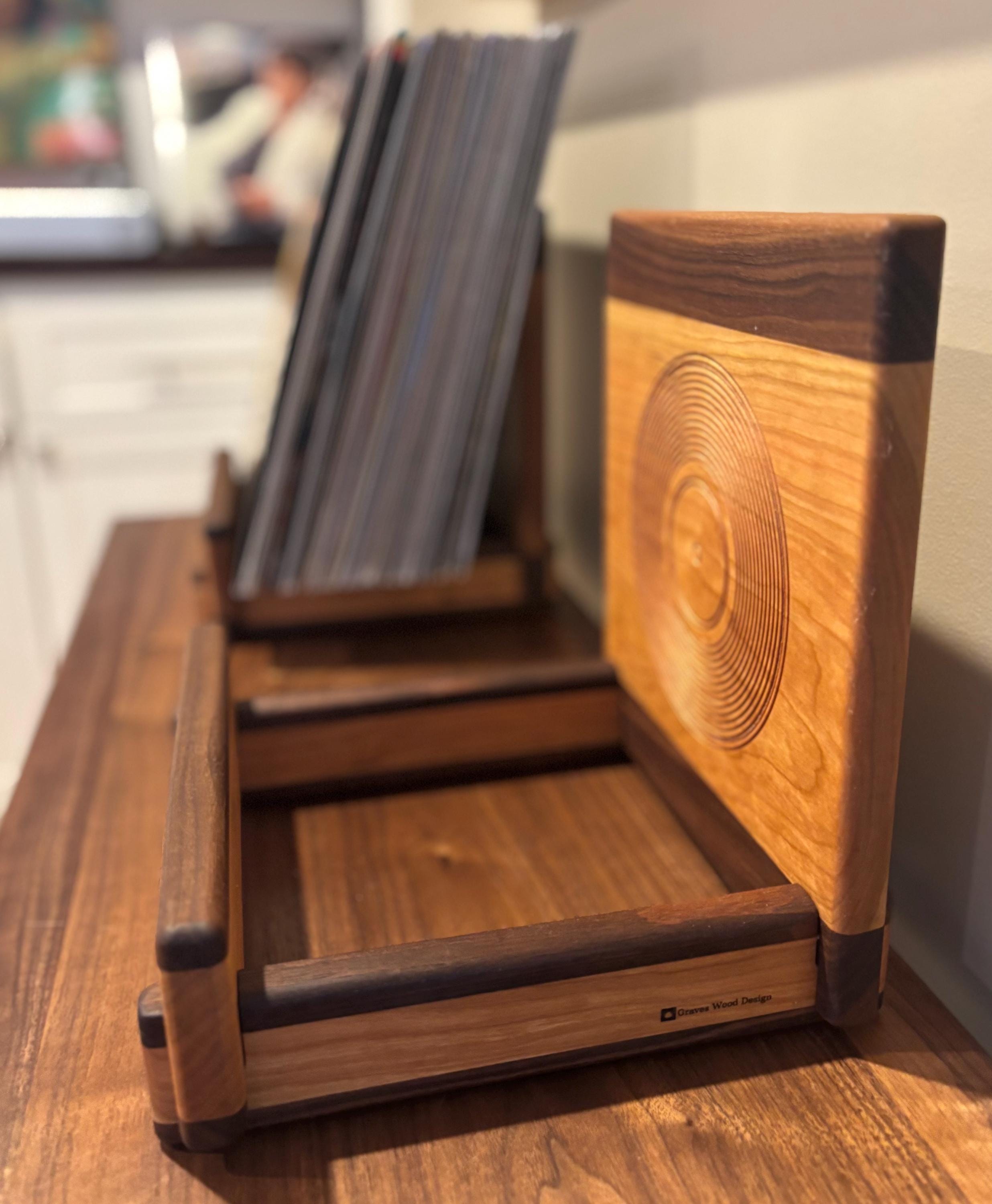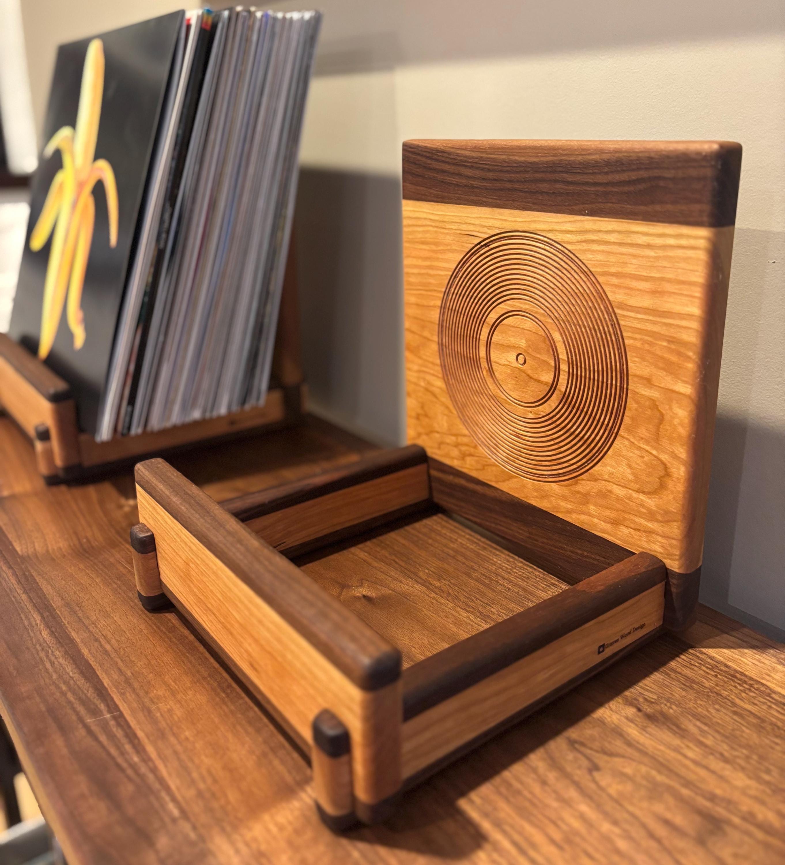 Introducing our Personalizable Vinyl Record Display Flip Rack, a stunning way to showcase your cherished vinyl collection while keeping it organized and easily accessible. Handcrafted from premium Walnut and Cherry, this beautiful piece not only transforms your album covers into eye-catching art, but offers personalization to make it unique to you or someone you love.
