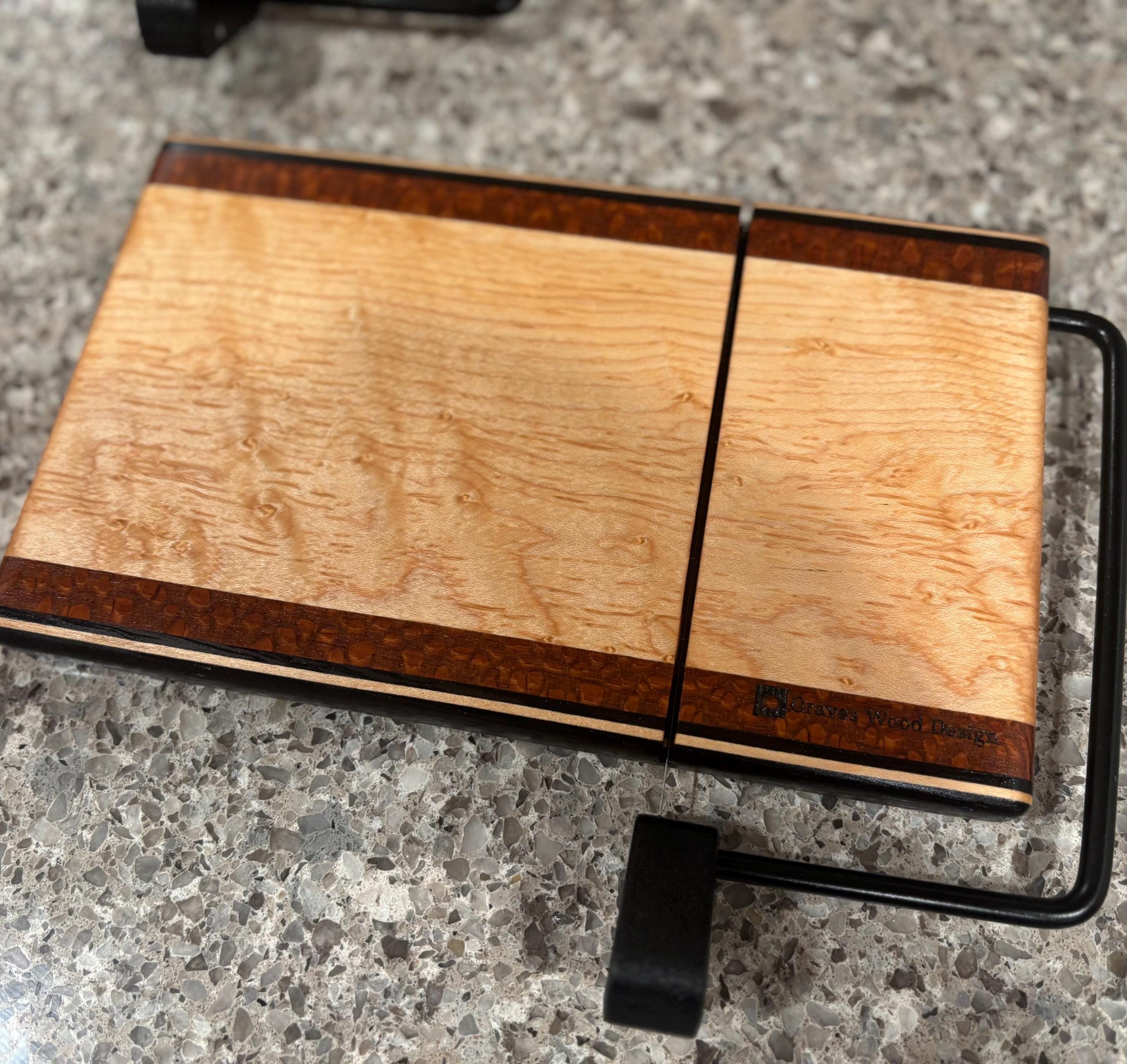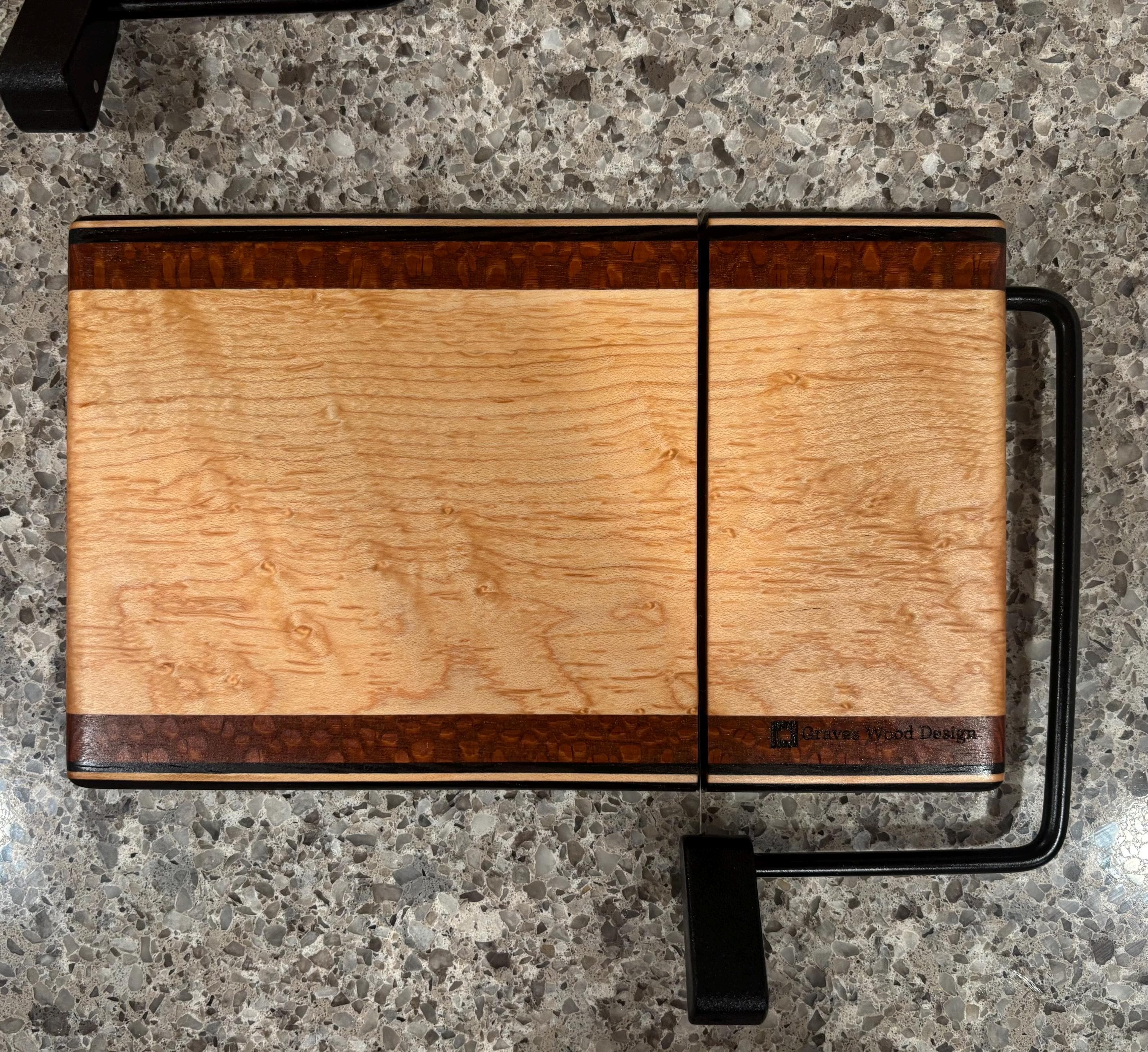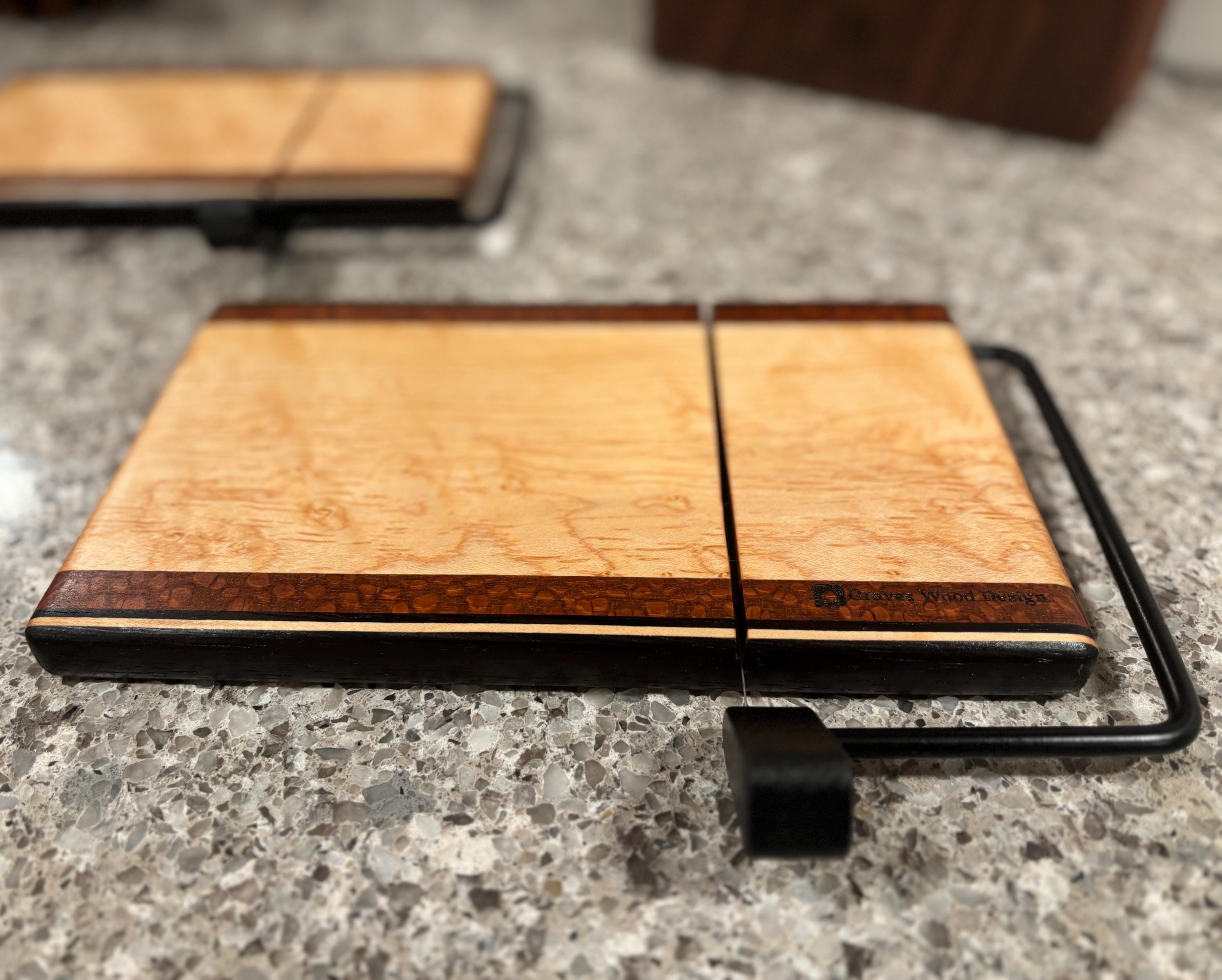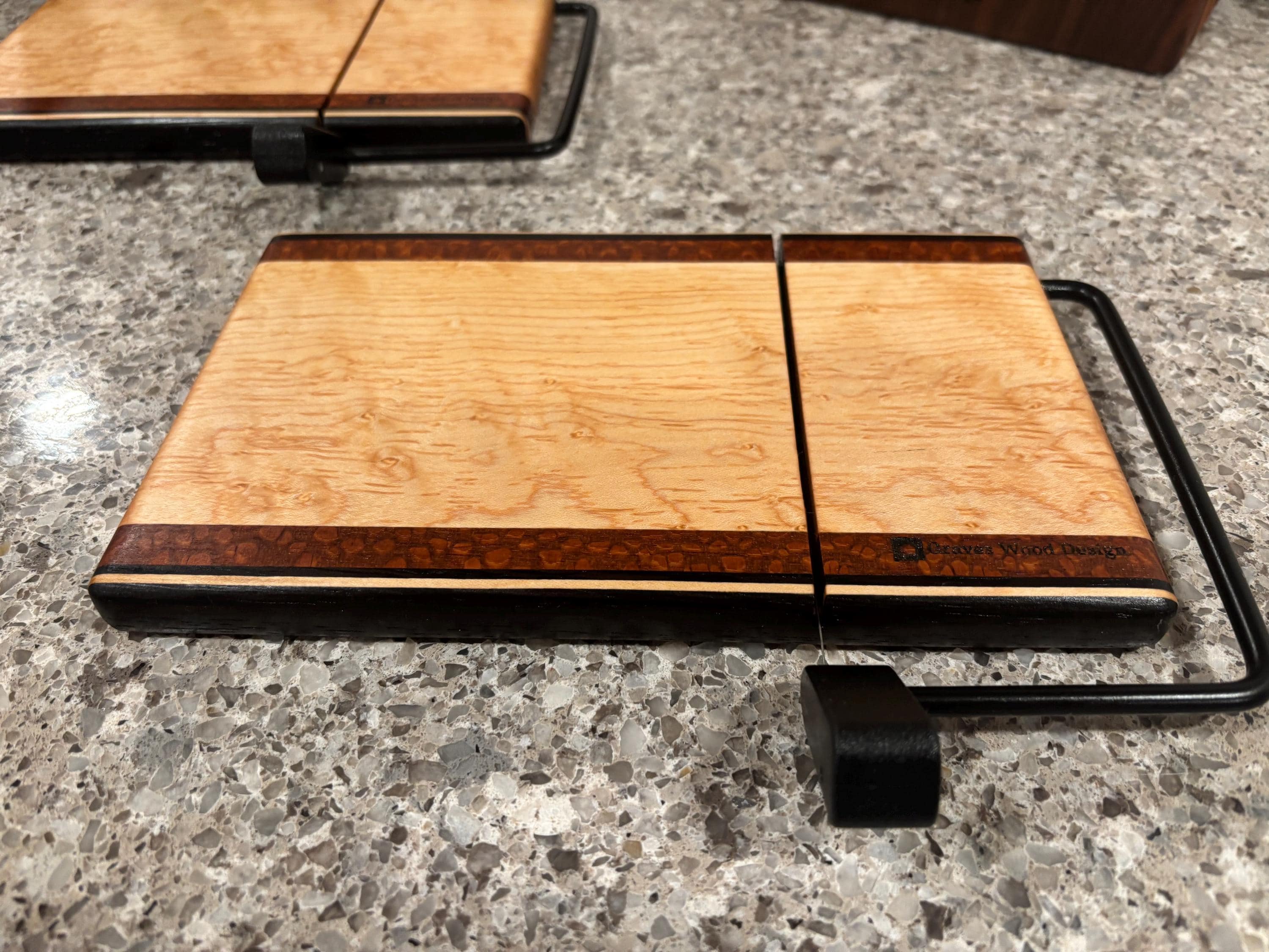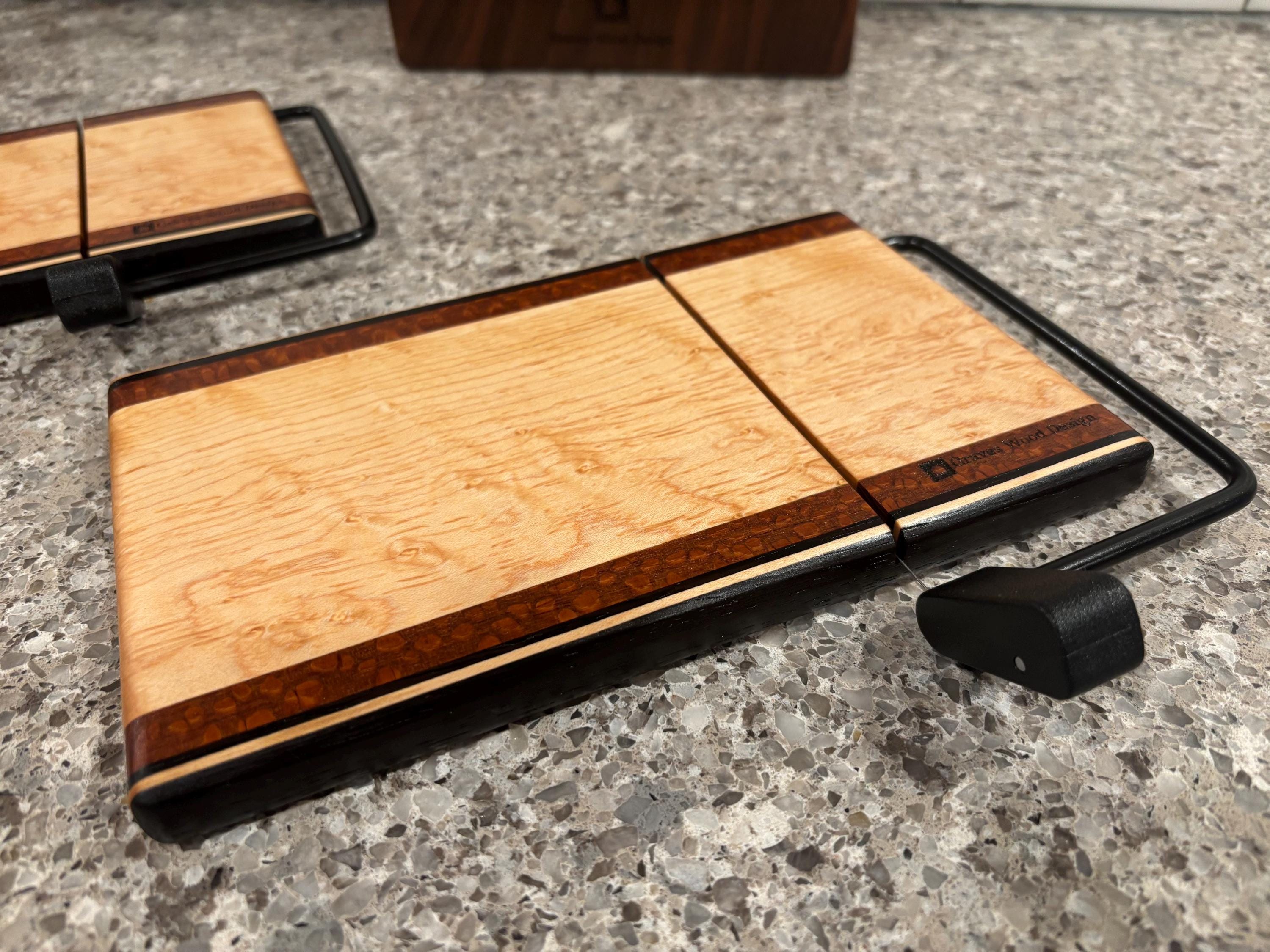 Our handcrafted wood cheese slicer is a beautiful addition to your kitchen. Made from solid Birdseye Maple with exotic Leopardwood and Black Wenge accent stripes, this cheese slicer board is not only functional but also a work of art. The contemporary design exudes a sense of sophistication that will elevate your entertaining experience. Featuring a stainless steel cutting wire, this slicer effortlessly cuts through your favorite cheeses, making it ideal for both everyday use and special occasions. Elevate your cheese platter presentation with this exceptional cheese slicer that combines beauty and functionality seamlessly. Each board includes a tin of conditioning wax to protect and refresh, ensuring years of use and enjoyment.