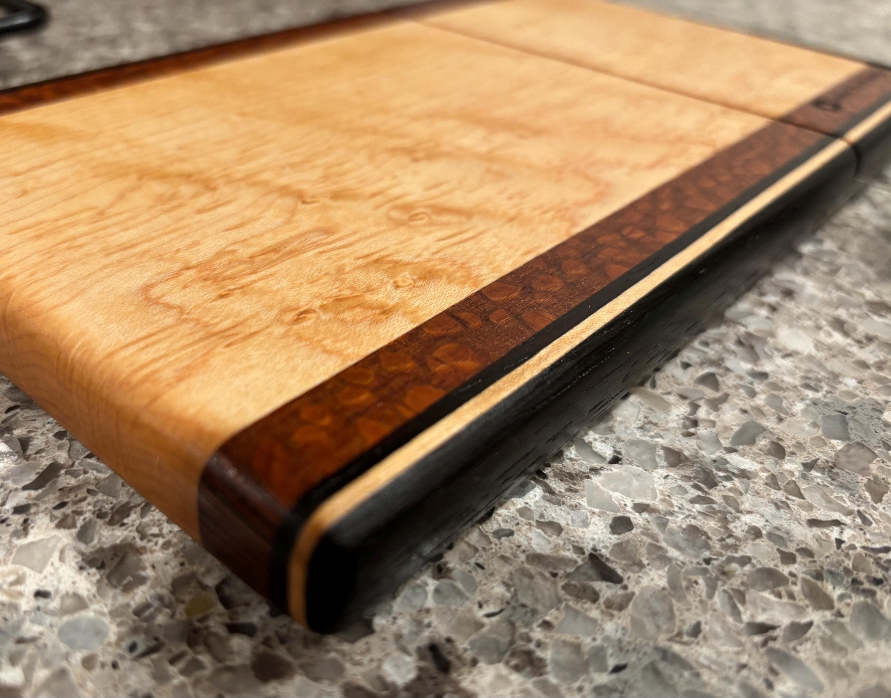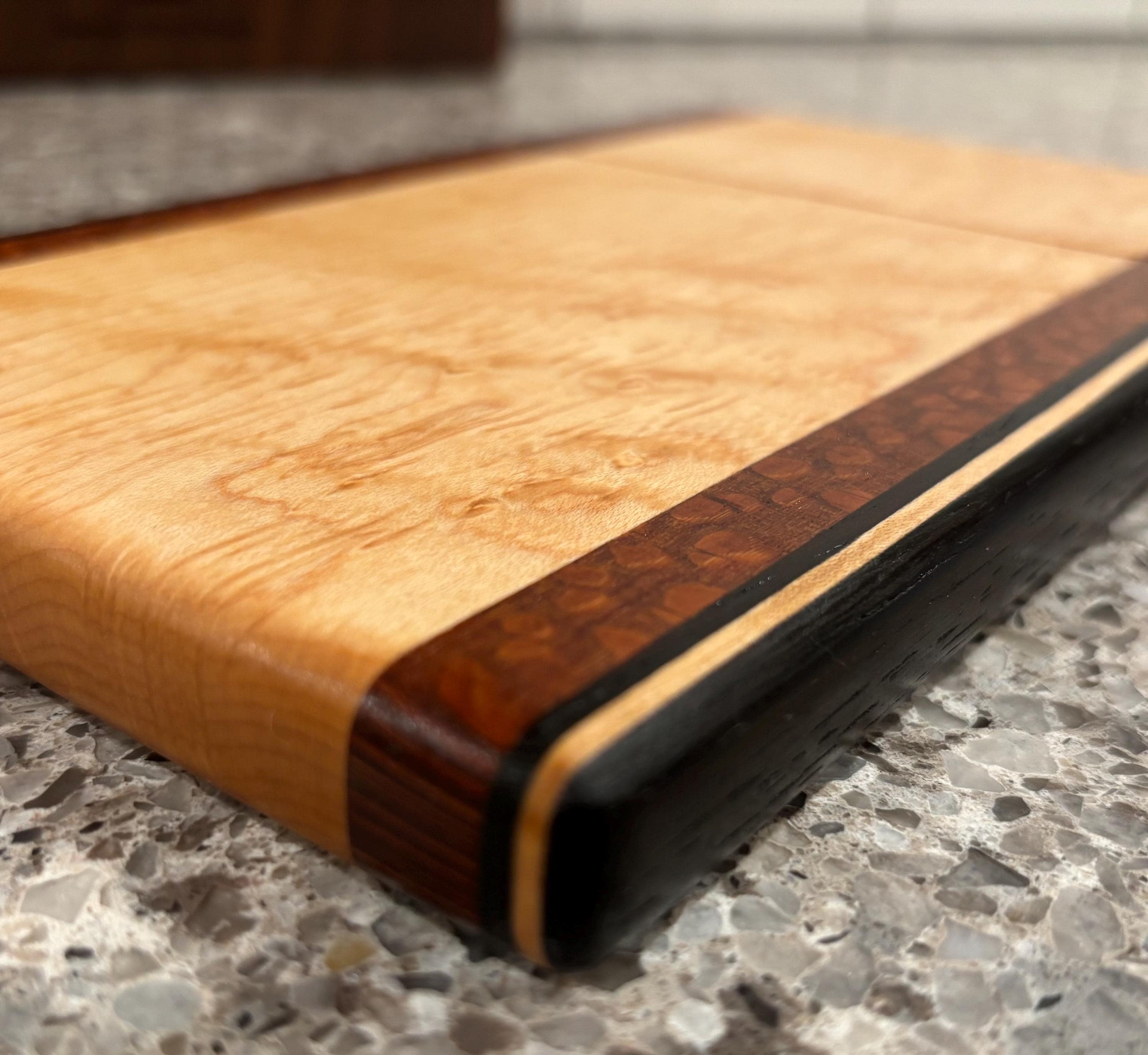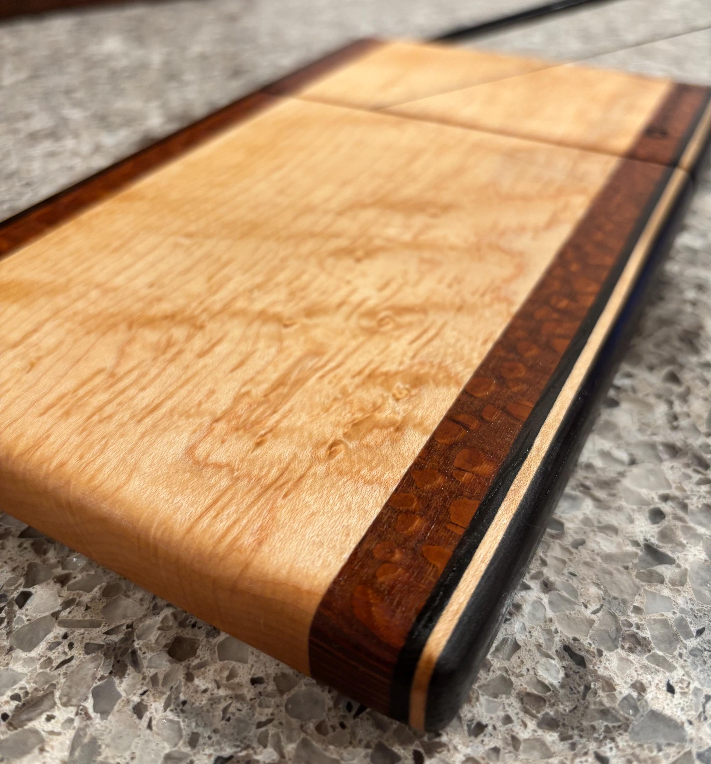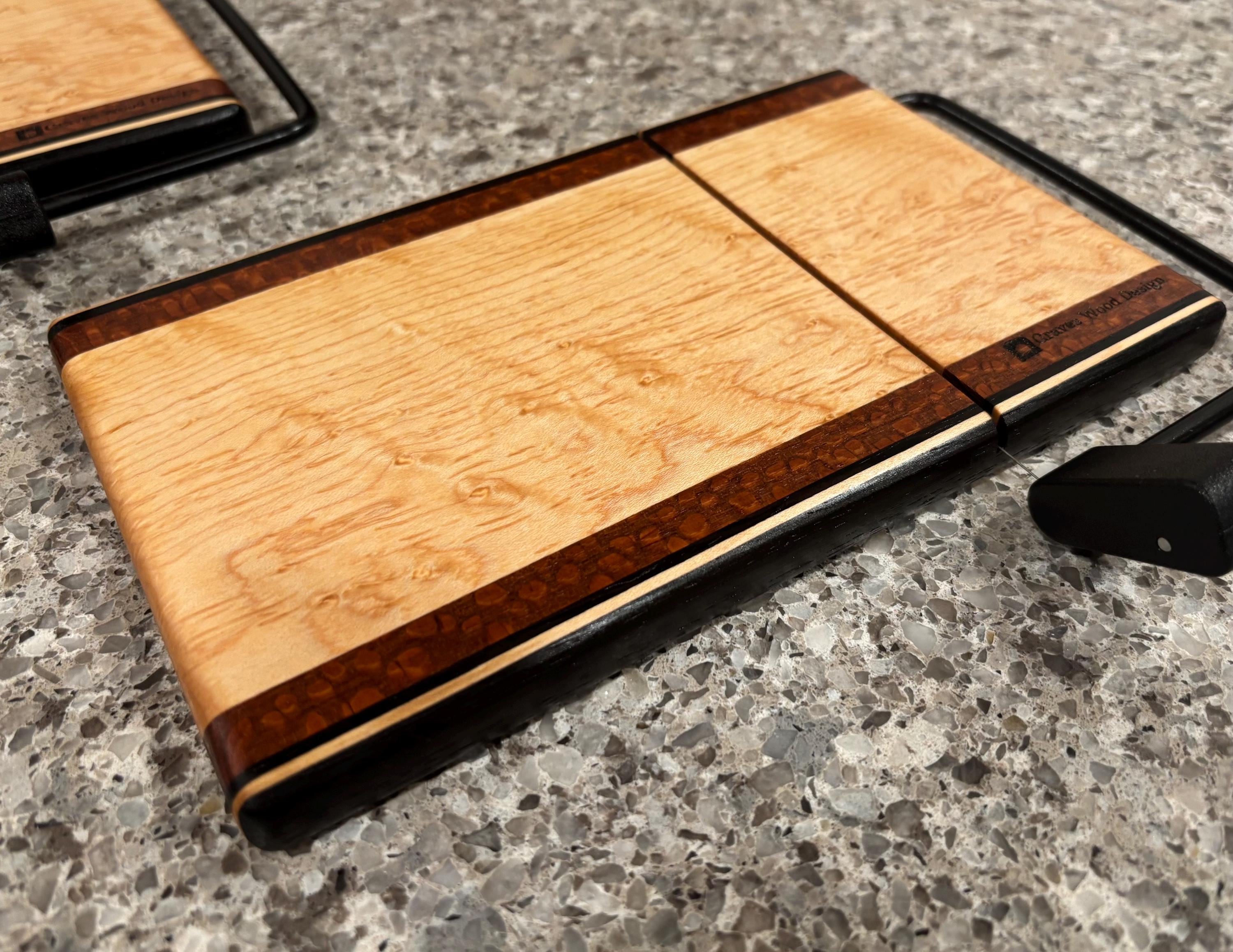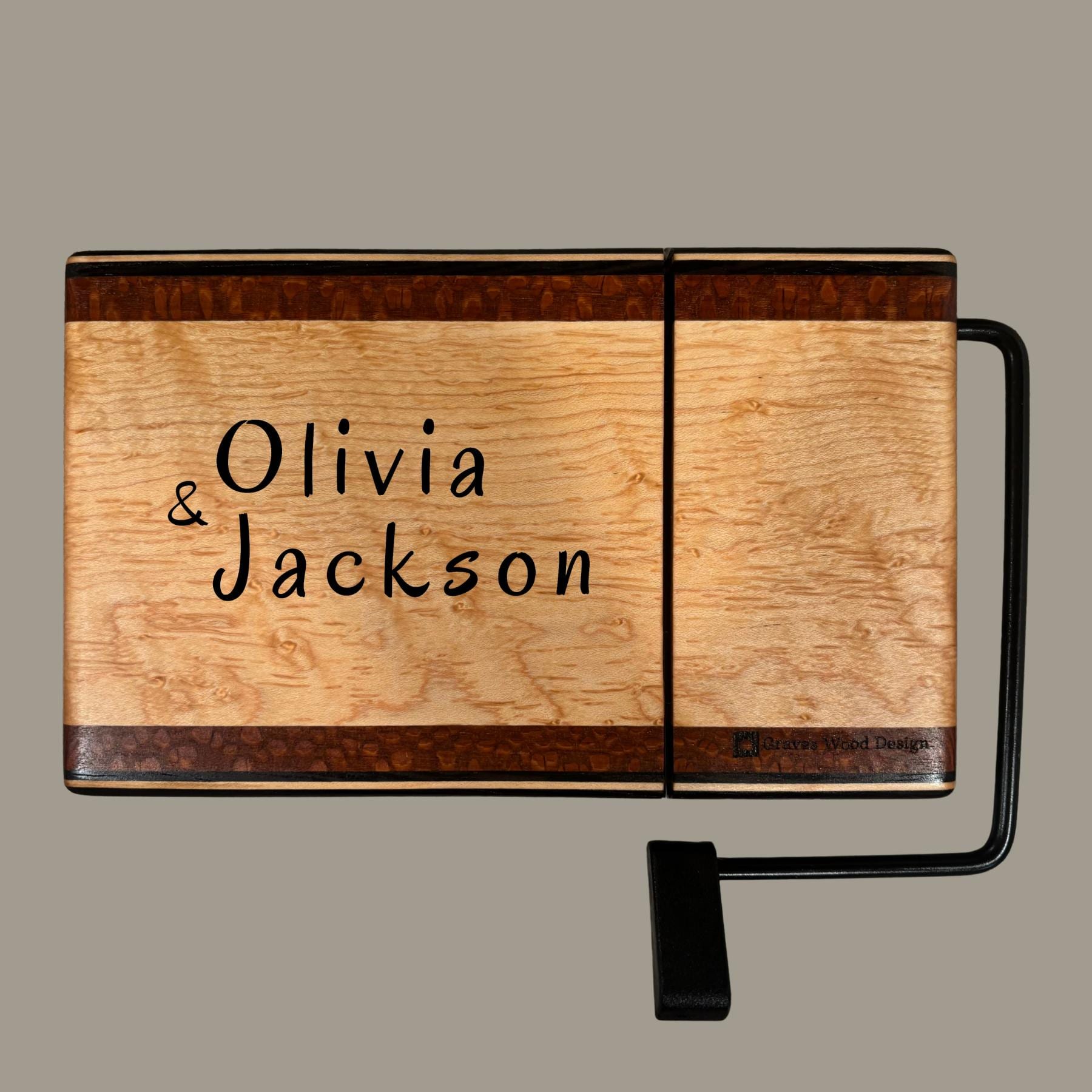 Our handcrafted wood cheese slicer is a beautiful addition to your kitchen. Made from solid Birdseye Maple with exotic Leopardwood and Black Wenge accent stripes, this cheese slicer board is not only functional but also a work of art. The contemporary design exudes a sense of sophistication that will elevate your entertaining experience. Featuring a stainless steel cutting wire, this slicer effortlessly cuts through your favorite cheeses, making it ideal for both everyday use and special occasions. Elevate your cheese platter presentation with this exceptional cheese slicer that combines beauty and functionality seamlessly. Each board includes a tin of conditioning wax to protect and refresh, ensuring years of use and enjoyment.