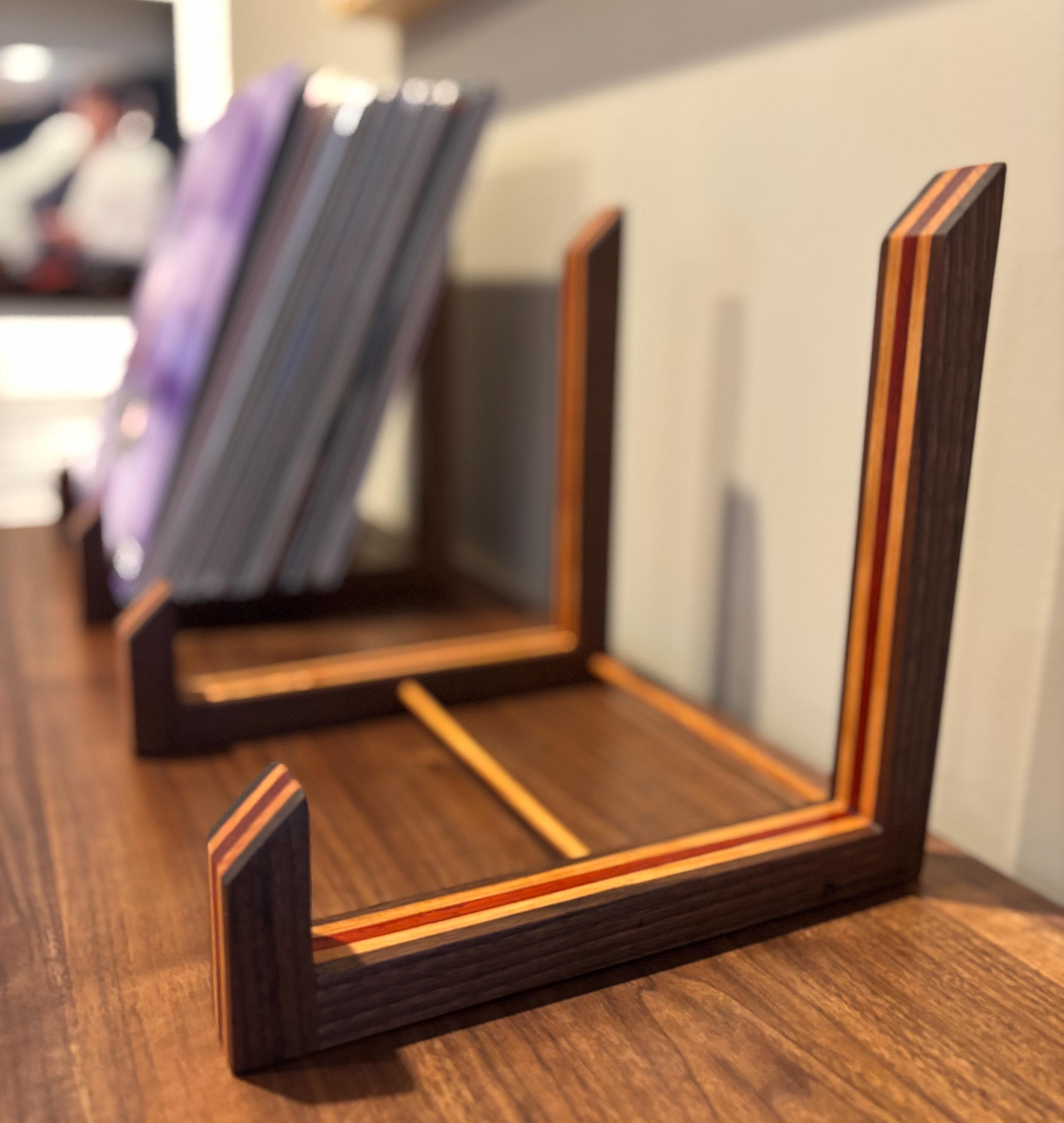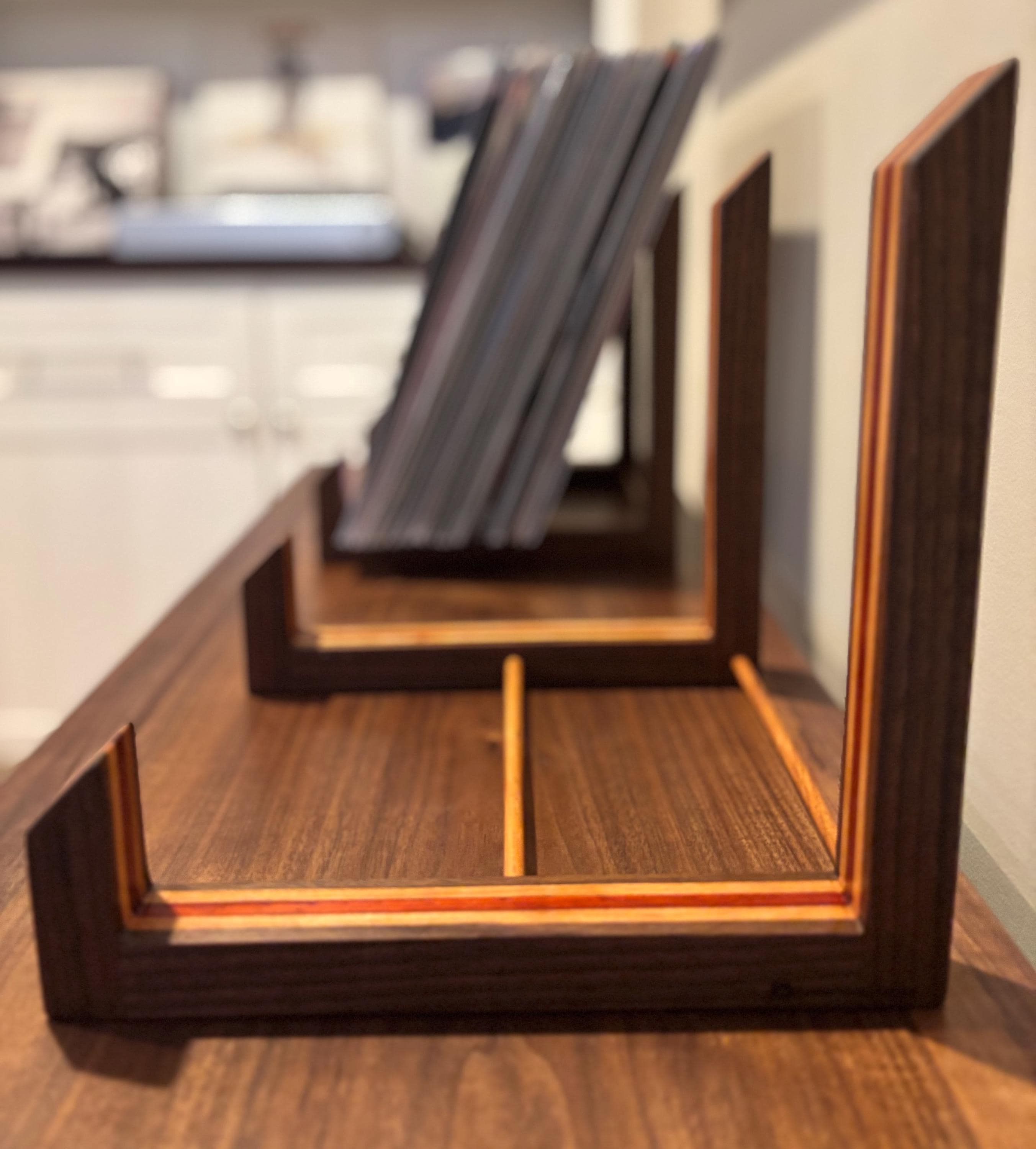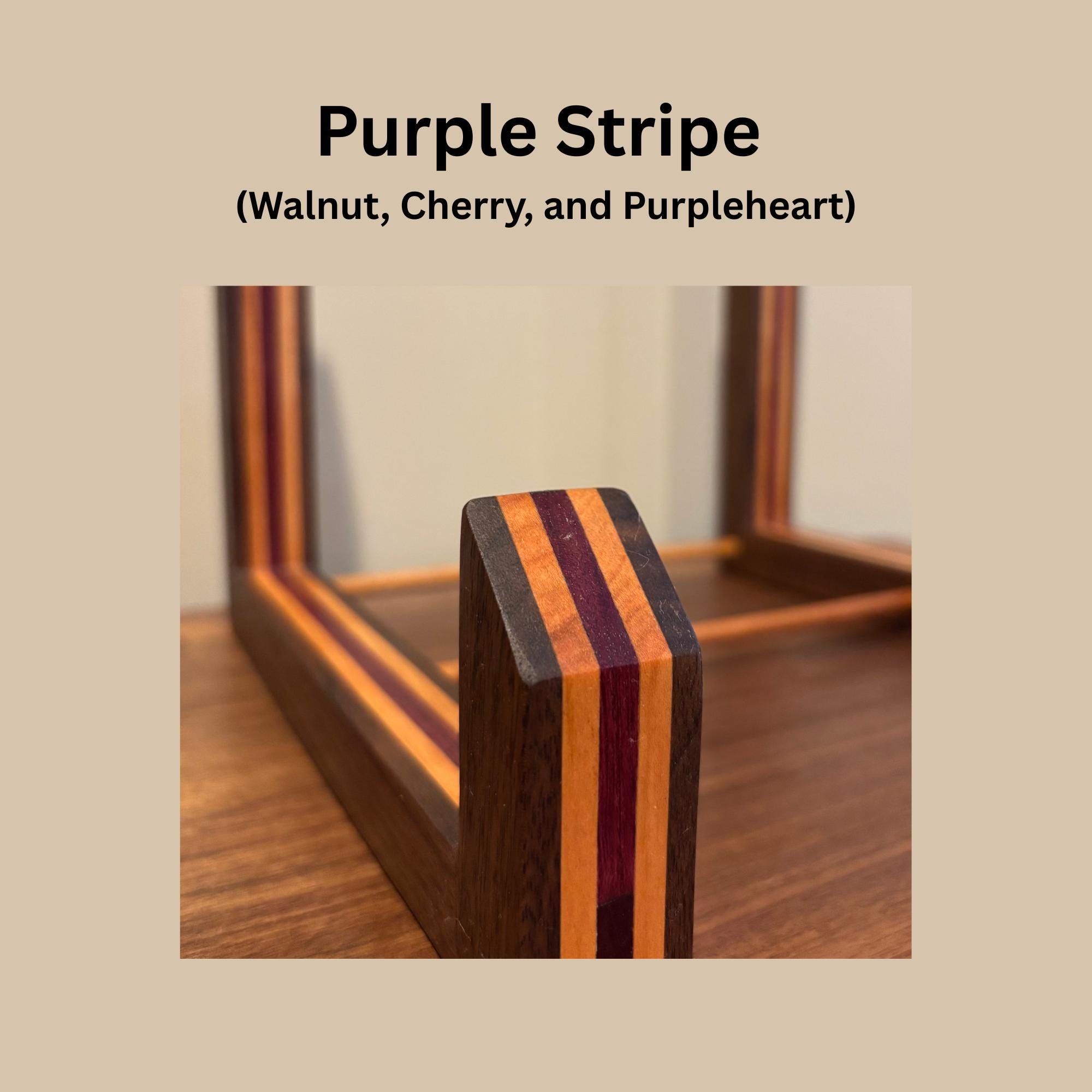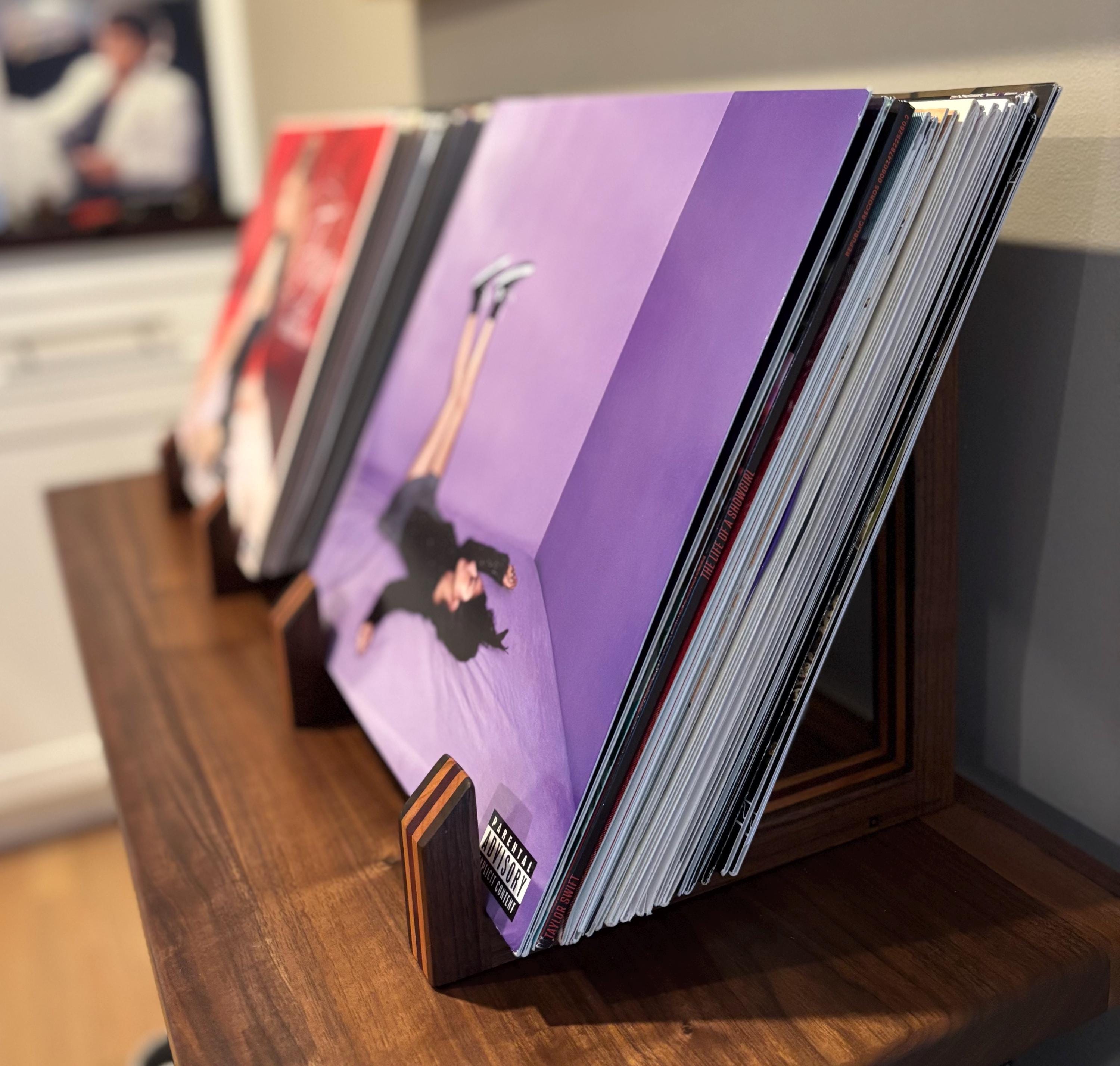 The sleek, timeless design of our rack and choice of vibrant accent stripes will fit into any decor, making it a must-have for vinyl lovers and home decorators alike. Choose from a purple stripe (purpleheart) or red stripe (padauk). All colors reflect the natural color of the woods, no stains or dyes, here, just the natural color of the wood. Whether you're showcasing vintage finds or the latest releases, this flip rack is the ideal solution for turning your collection into a stunning focal point.