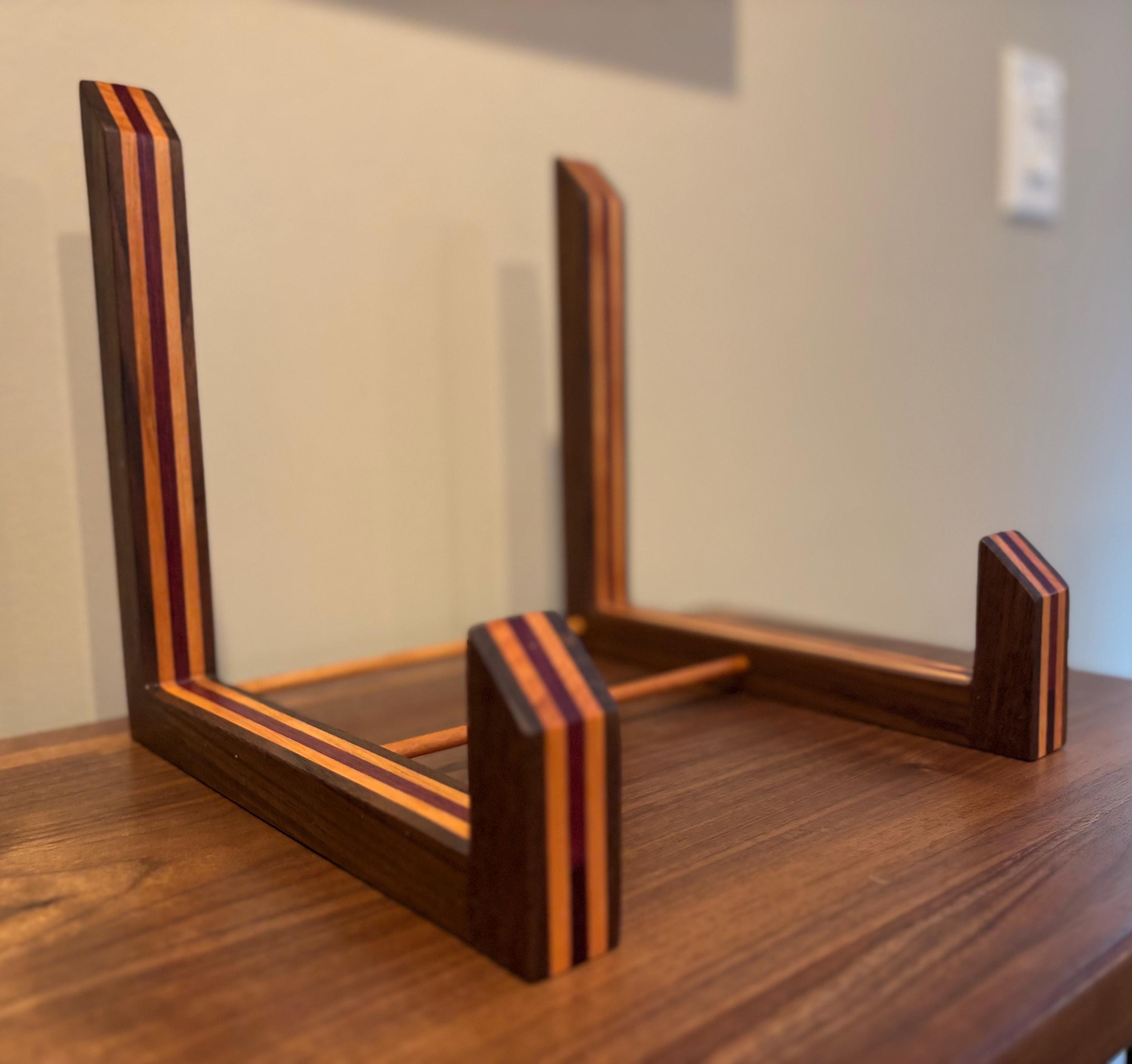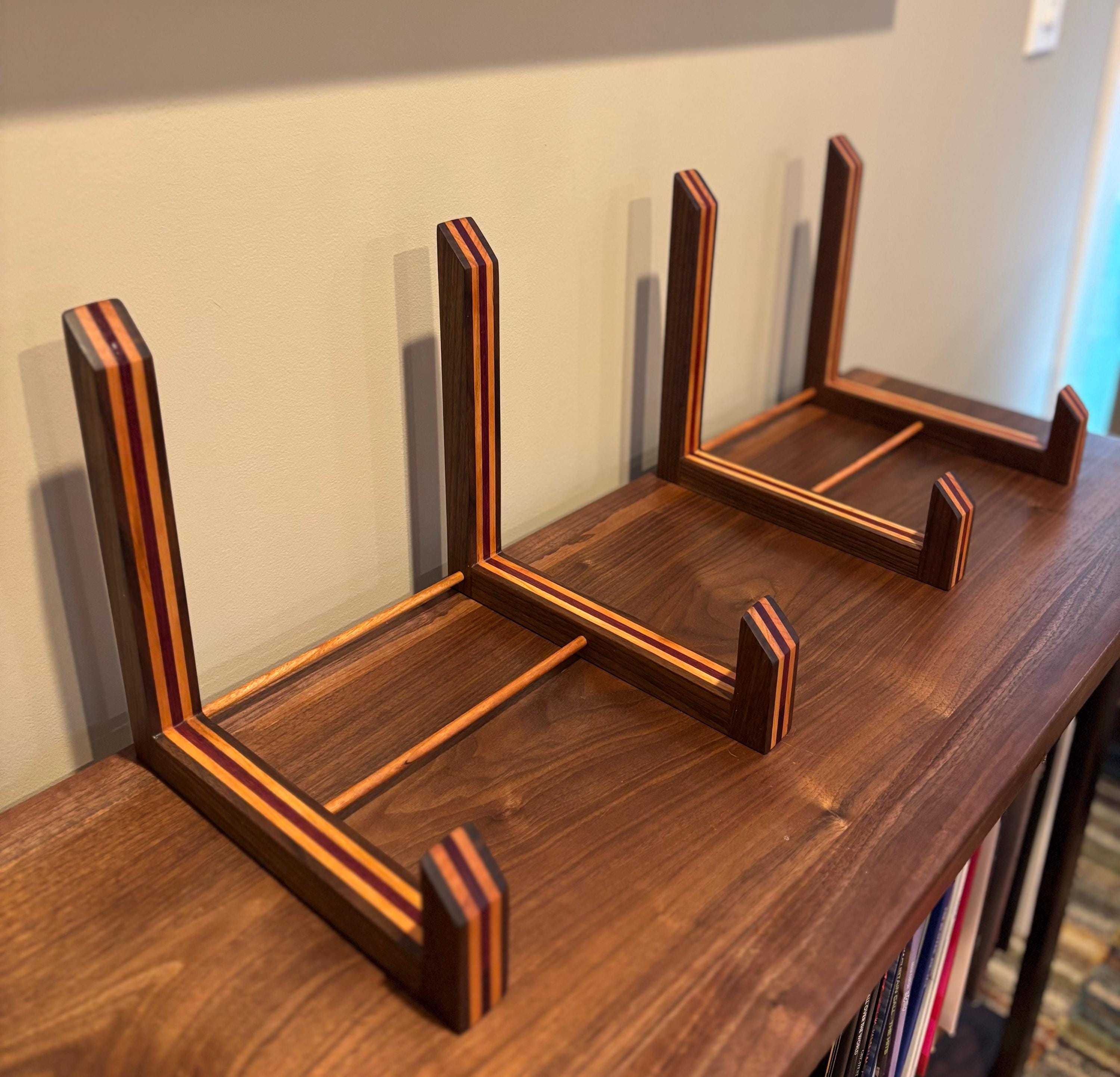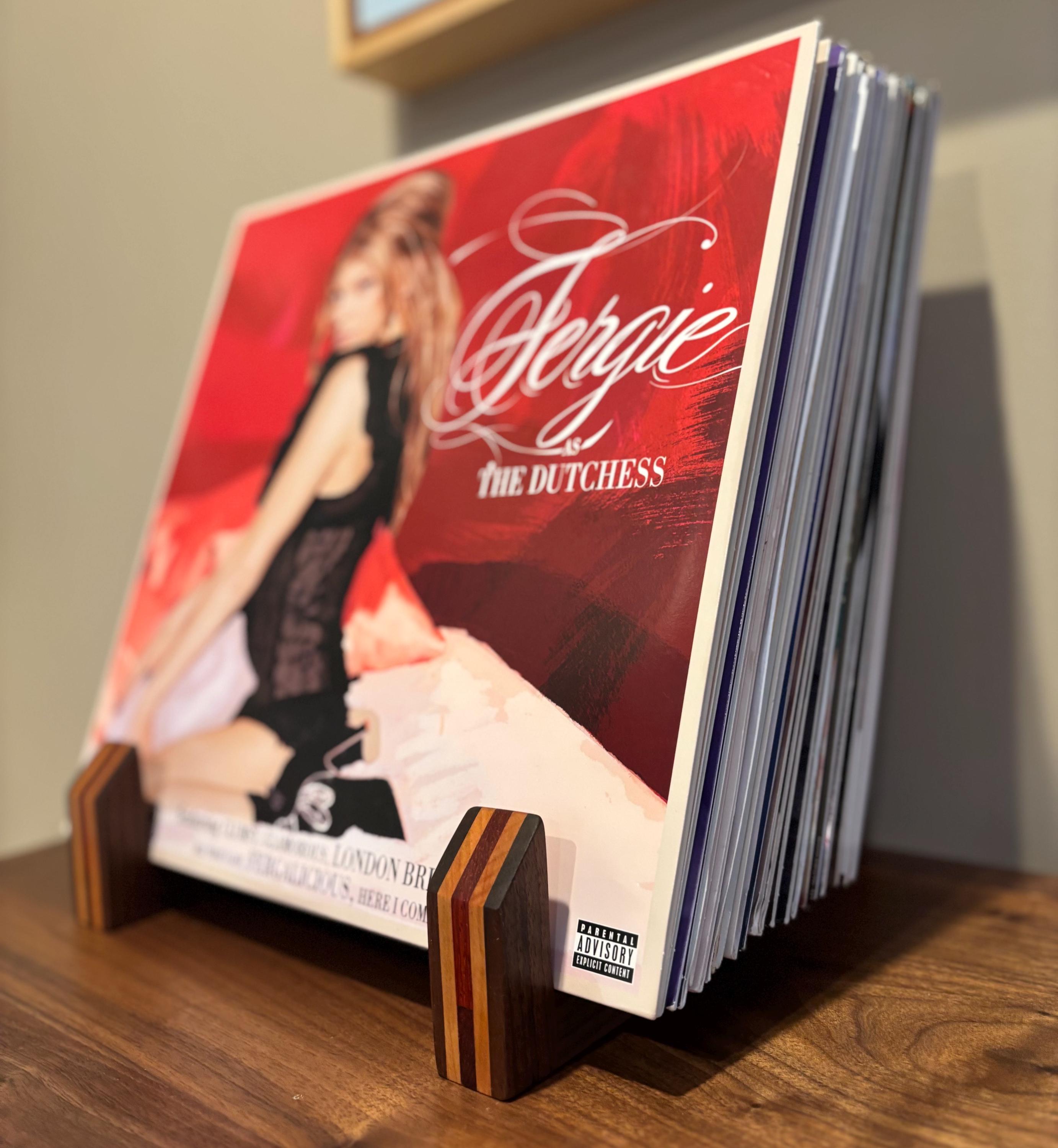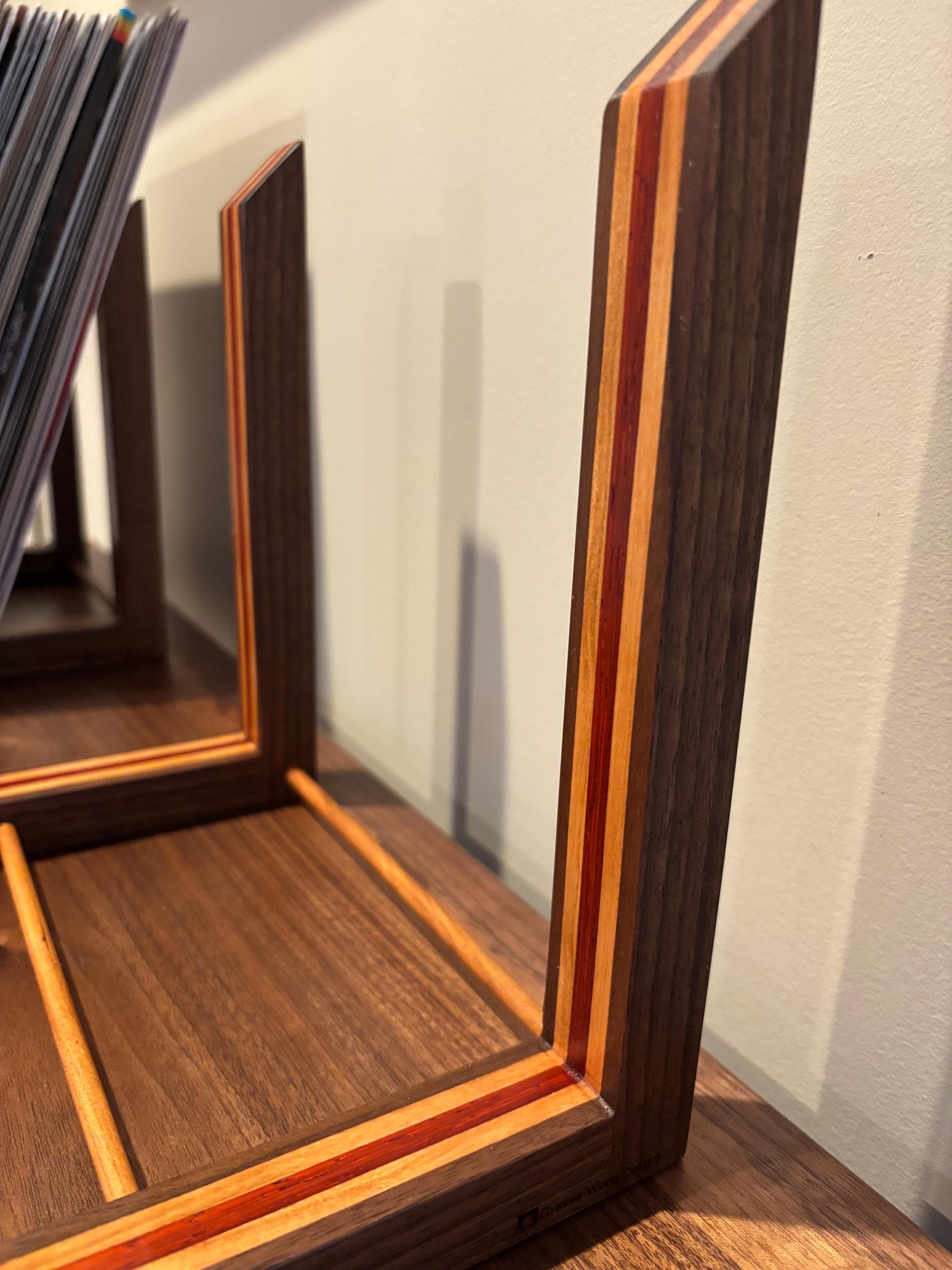 The sleek, timeless design of our rack and choice of vibrant accent stripes will fit into any decor, making it a must-have for vinyl lovers and home decorators alike. Choose from a purple stripe (purpleheart) or red stripe (padauk). All colors reflect the natural color of the woods, no stains or dyes, here, just the natural color of the wood. Whether you're showcasing vintage finds or the latest releases, this flip rack is the ideal solution for turning your collection into a stunning focal point.