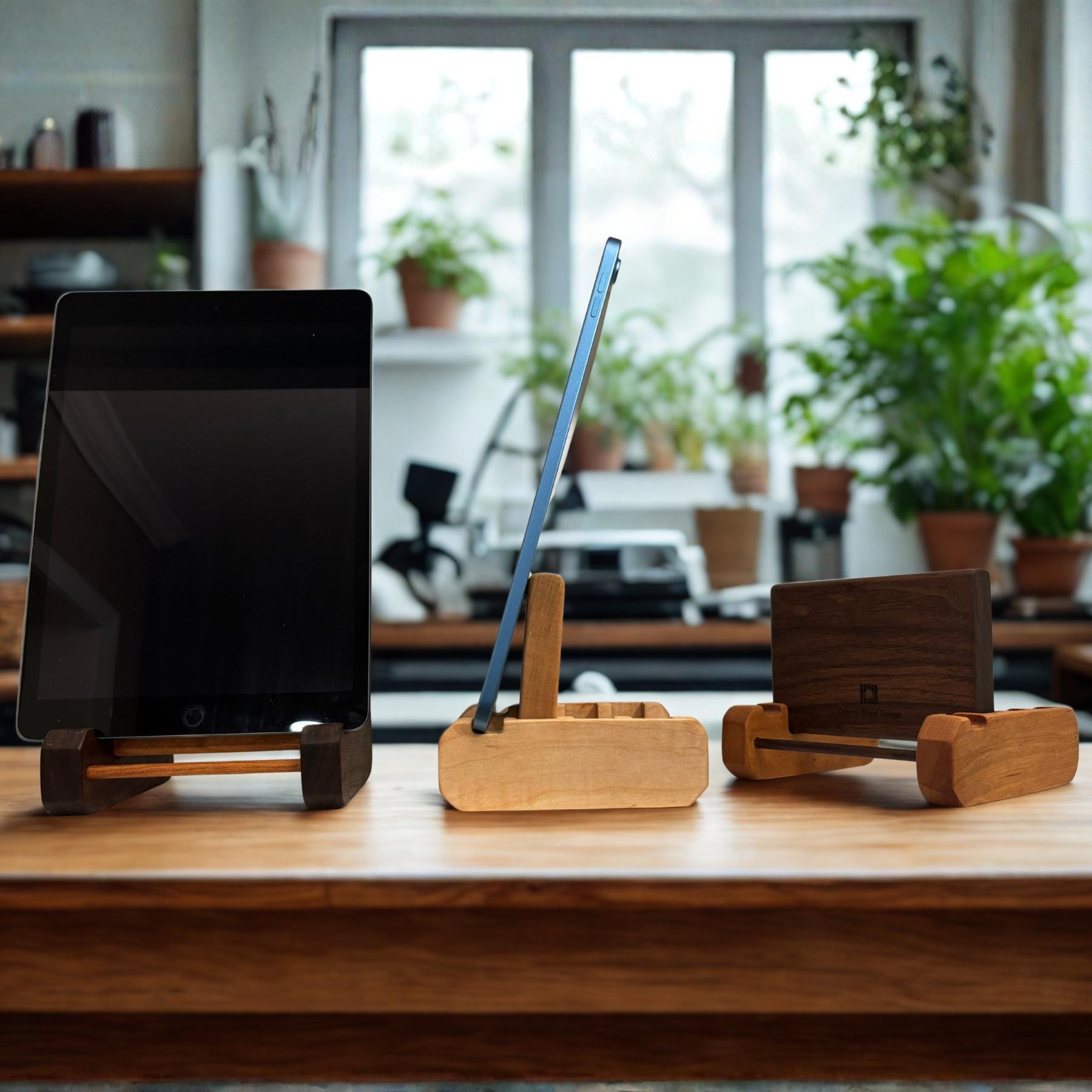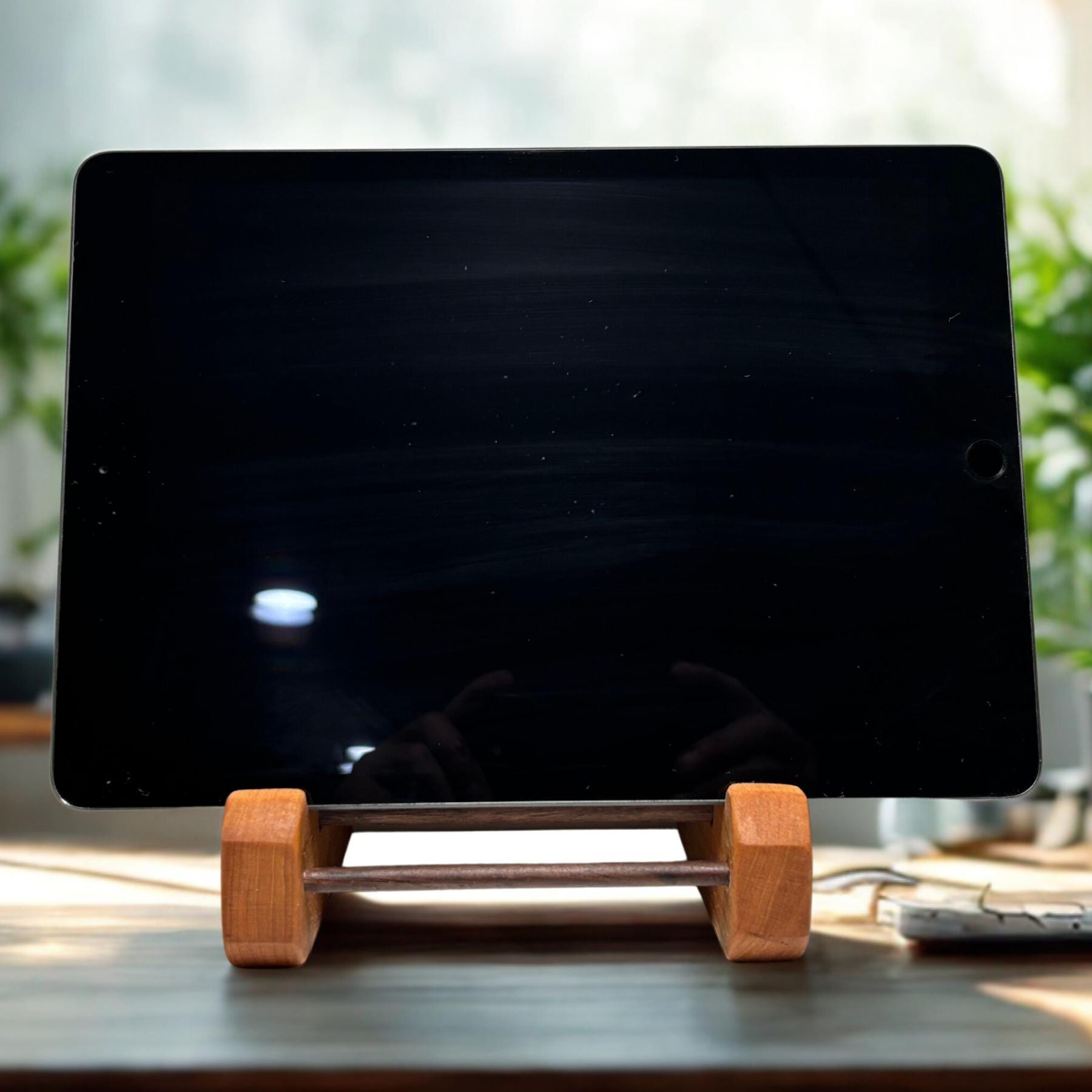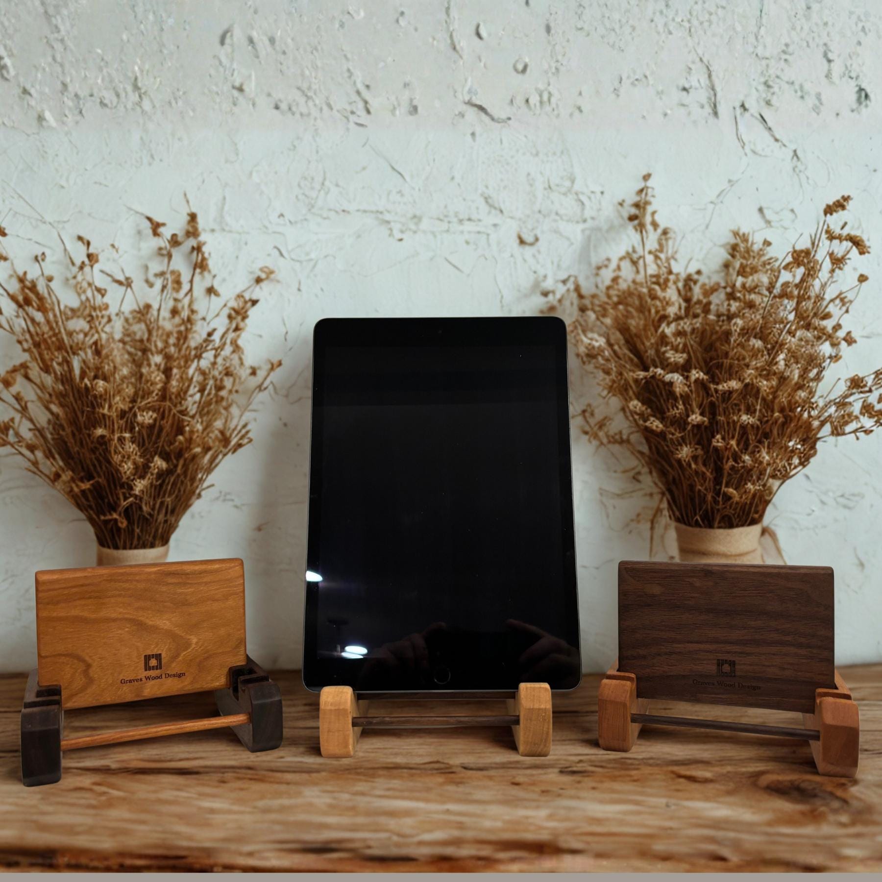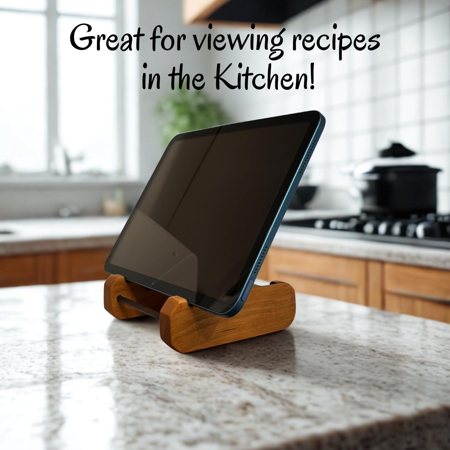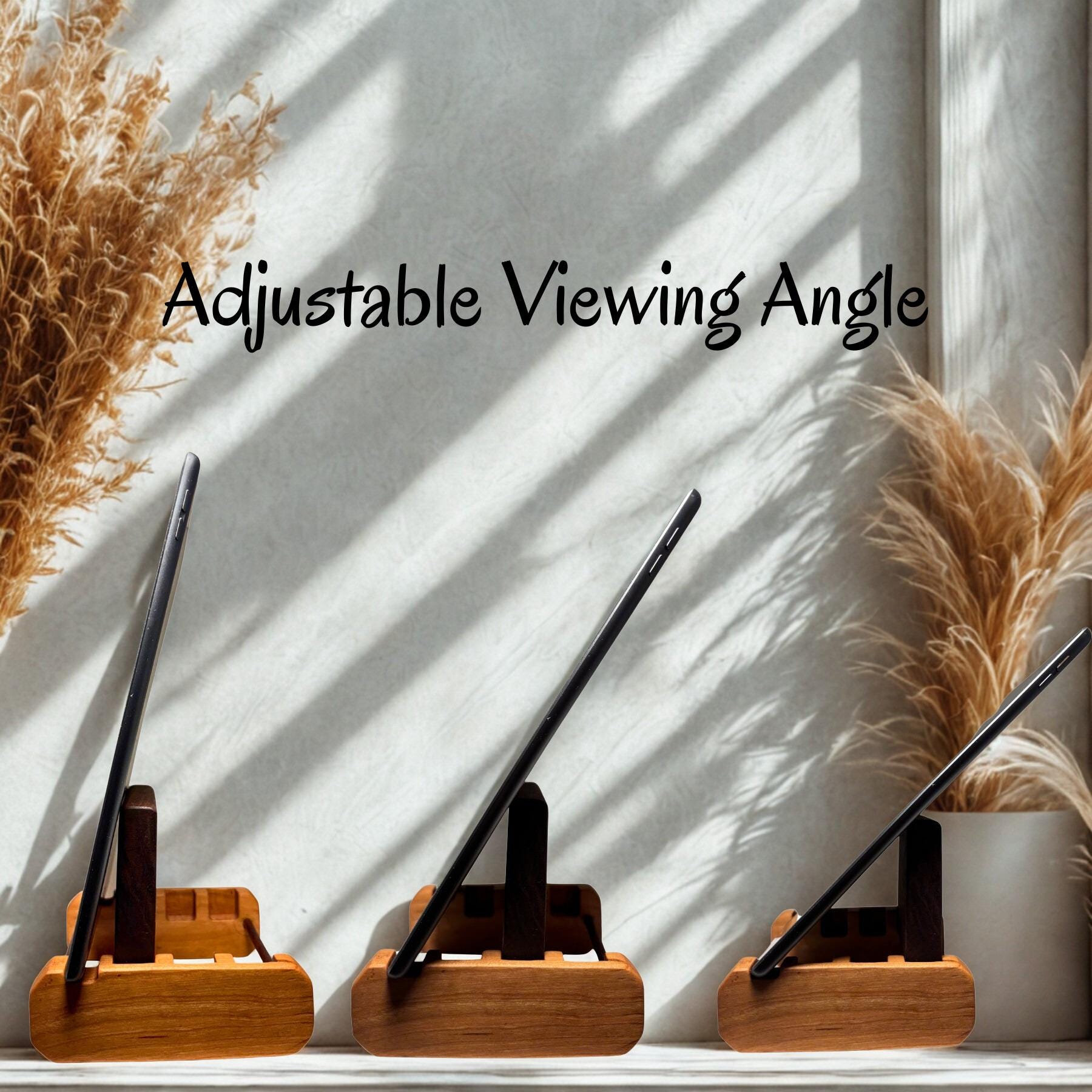 Introducing our Adjustable Wooden iPad Stand. Crafted from solid hardwoods, and available in a multitude of wood color combinations, this stand not only elevates your device, but also enhances your decor. Its warm wood tones and beautiful design complements any room, whether you're working from home, watching movies, or following recipes in the kitchen.
