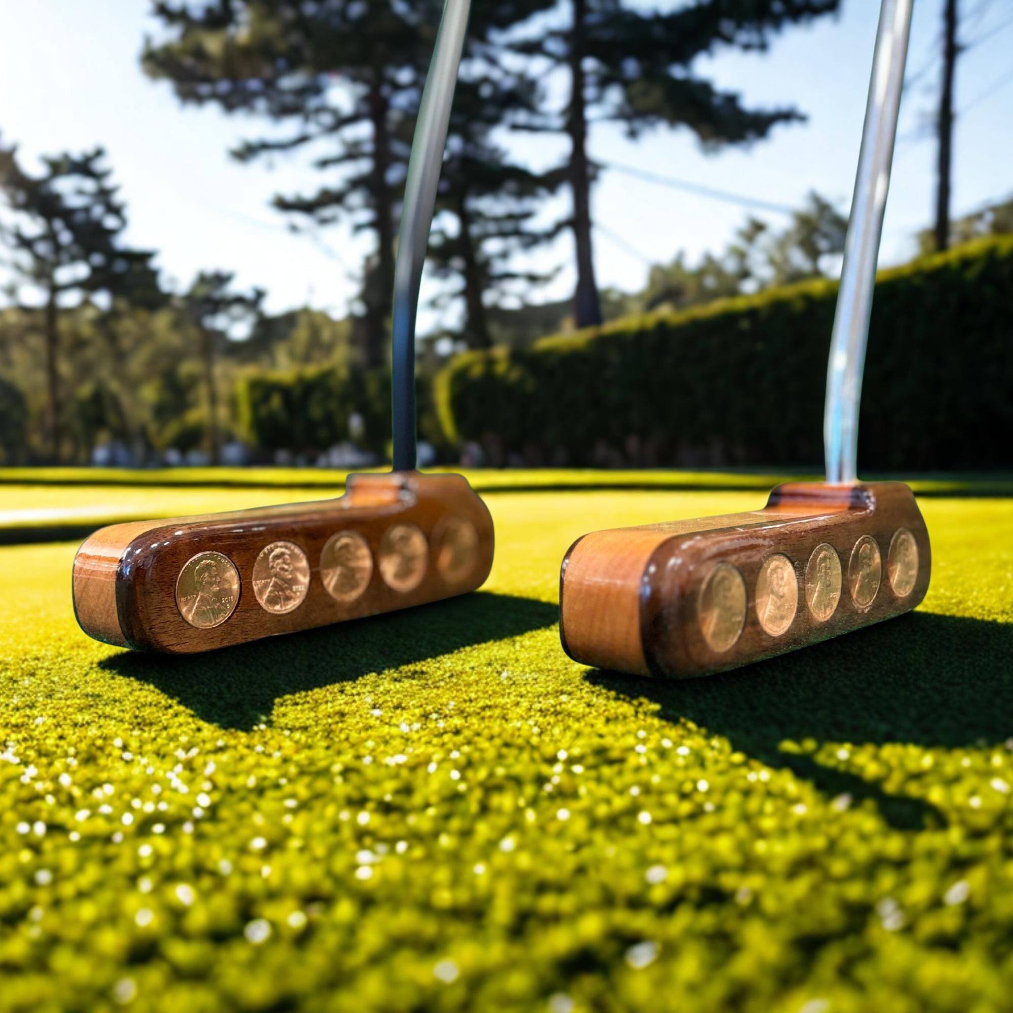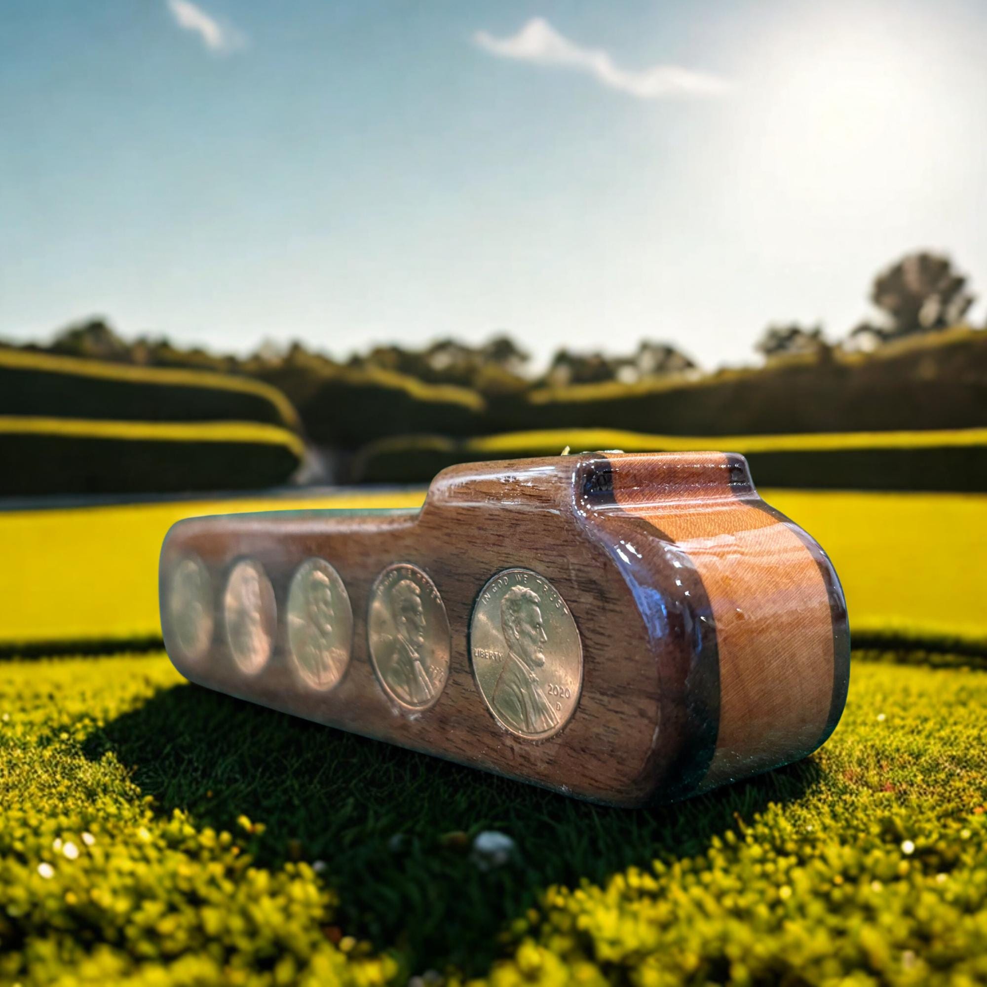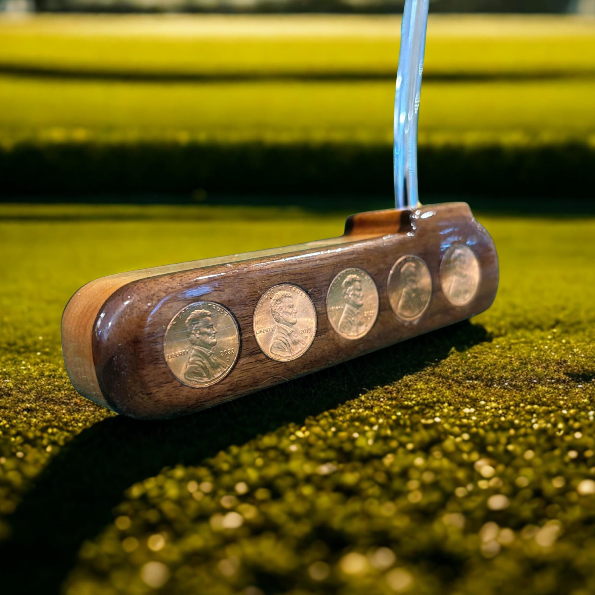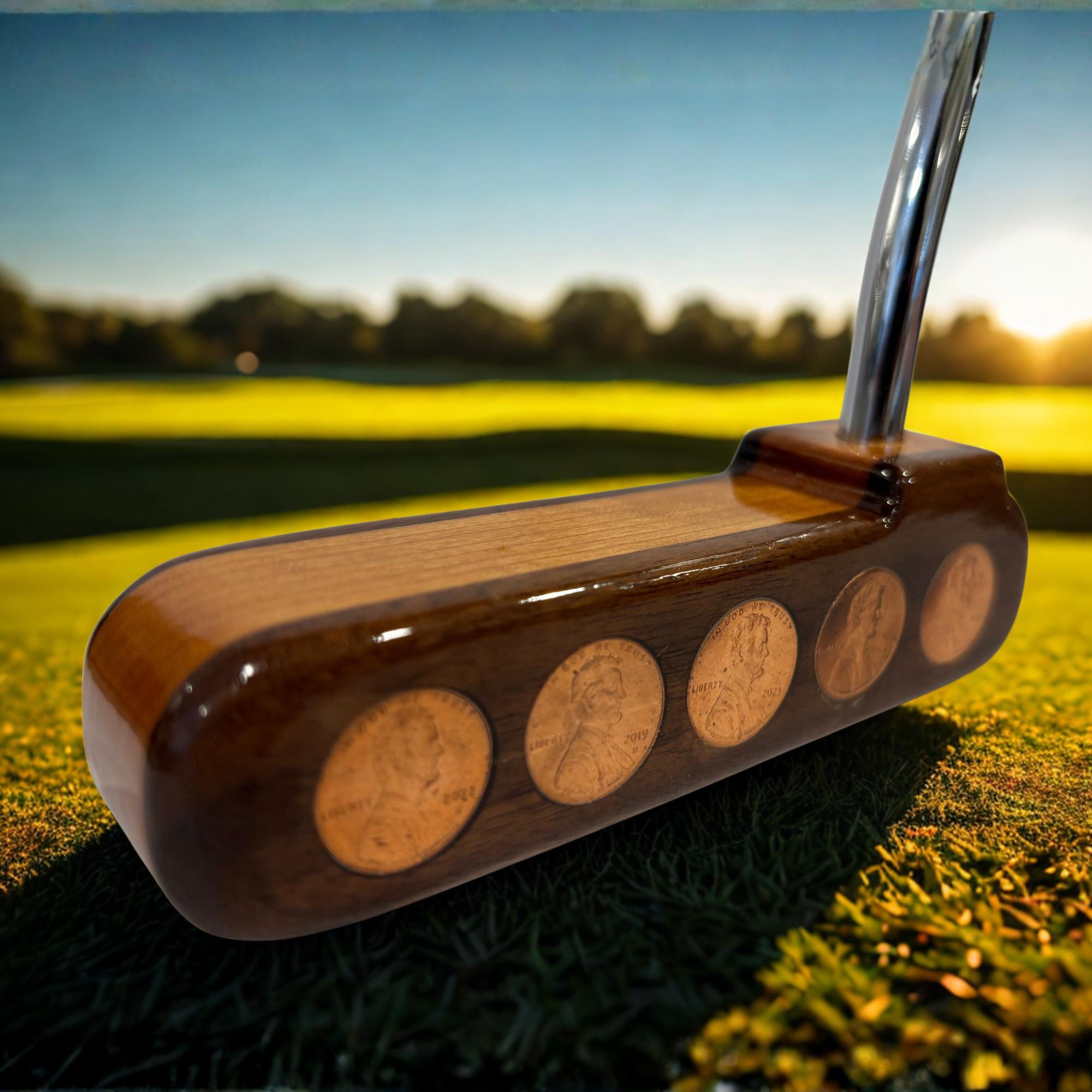 Exquisite Craftsmanship: The head of this putter is made from Walnut and Cherry, renowned for their richness and beauty, and embedded with 10 pennies. The front of the putter shows the face side of the penny, while the back of the blade showcases the tail side of the penny, making every putter a unique and eye-catching conversation starter.