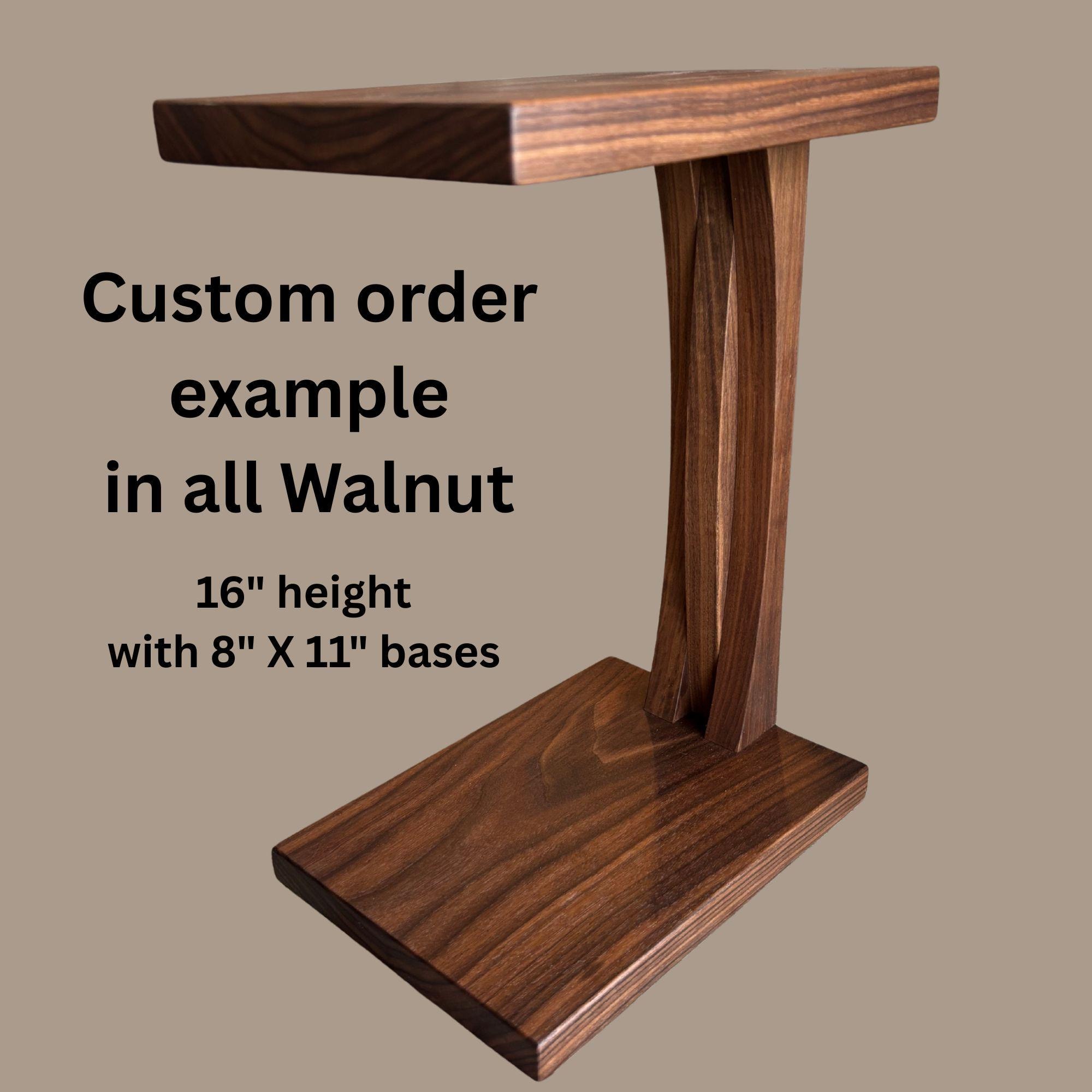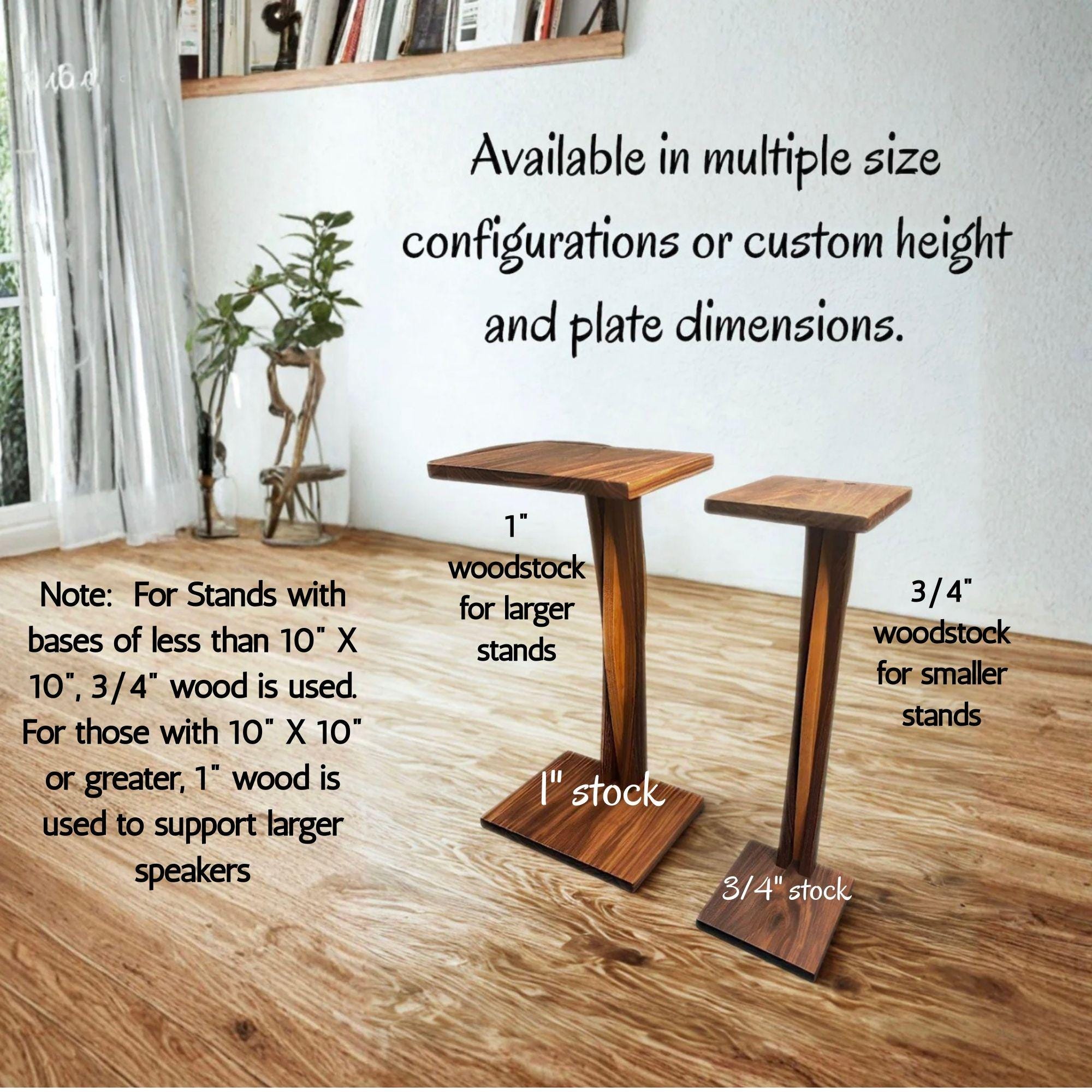 There are several sizes to choose from to accommodate popular speaker sizes. Stands with the 7.25” wide base are made using 3/4” thick woodstock (base, pillar, & top). Larger stands (10 x 10 plus) are made with 1” thick woodstock (base, pillar, & top) for added support of larger speakers. Please message me for pricing if you need a custom size.