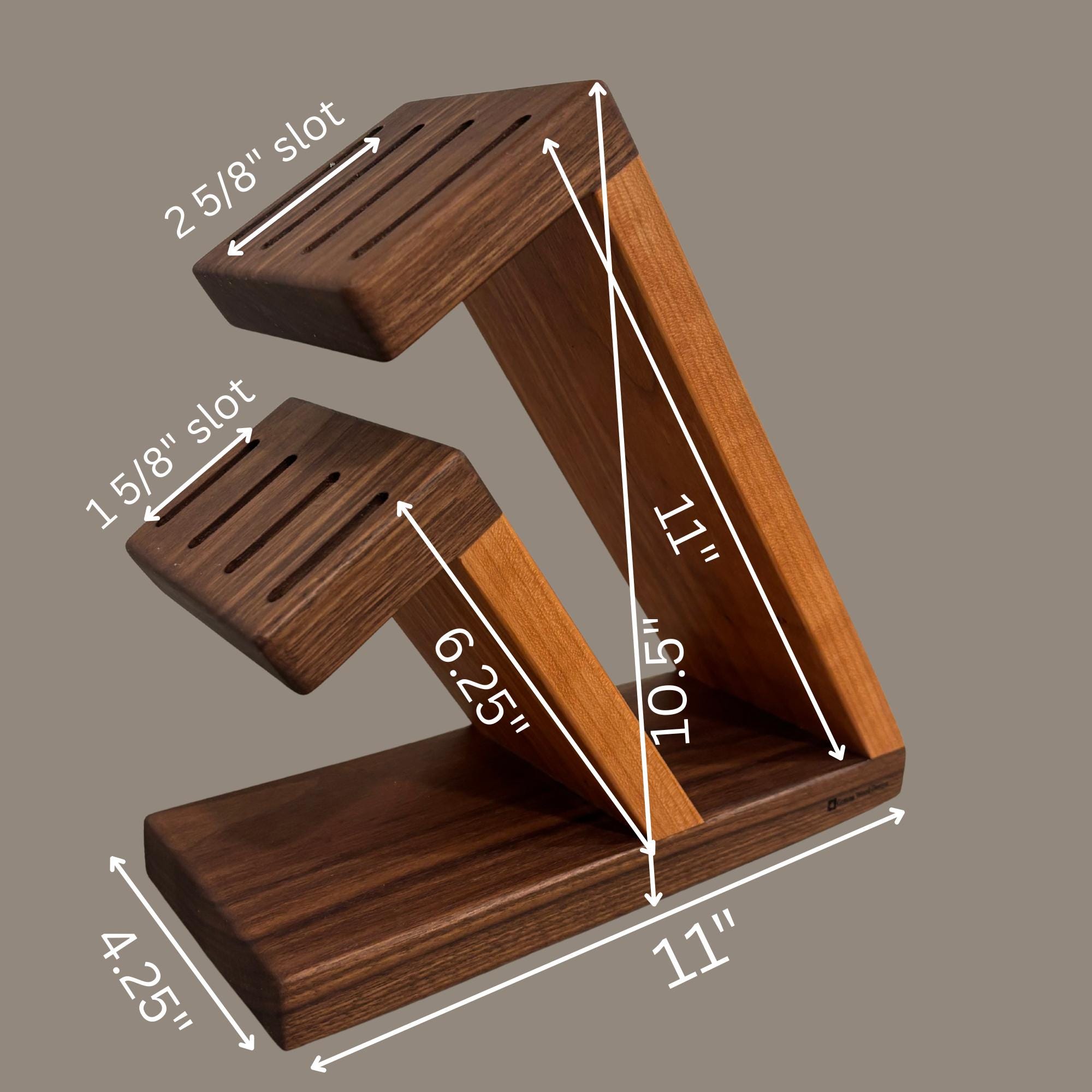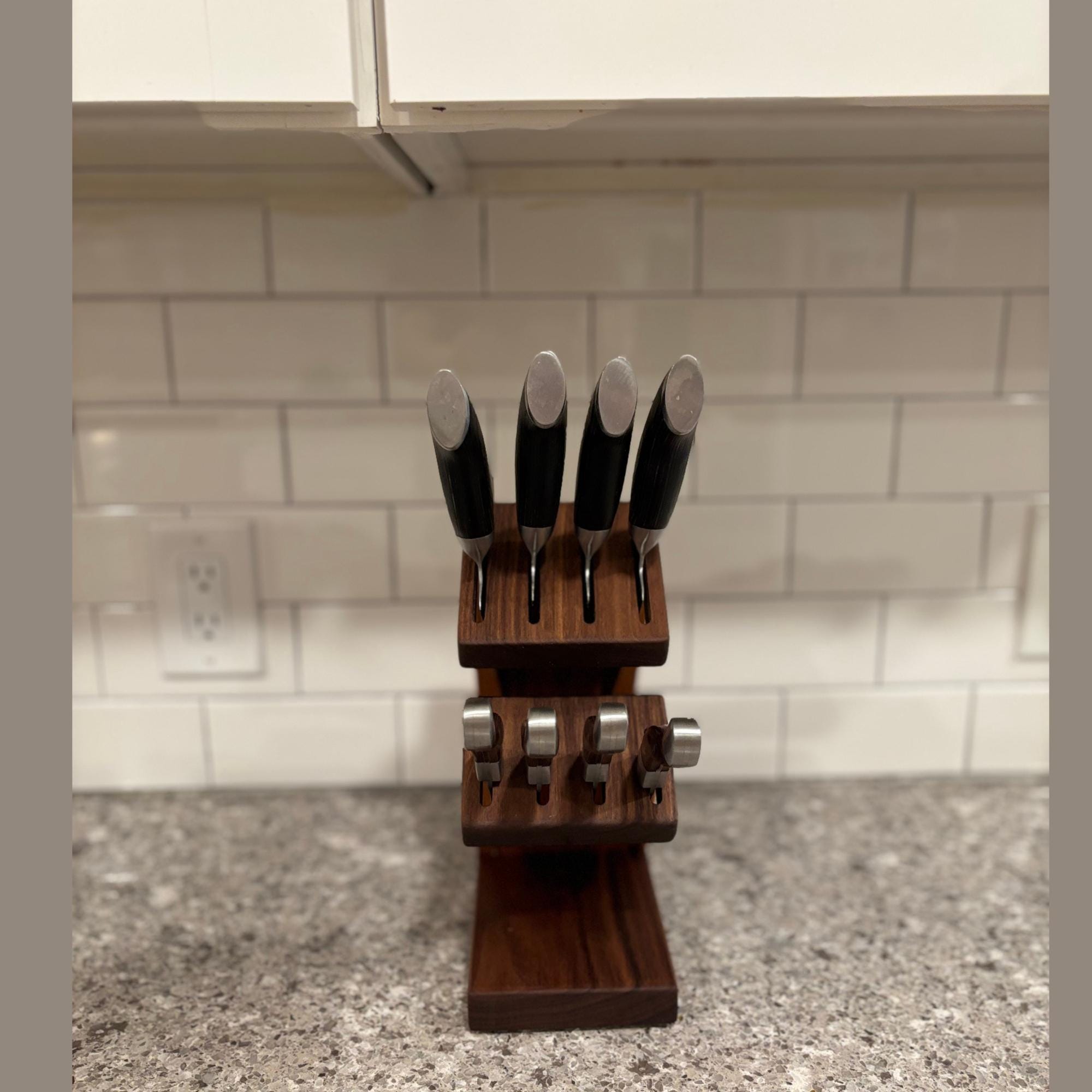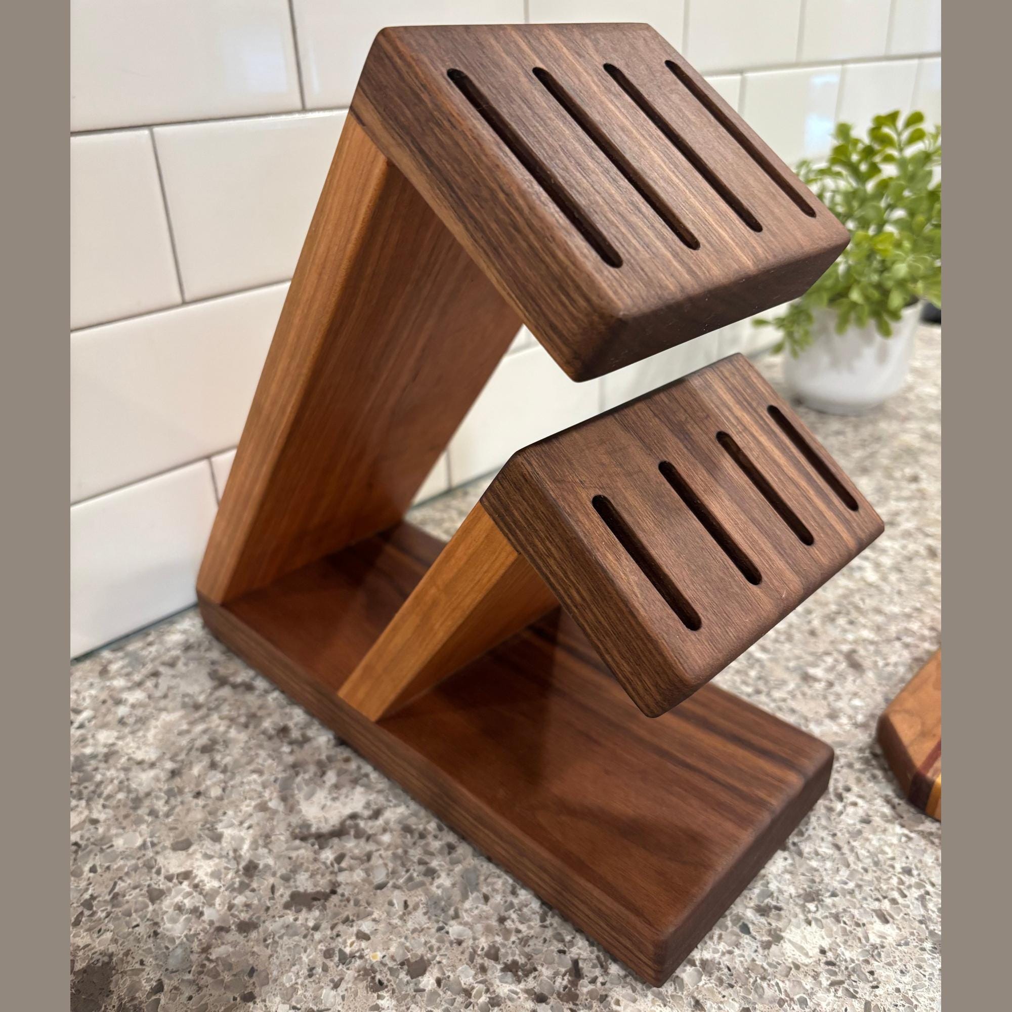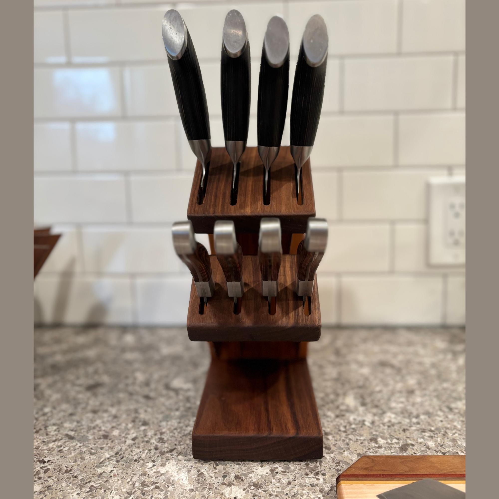 Show off your knives with this compact and stunning magnetic assist knife block. Beautiful Walnut is paired with rich Cherry to organize and hold your knives. 8 total slots, 1/4" wide and 7/8" apart, give you ample room for knives of varying handle width. The top section can accommodate blade lengths of up to 11" and the bottom section can accommodate blade lengths up to 6.25". High strength neodymium bar magnets in the walnut slotted sections help keep your knives in place. Whether you're a budding chef or a seasoned home cook, this unique, eye catching storage and display solution will keep your cutlery organized and within easy reach. With its timeless contemporary design (One that doesn't look like every other knife block at every other store in America) and functional features, this knife block is the perfect way to elevate the look of your kitchen. Your knives will thank you for giving them a beautiful place to call home and your friends will be envious of your style.