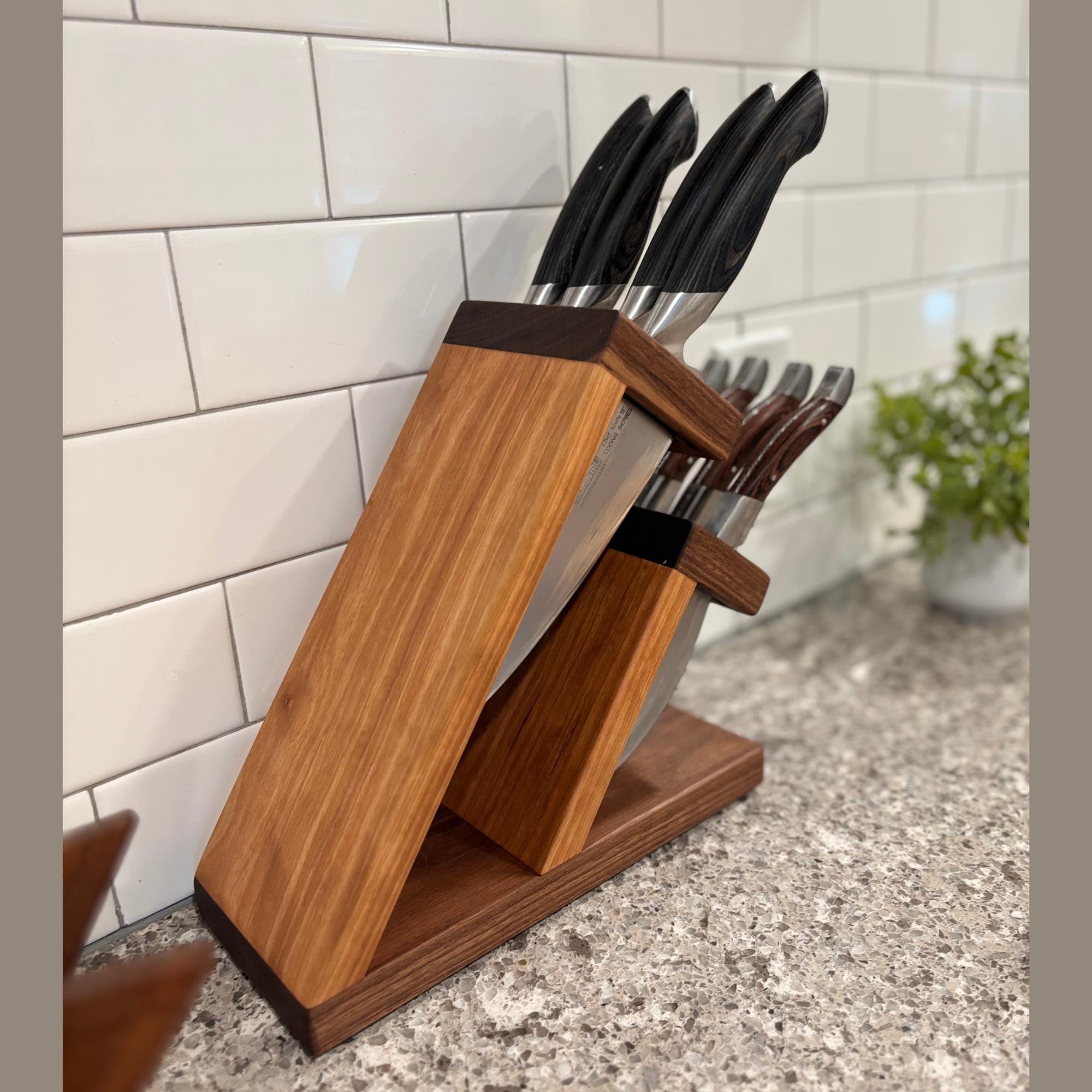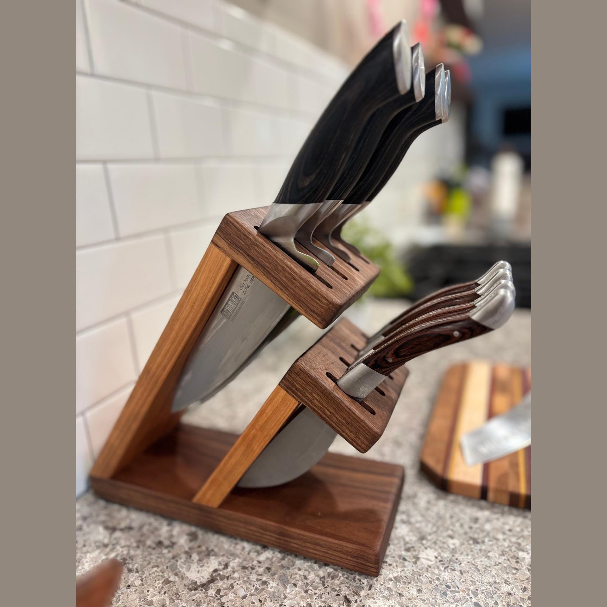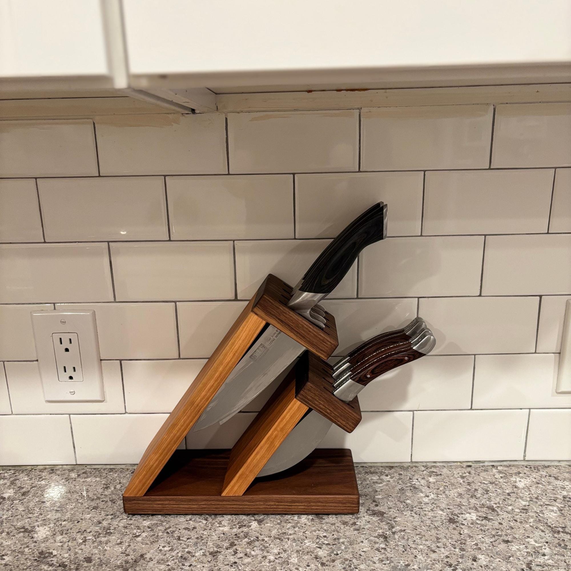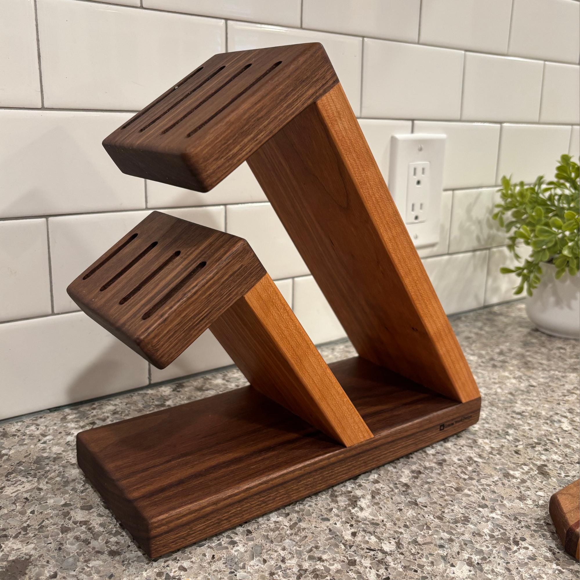 Show off your knives with this compact and stunning magnetic assist knife block. Beautiful Walnut is paired with rich Cherry to organize and hold your knives. 8 total slots, 1/4" wide and 7/8" apart, give you ample room for knives of varying handle width. The top section can accommodate blade lengths of up to 11" and the bottom section can accommodate blade lengths up to 6.25". High strength neodymium bar magnets in the walnut slotted sections help keep your knives in place. Whether you're a budding chef or a seasoned home cook, this unique, eye catching storage and display solution will keep your cutlery organized and within easy reach. With its timeless contemporary design (One that doesn't look like every other knife block at every other store in America) and functional features, this knife block is the perfect way to elevate the look of your kitchen. Your knives will thank you for giving them a beautiful place to call home and your friends will be envious of your style.