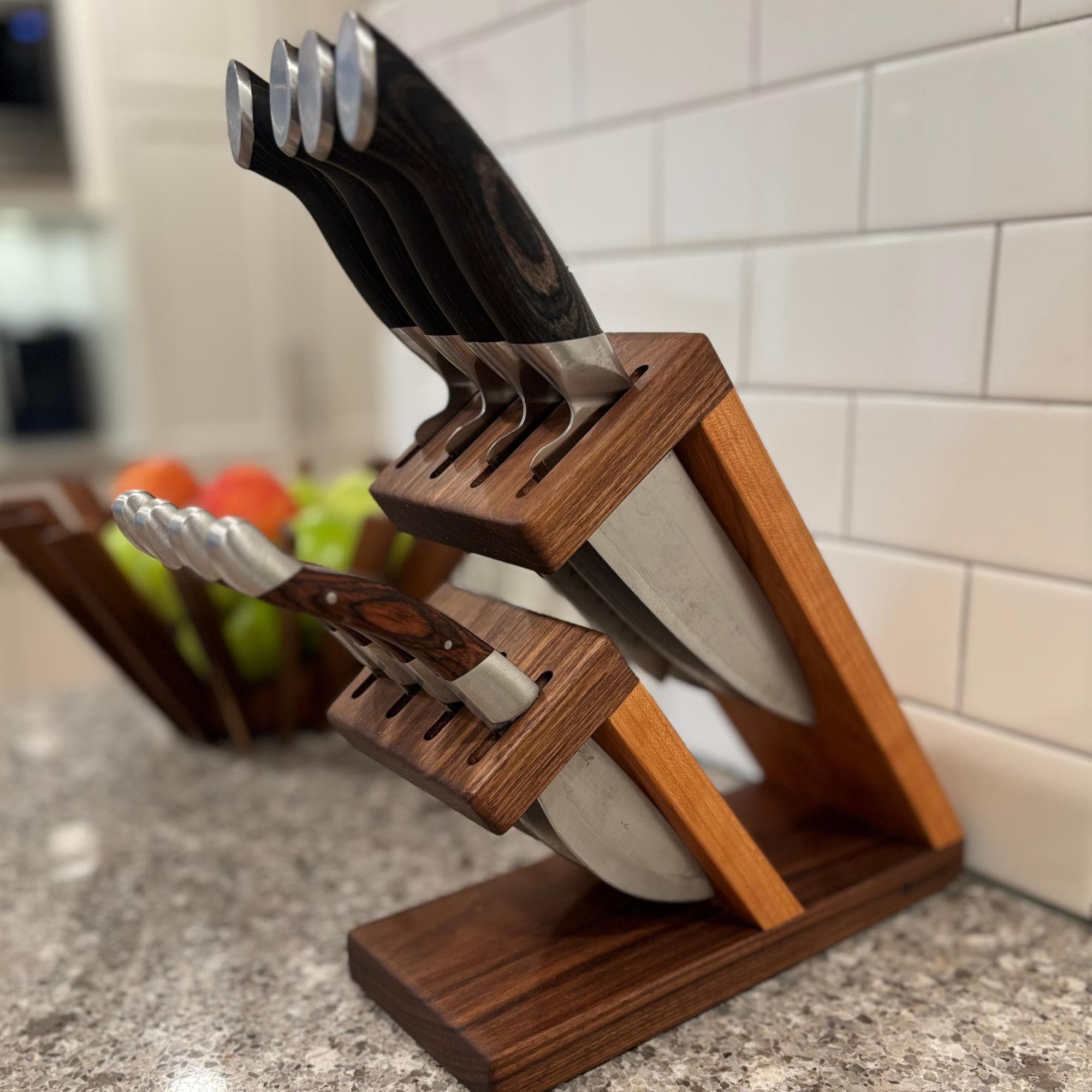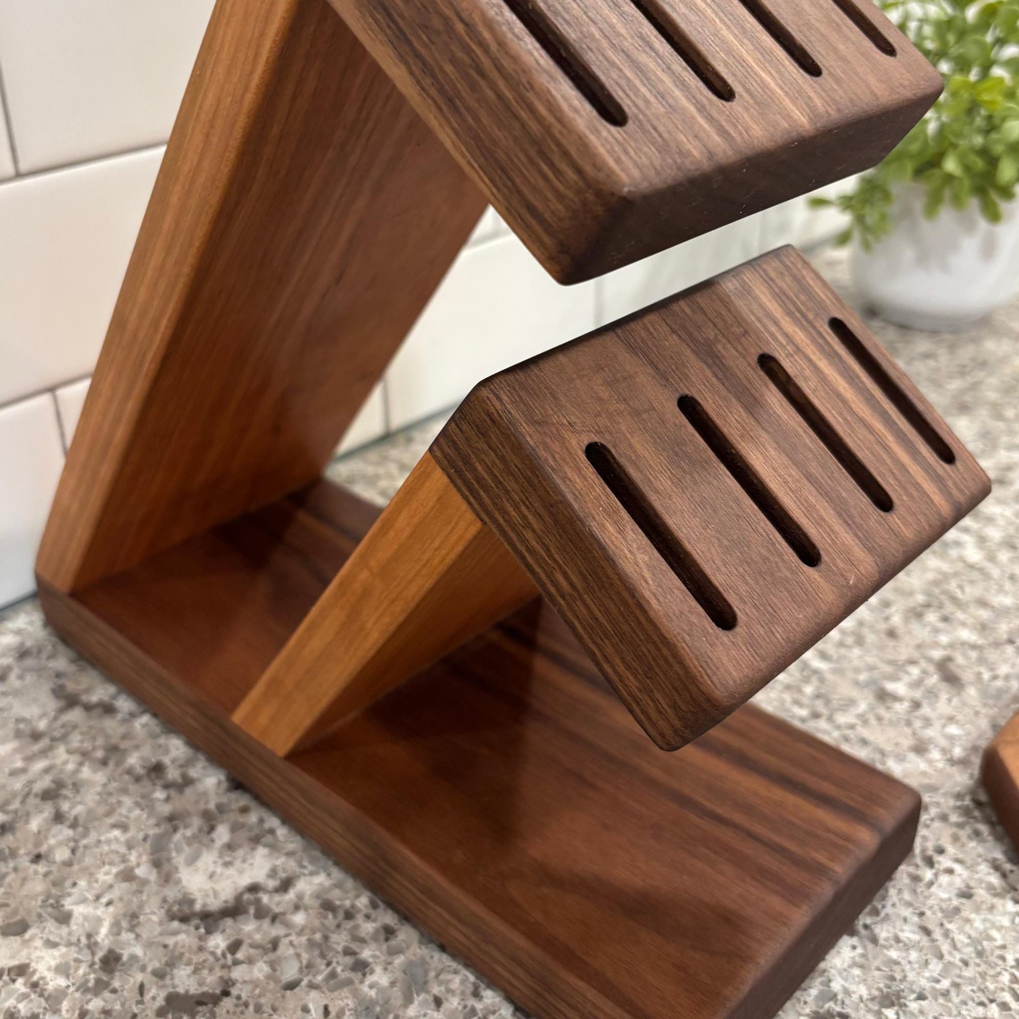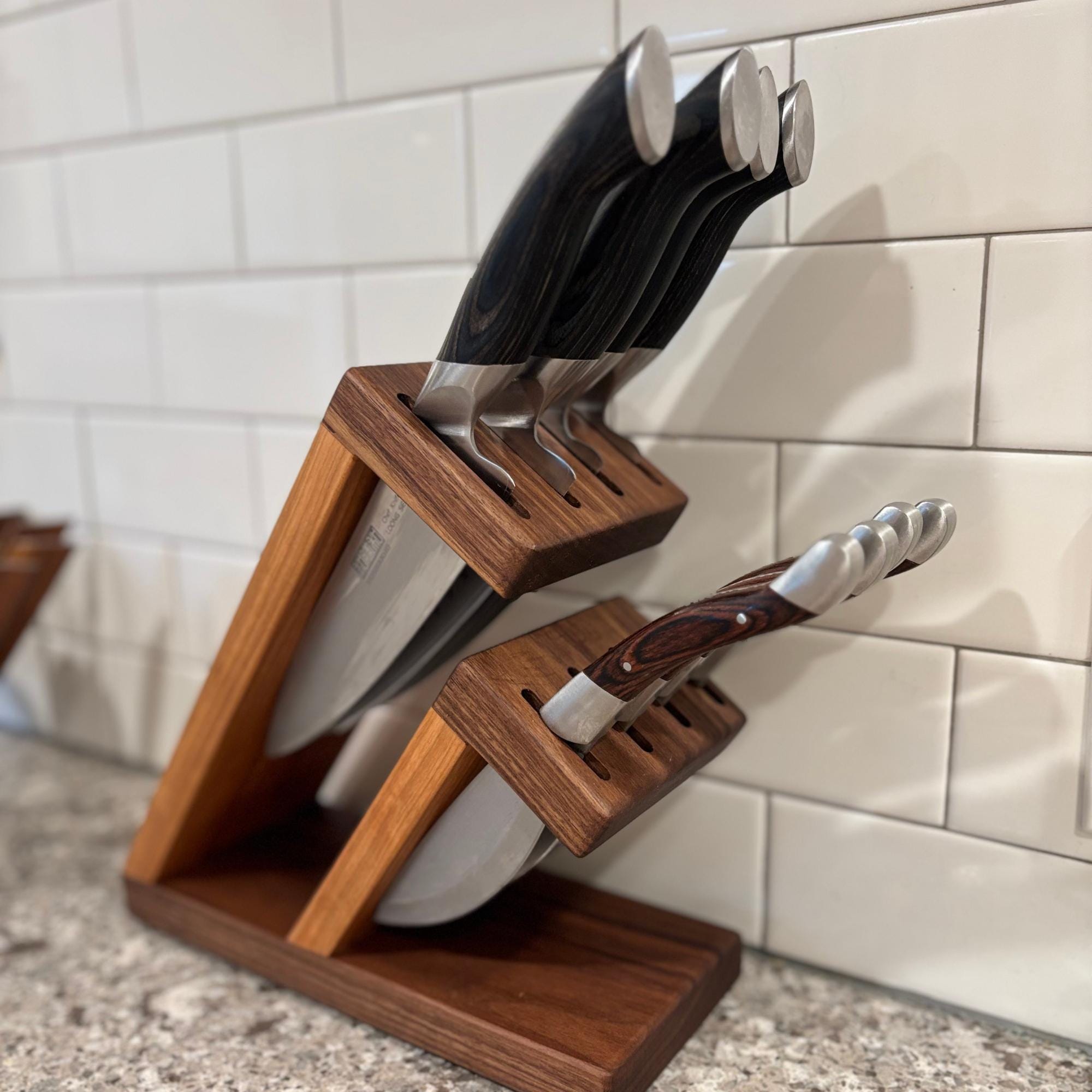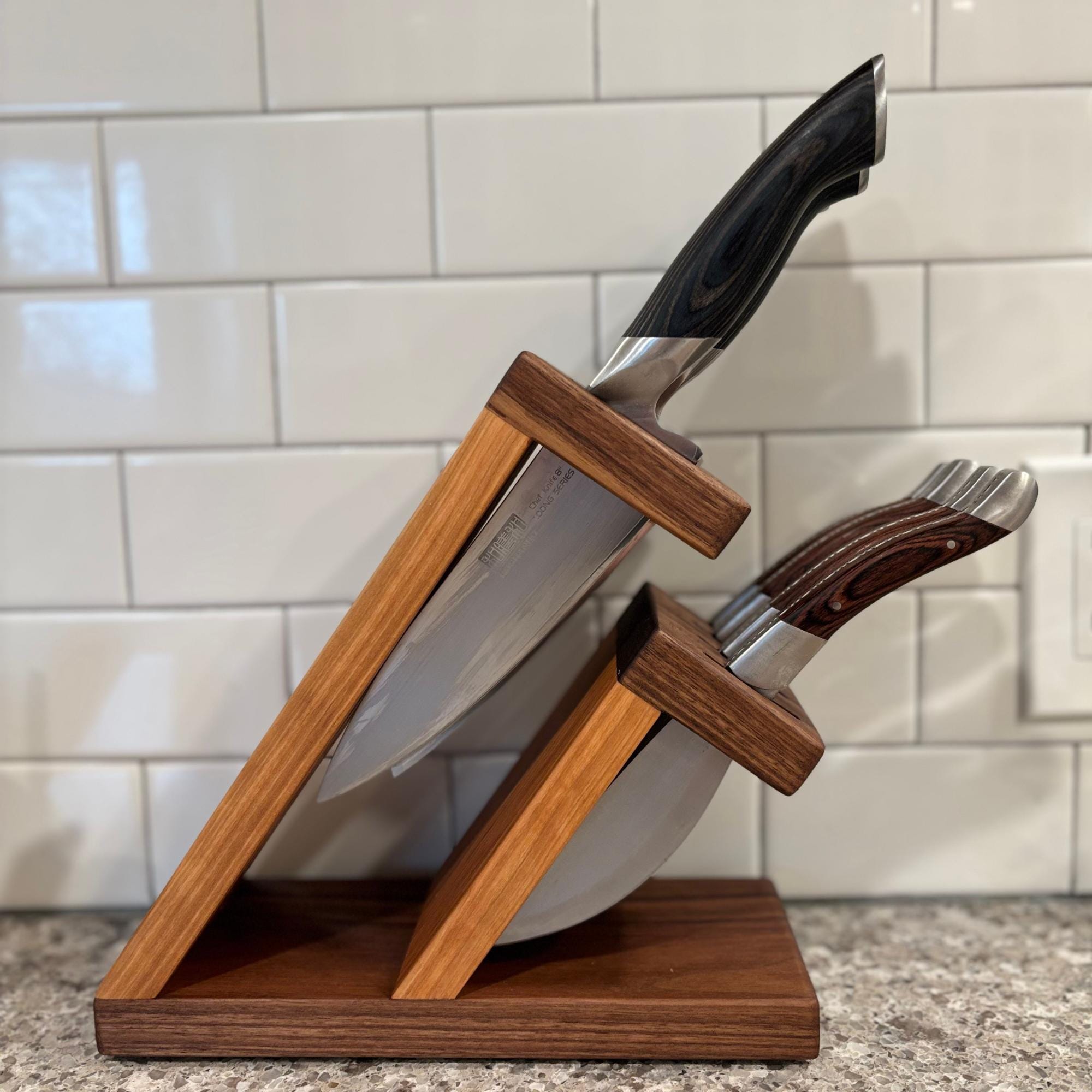 Show off your knives with this compact and stunning magnetic assist knife block. Beautiful Walnut is paired with rich Cherry to organize and hold your knives. 8 total slots, 1/4" wide and 7/8" apart, give you ample room for knives of varying handle width. The top section can accommodate blade lengths of up to 11" and the bottom section can accommodate blade lengths up to 6.25". High strength neodymium bar magnets in the walnut slotted sections help keep your knives in place. Whether you're a budding chef or a seasoned home cook, this unique, eye catching storage and display solution will keep your cutlery organized and within easy reach. With its timeless contemporary design (One that doesn't look like every other knife block at every other store in America) and functional features, this knife block is the perfect way to elevate the look of your kitchen. Your knives will thank you for giving them a beautiful place to call home and your friends will be envious of your style.