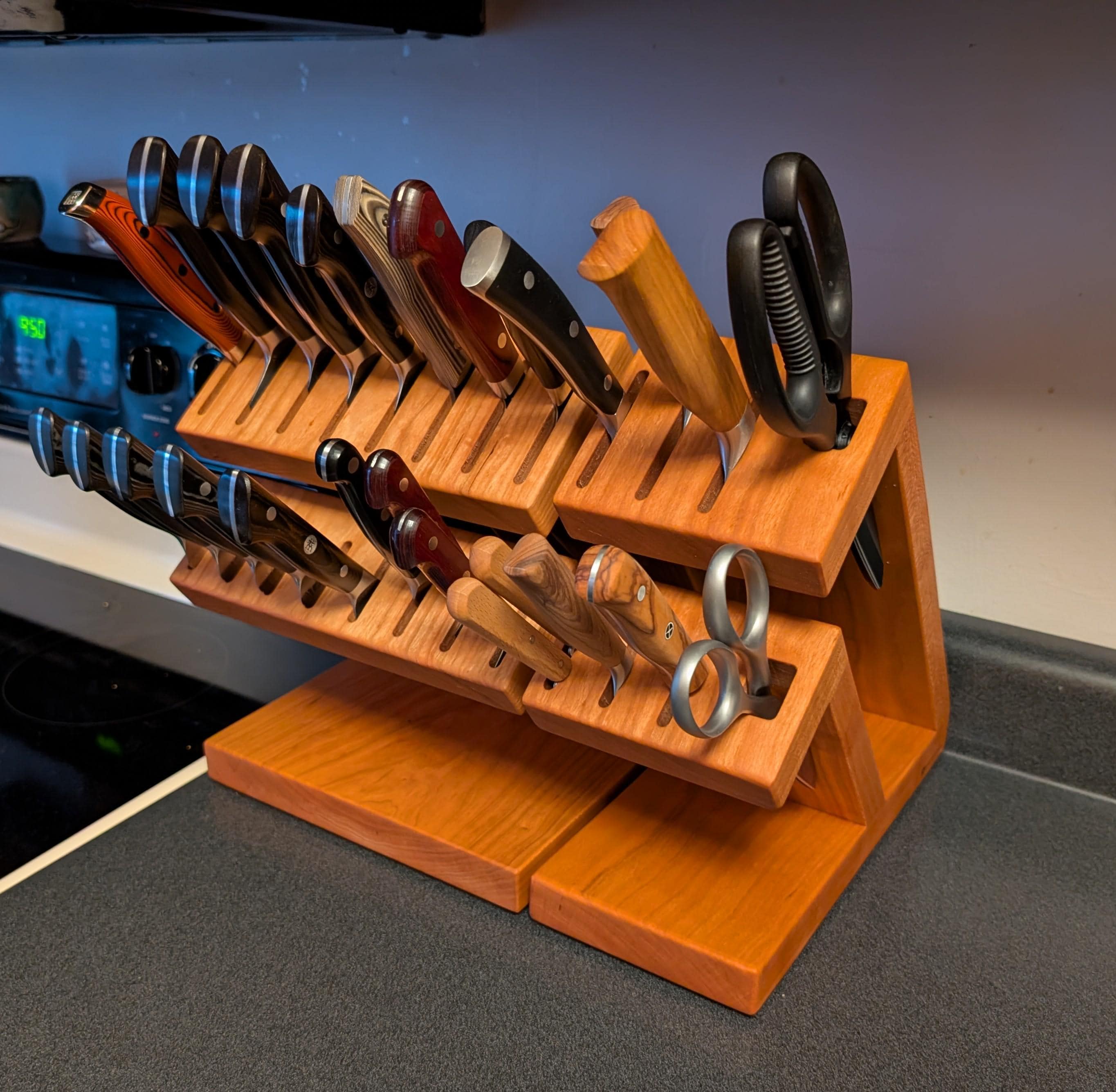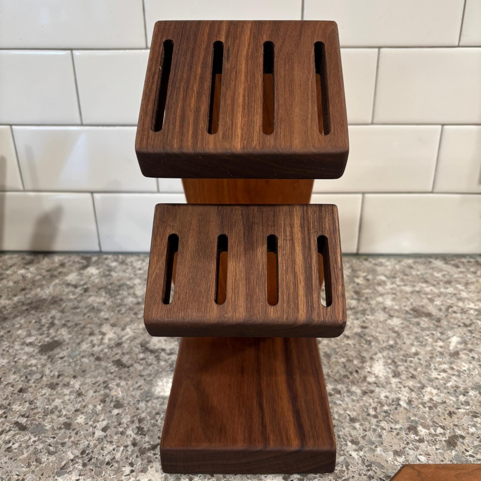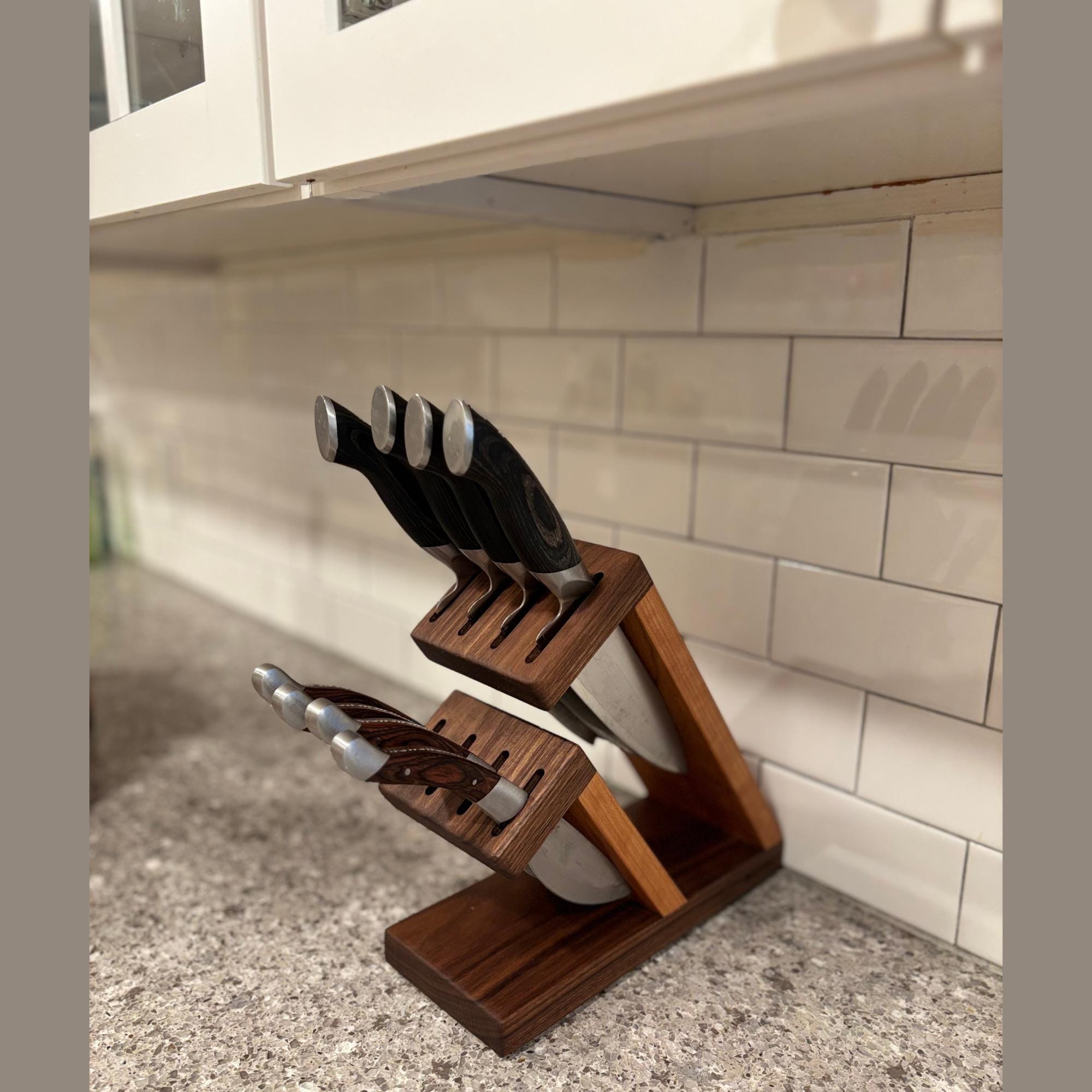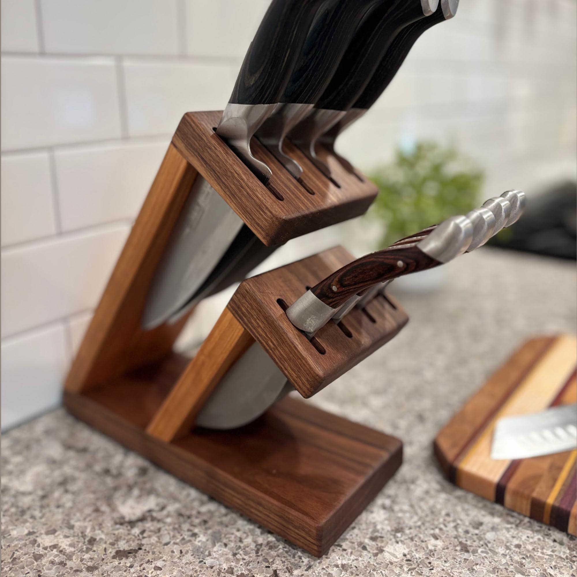 Show off your knives with this compact and stunning magnetic assist knife block. Beautiful Walnut is paired with rich Cherry to organize and hold your knives. 8 total slots, 1/4" wide and 7/8" apart, give you ample room for knives of varying handle width. The top section can accommodate blade lengths of up to 11" and the bottom section can accommodate blade lengths up to 6.25". High strength neodymium bar magnets in the walnut slotted sections help keep your knives in place. Whether you're a budding chef or a seasoned home cook, this unique, eye catching storage and display solution will keep your cutlery organized and within easy reach. With its timeless contemporary design (One that doesn't look like every other knife block at every other store in America) and functional features, this knife block is the perfect way to elevate the look of your kitchen. Your knives will thank you for giving them a beautiful place to call home and your friends will be envious of your style.
