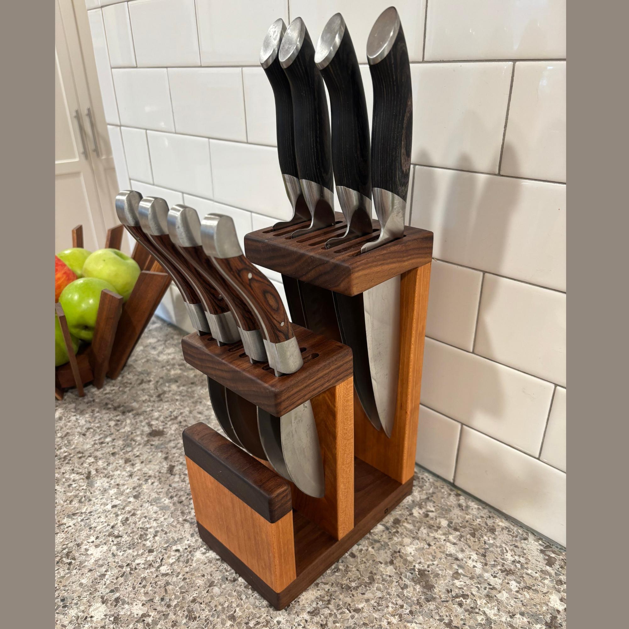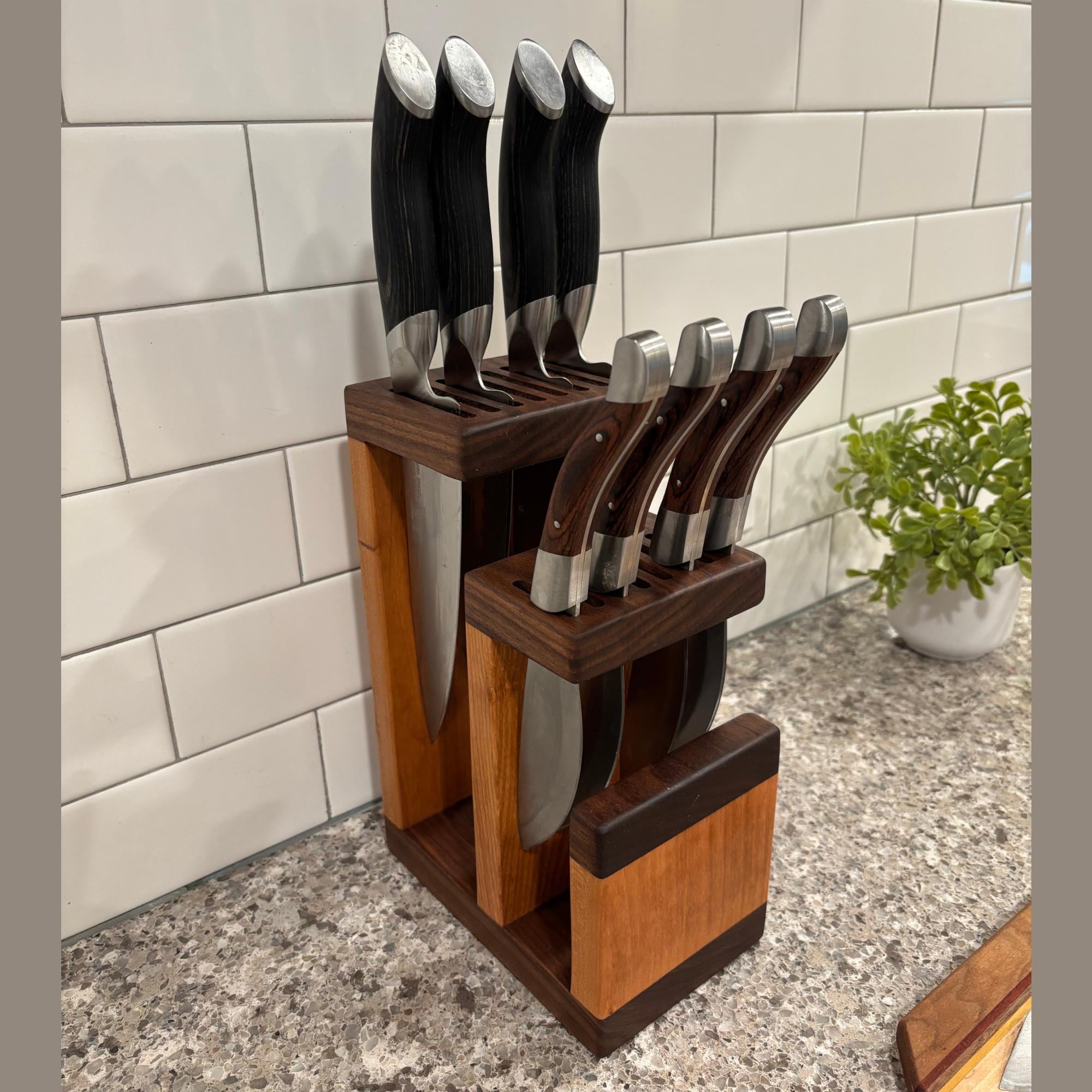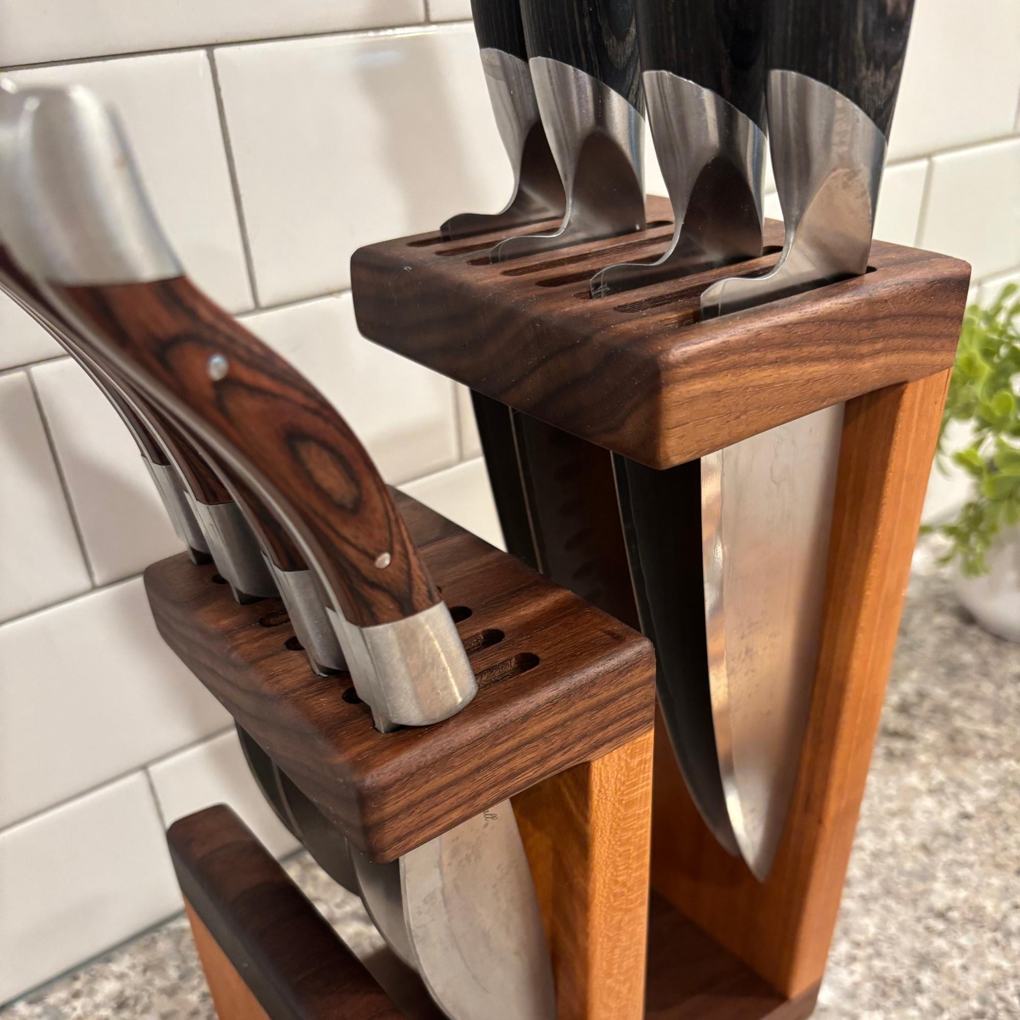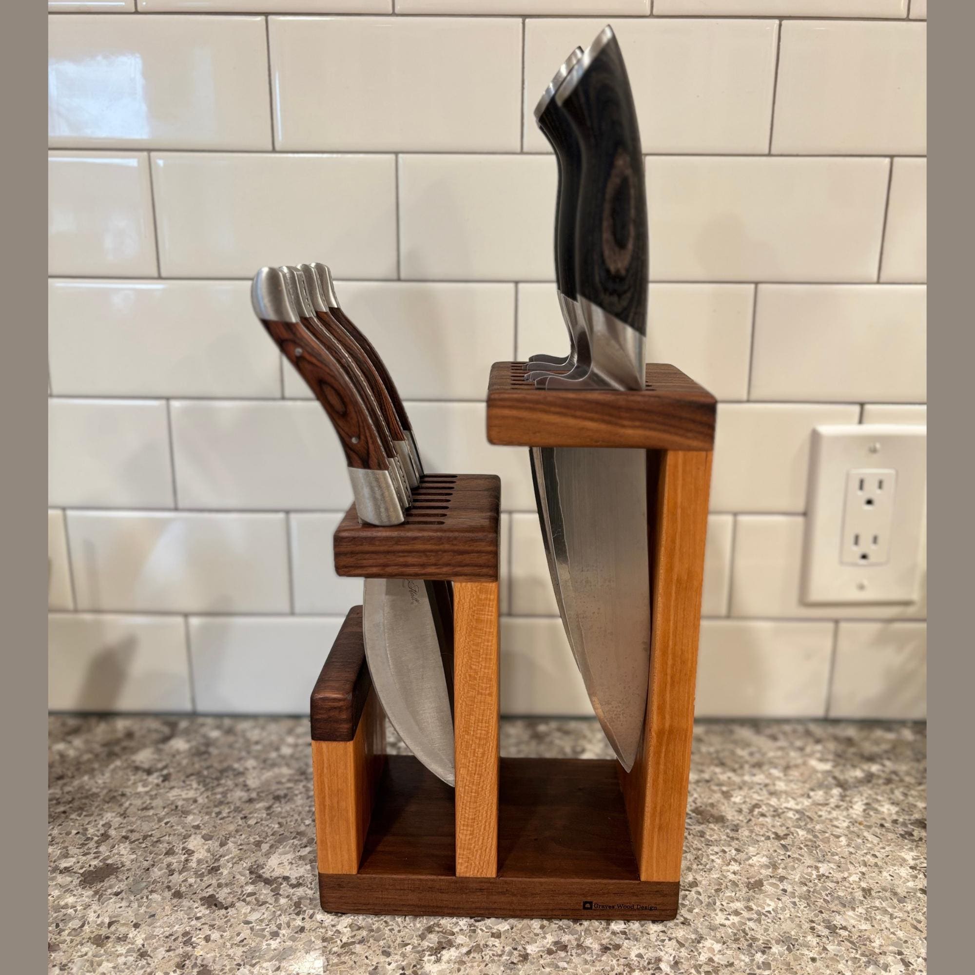 Give your kitchen knives a stylish and functional home with our compact and beautiful two tiered open style knife block. Handcrafted from high-quality hardwoods, this block features 16 knife slots and can accommodate 8+ knives of various sizes, ensuring they stay organized and easily accessible. Imagine the joy your knives would feel having a dedicated spot to rest in between kitchen tasks. The top area has 8 slots each 2.5" X 1/4", spaced 1/4" apart, designed for a variety of chef's knives. The lower area also has 8 slots, each 1 5/8" X 1/4", spaced 1/4" apart and is designed for steak knives and smaller paring knives. Treat your knives to the luxury they deserve with this stunning knife block.