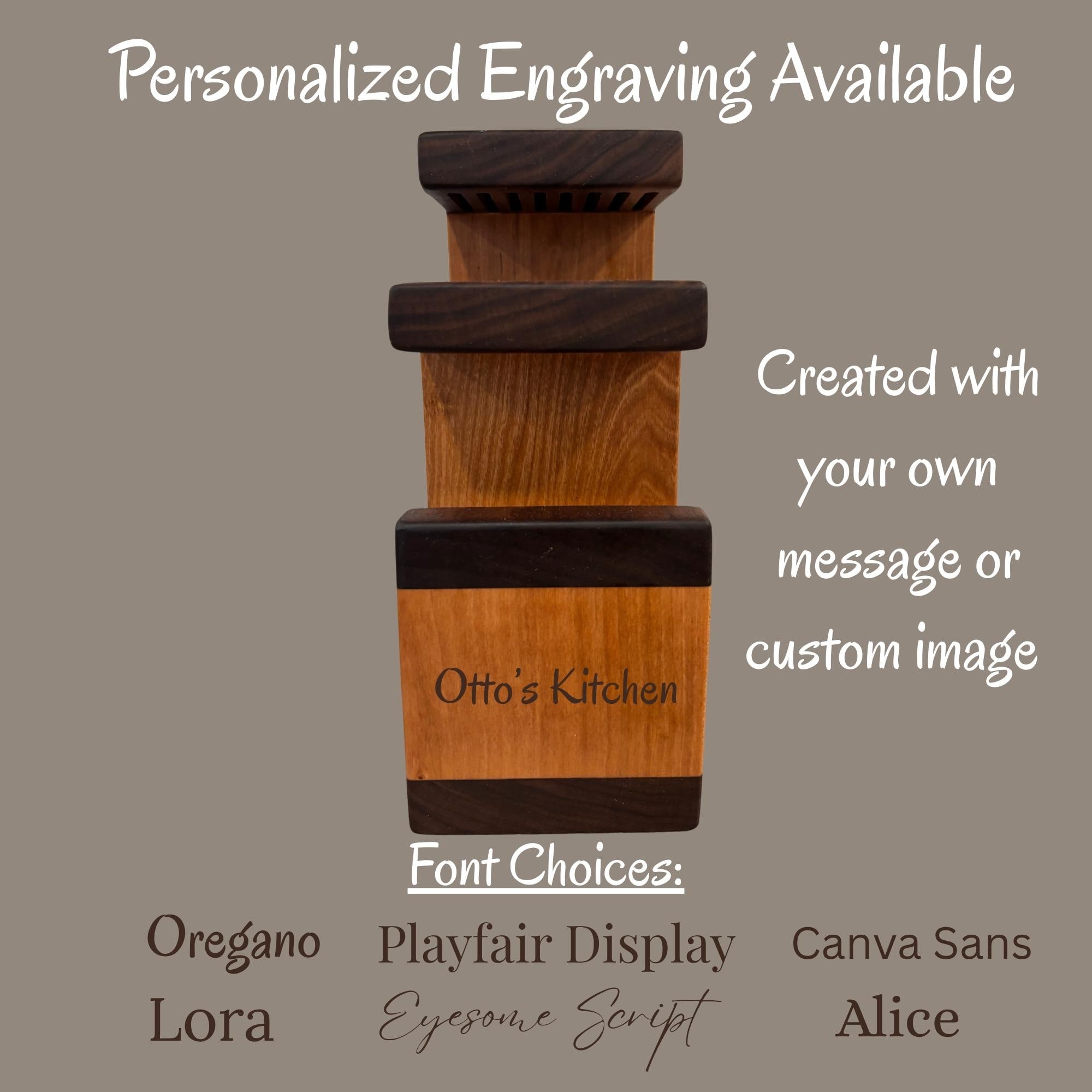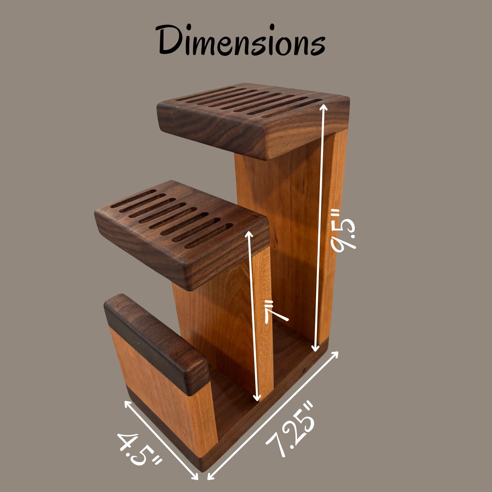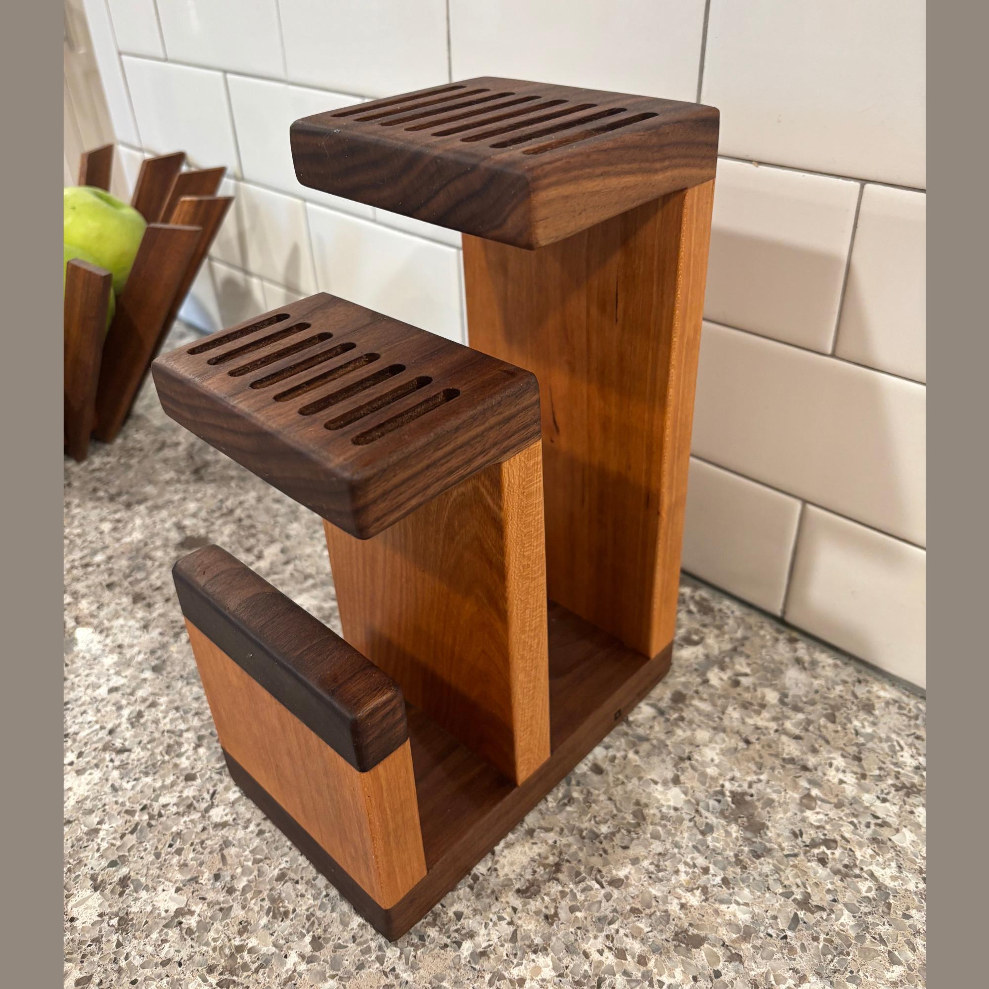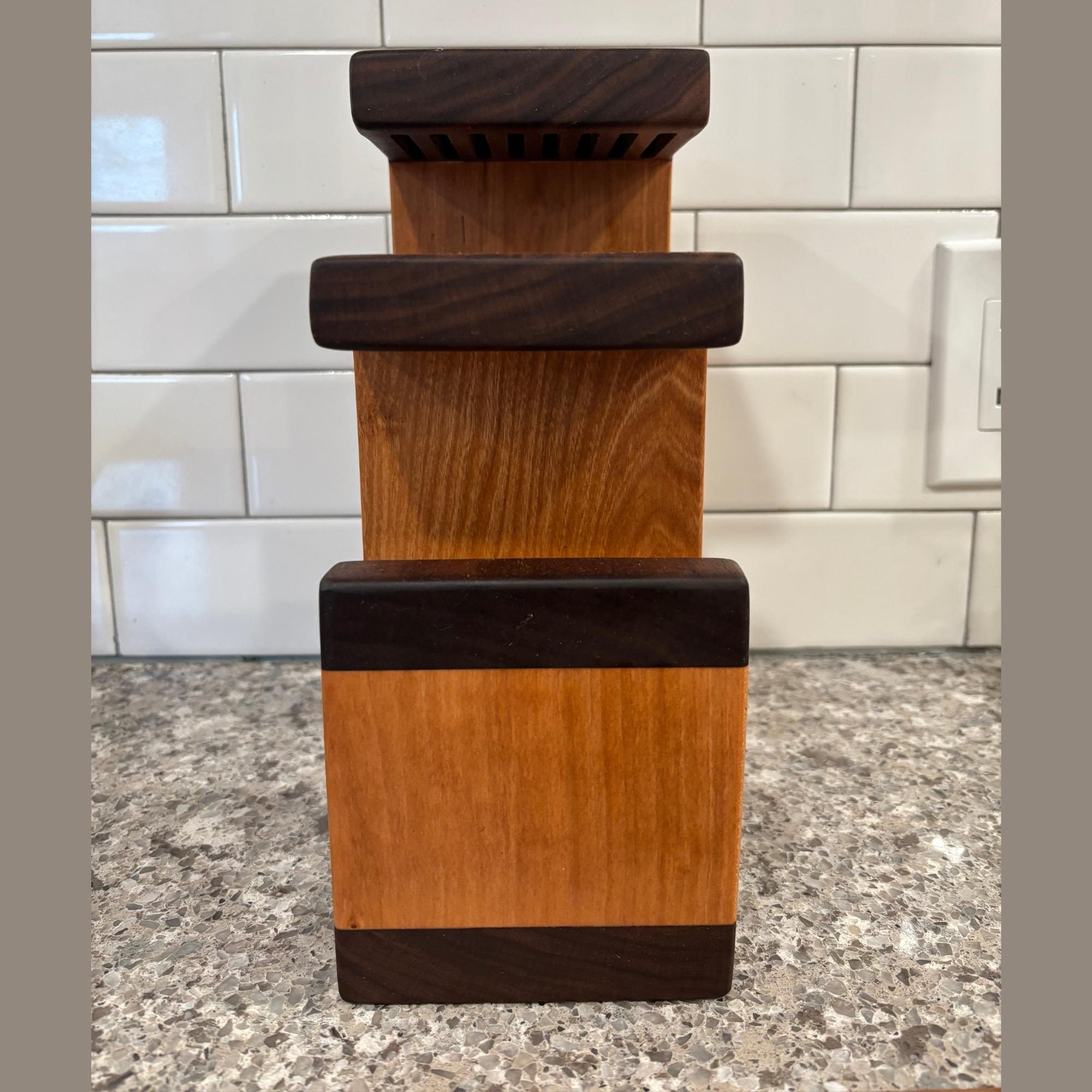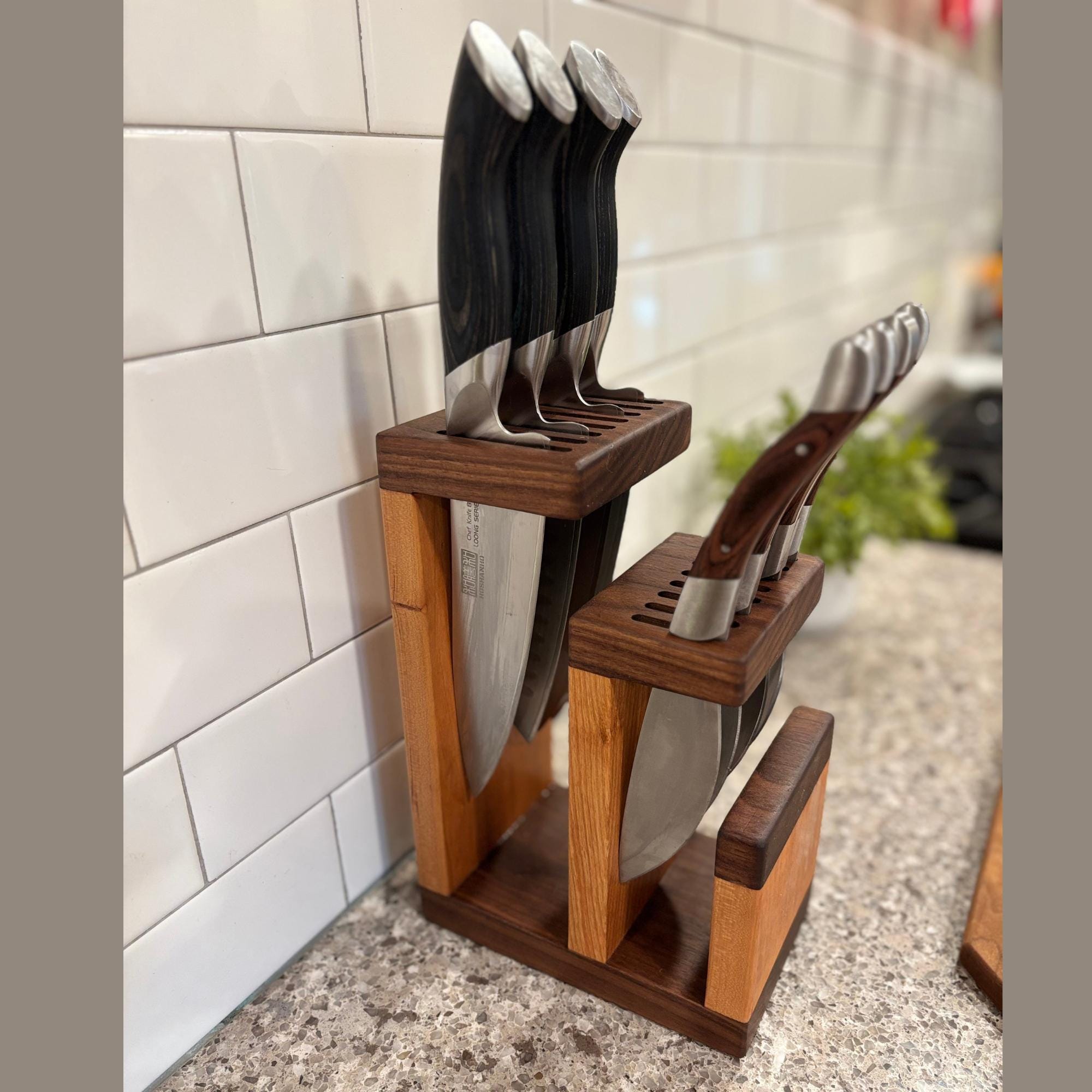 Give your kitchen knives a stylish and functional home with our compact and beautiful two tiered open style knife block. Handcrafted from high-quality hardwoods, this block features 16 knife slots and can accommodate 8+ knives of various sizes, ensuring they stay organized and easily accessible. Imagine the joy your knives would feel having a dedicated spot to rest in between kitchen tasks. The top area has 8 slots each 2.5" X 1/4", spaced 1/4" apart, designed for a variety of chef's knives. The lower area also has 8 slots, each 1 5/8" X 1/4", spaced 1/4" apart and is designed for steak knives and smaller paring knives. Treat your knives to the luxury they deserve with this stunning knife block.
