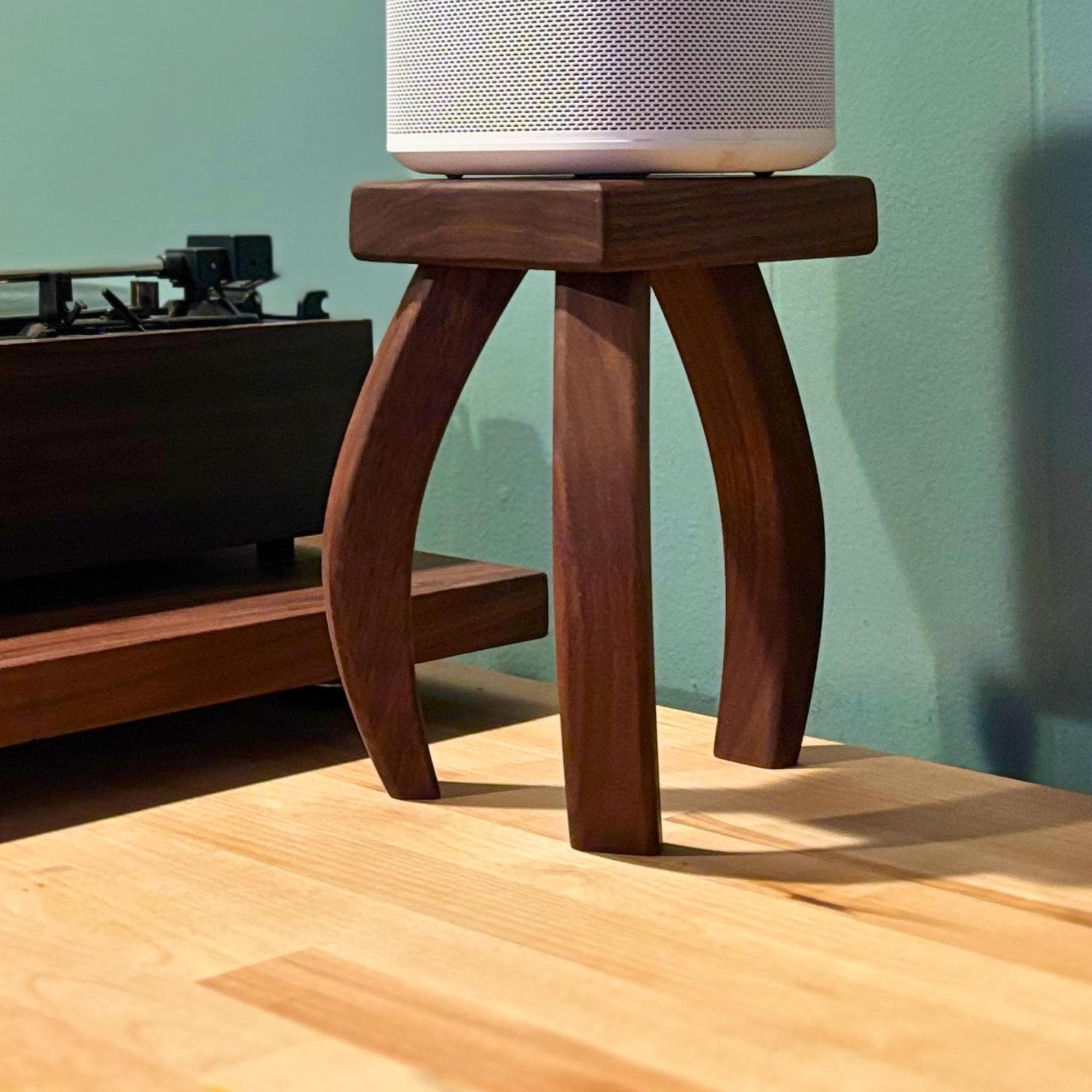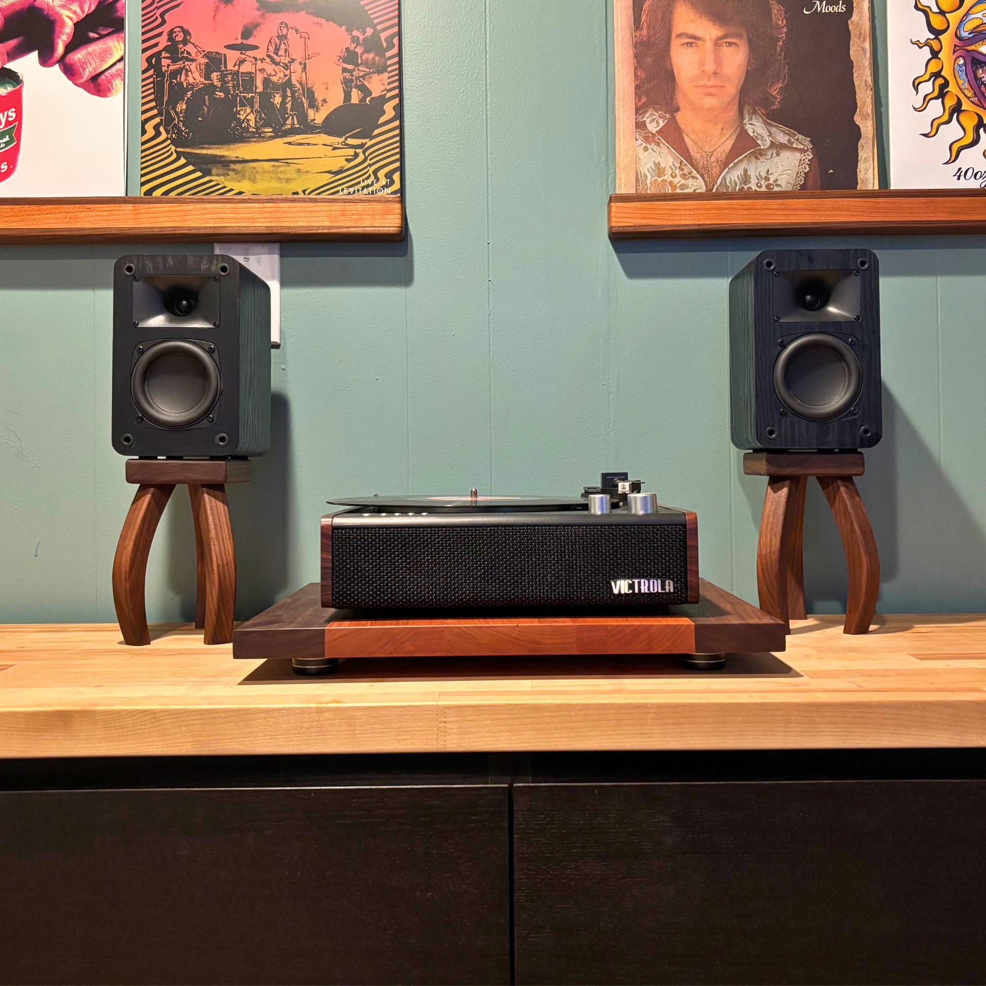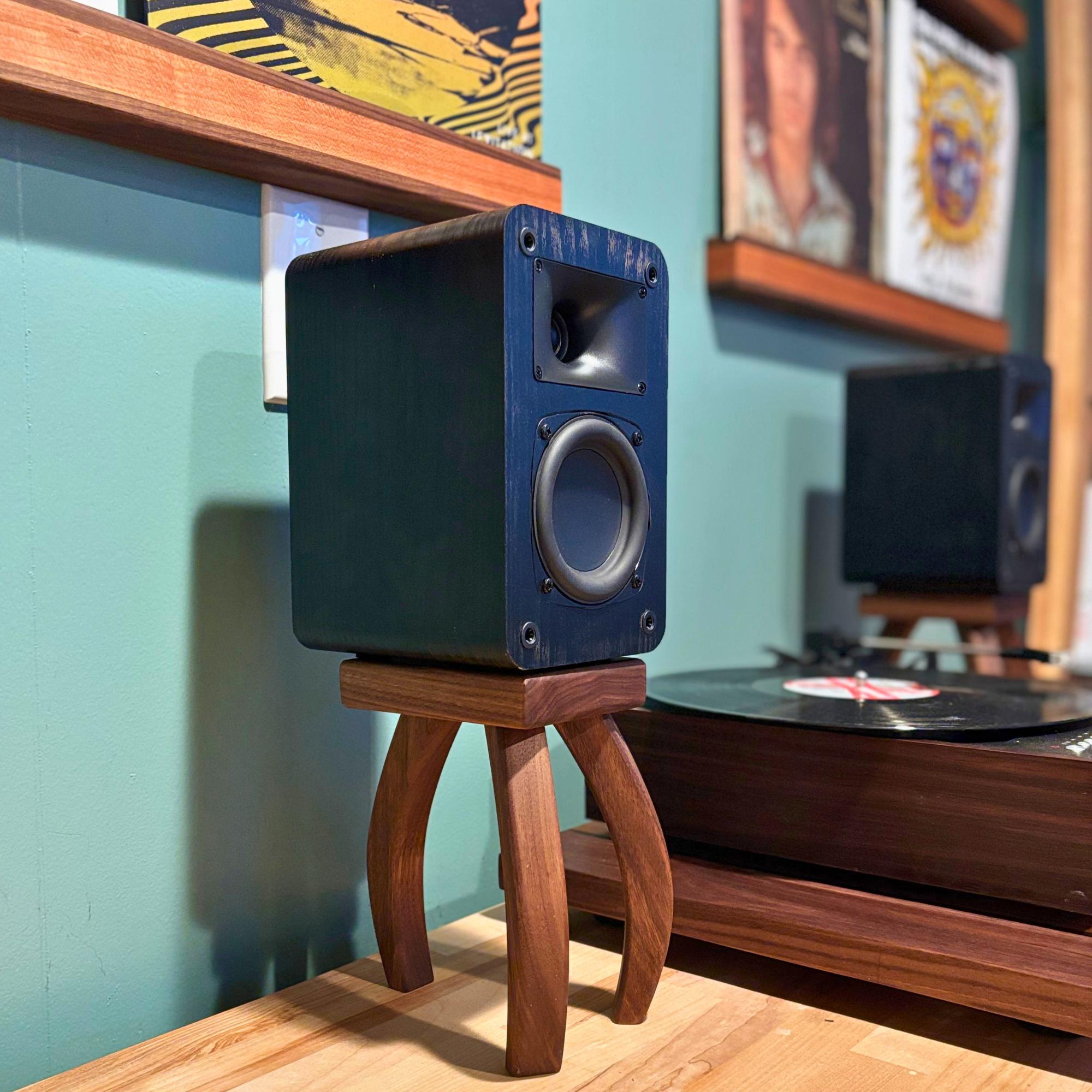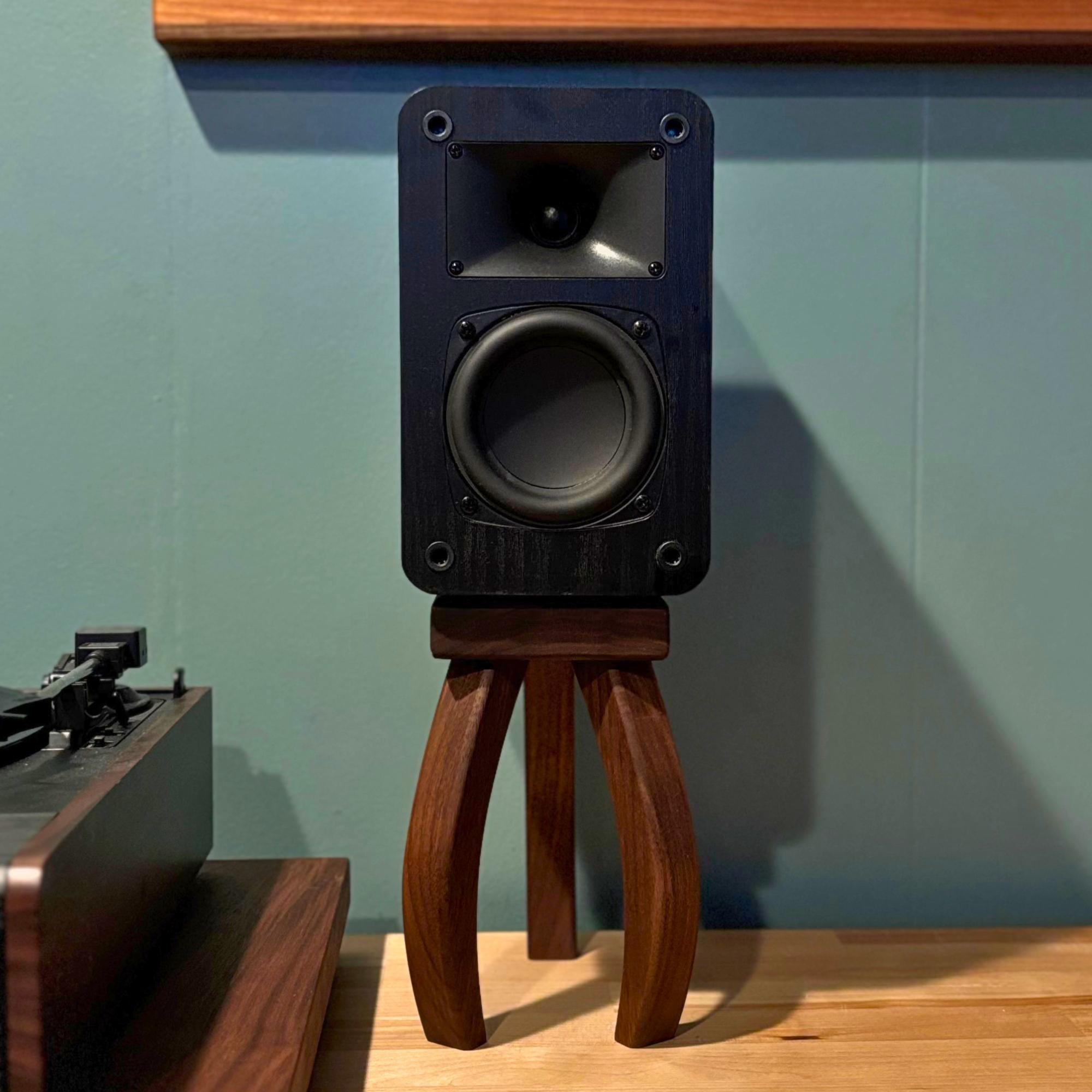 Inspired by H.G. Wells's "War of the Worlds", these mid-century modern design speaker stands will quite literally elevate your listening experience. Your speaker stands should be just as beautiful as any other piece of furniture in your home and these stands deliver. Soft edges and curved lines create a stunning addition to your room. Each piece is handcrafted one at a time, using premium walnut that showcases the rich, natural colors of the wood—no dyes or stains here! Finished with a nourishing oil and wax, these stands not only enhance the beauty of your speakers but also bring a touch of warmth and elegance to your space.
