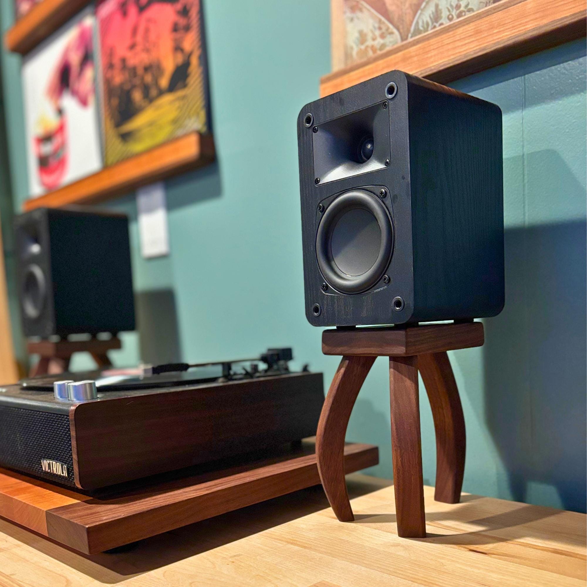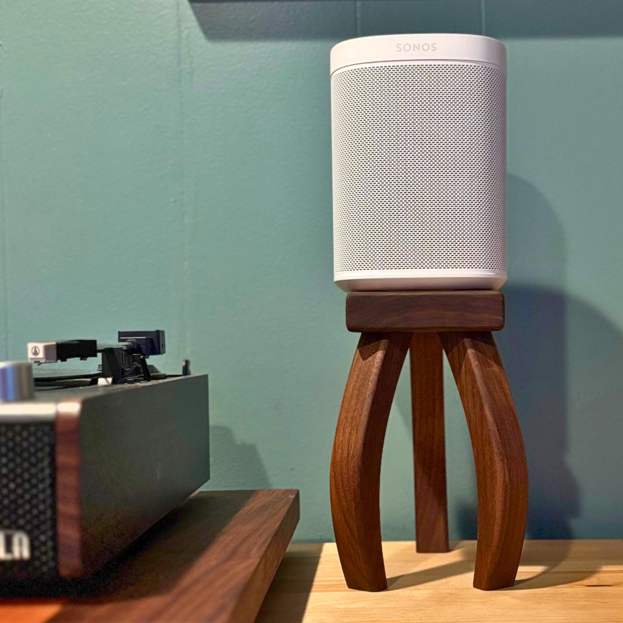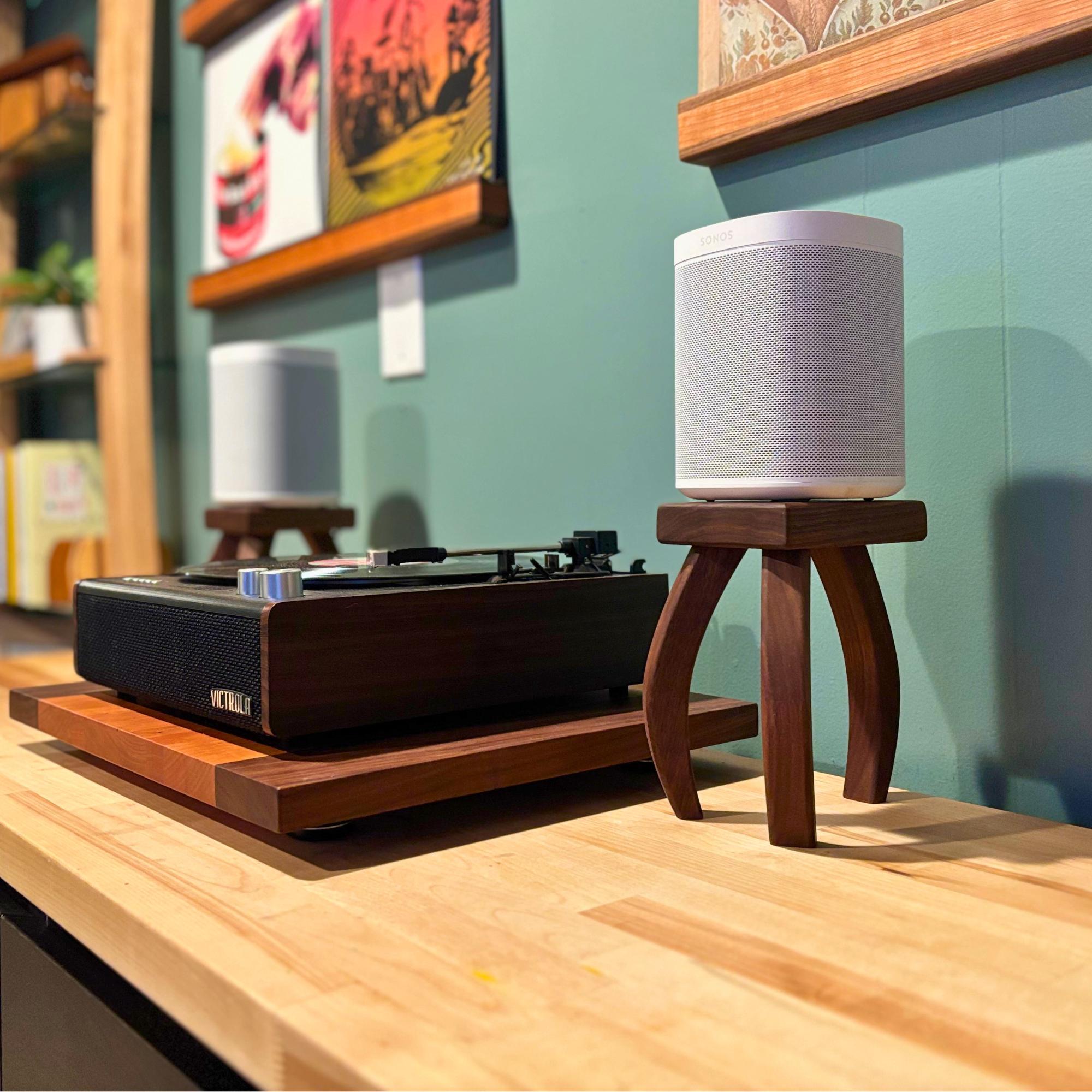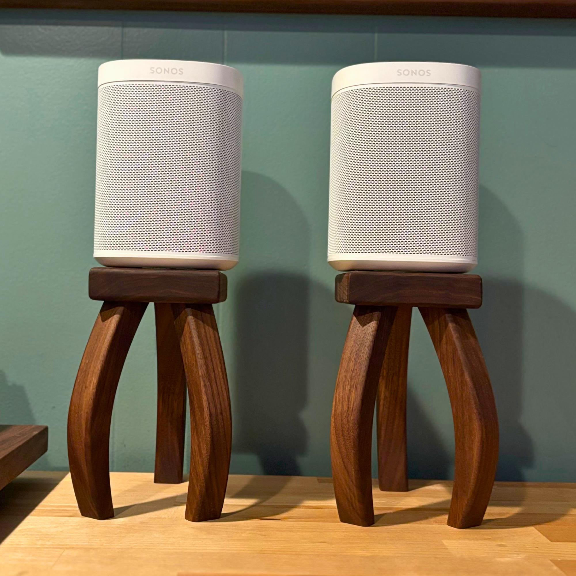 Inspired by H.G. Wells's "War of the Worlds", these mid-century modern design speaker stands will quite literally elevate your listening experience. Your speaker stands should be just as beautiful as any other piece of furniture in your home and these stands deliver. Soft edges and curved lines create a stunning addition to your room. Each piece is handcrafted one at a time, using premium walnut that showcases the rich, natural colors of the wood—no dyes or stains here! Finished with a nourishing oil and wax, these stands not only enhance the beauty of your speakers but also bring a touch of warmth and elegance to your space.